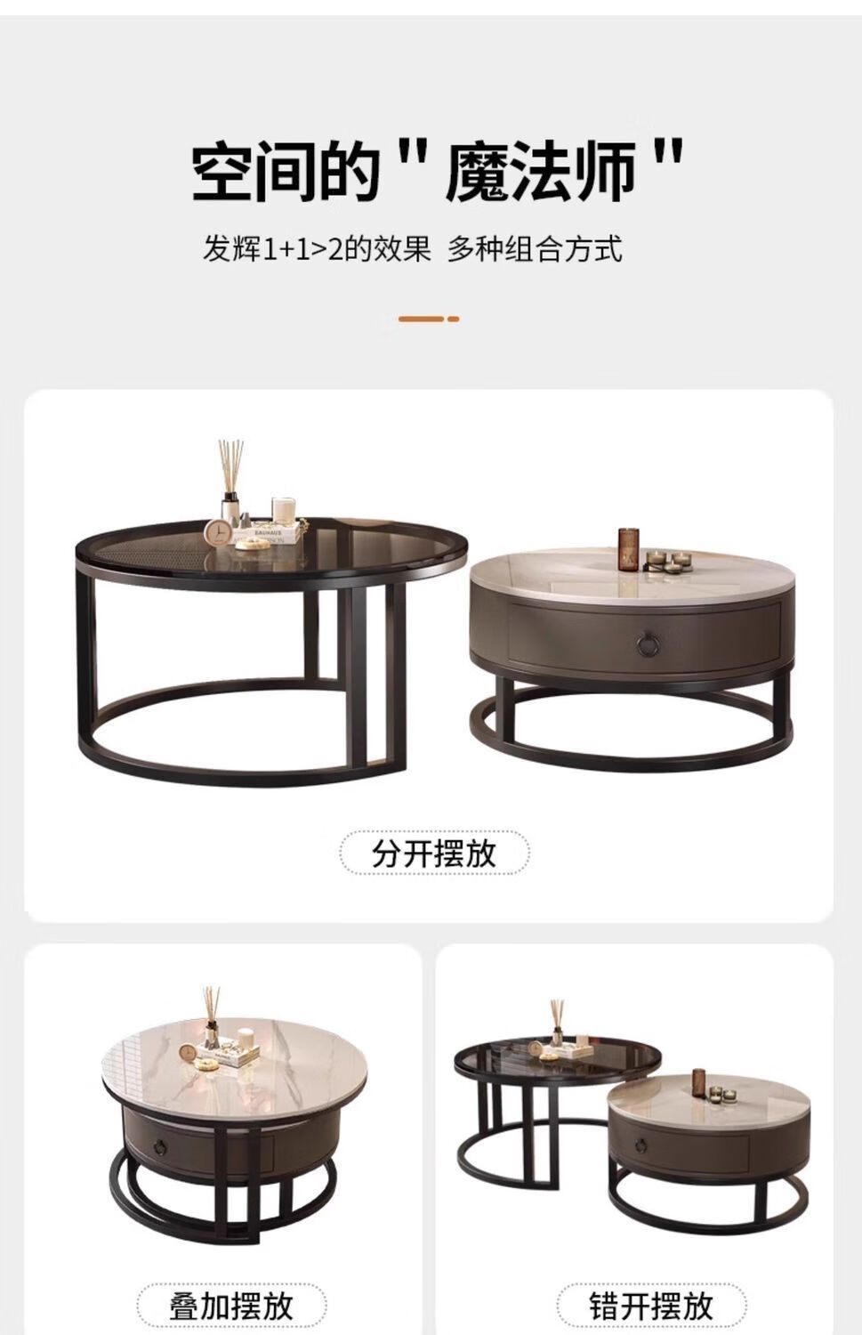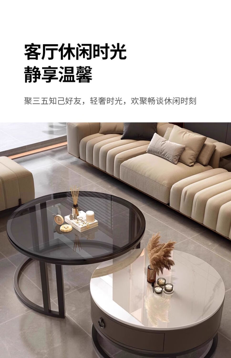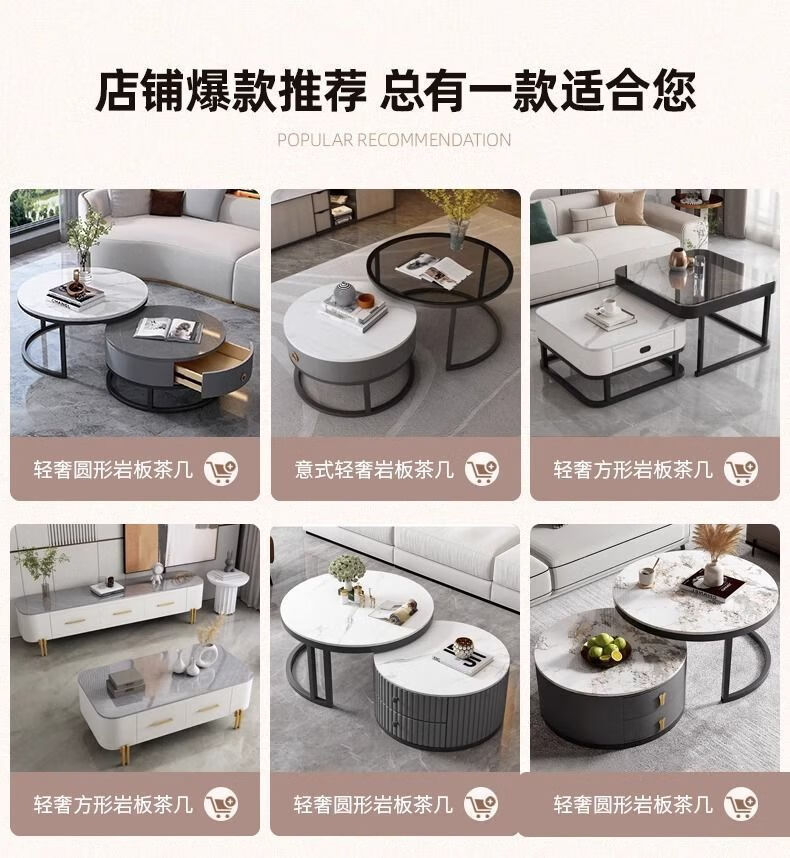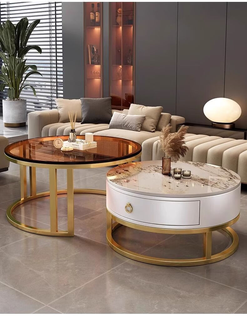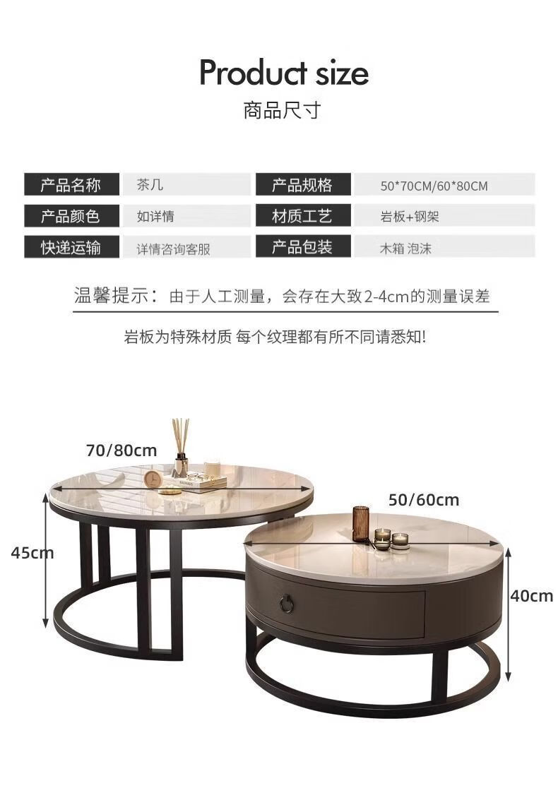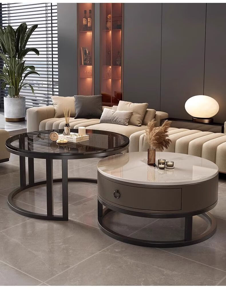 Yusenyi Xinjiang free shipping slate living room home 2025 new small apartment round glass light luxury simple combination coffee table black frame gray cabinet 50 gloss snow mountain white + 70 gloss snow round combination coffee table 卄9mm high gloss slate tabletop