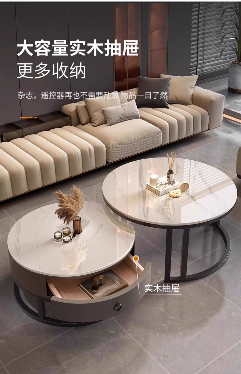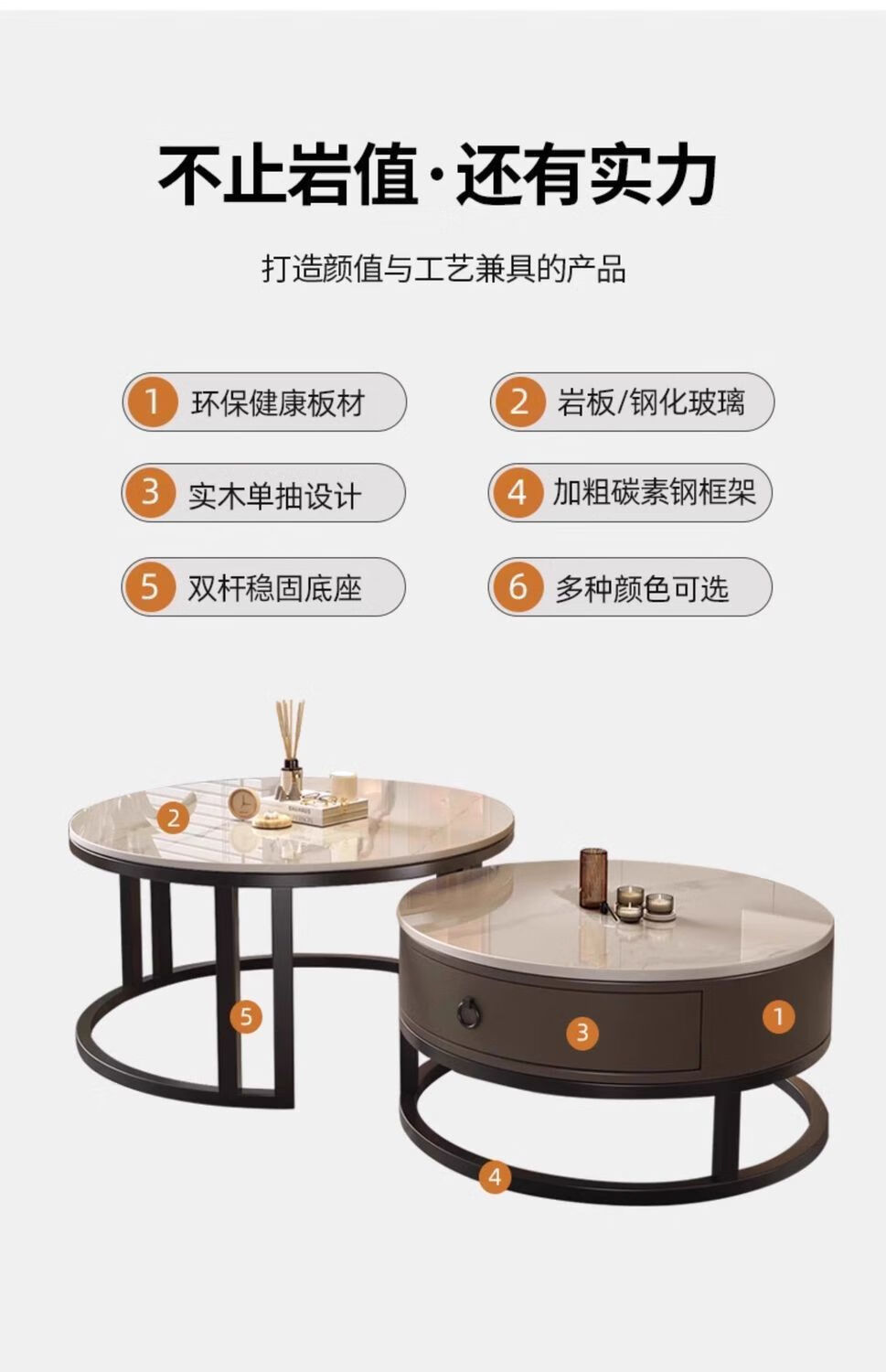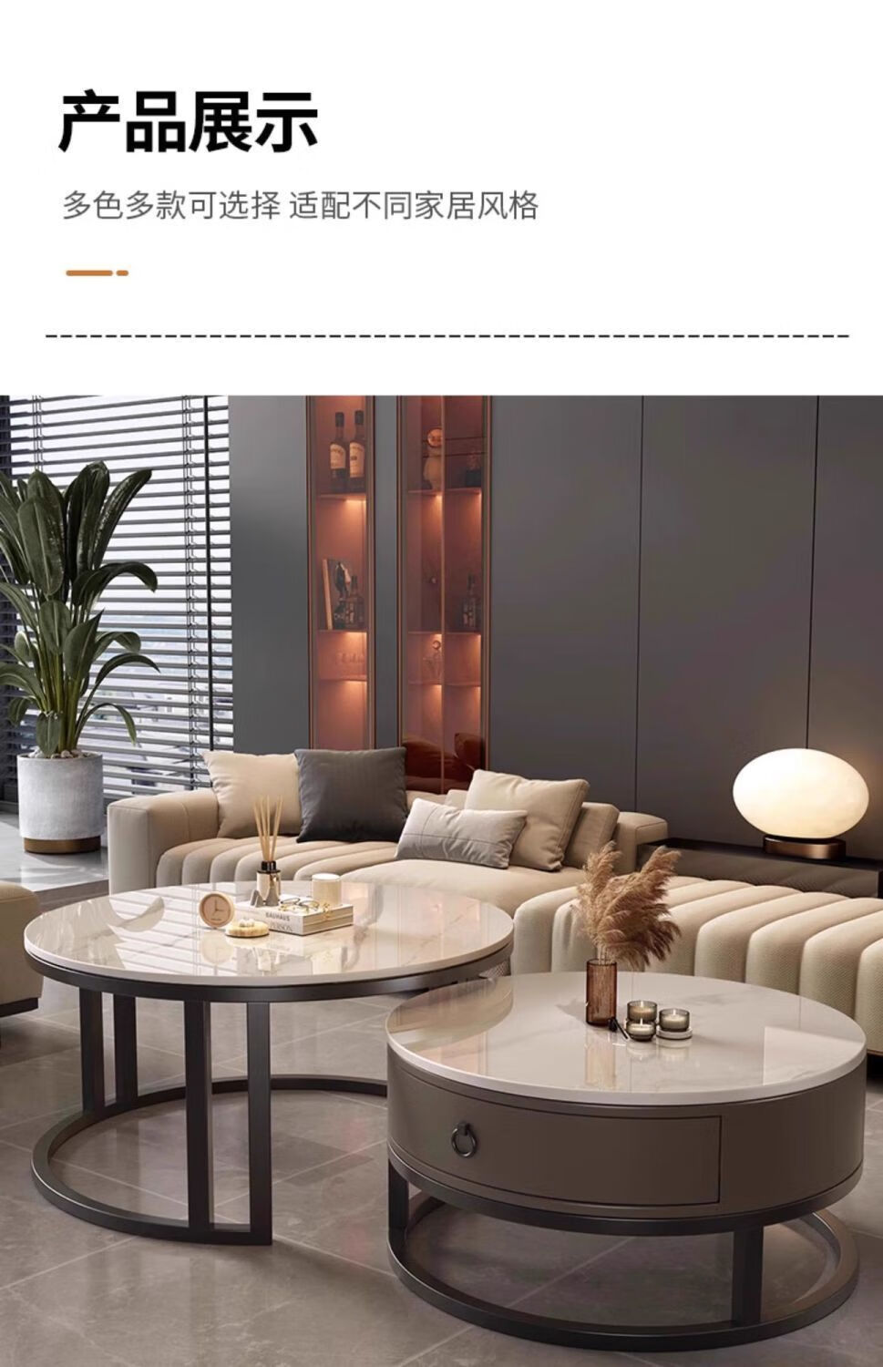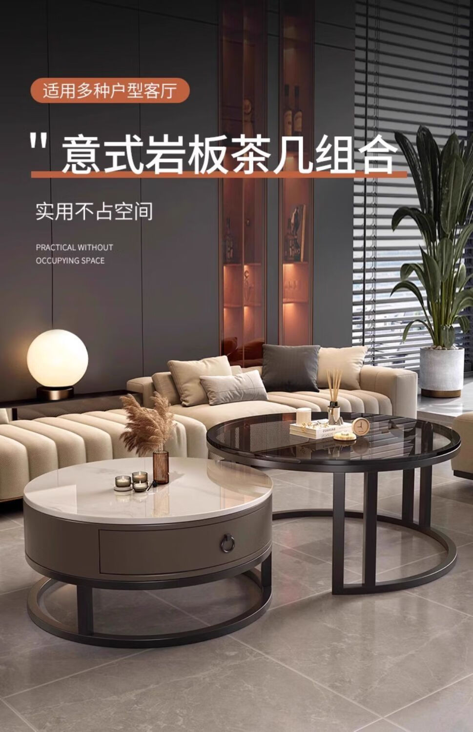 Yusenyi Xinjiang free shipping slate living room home 2025 new small apartment round glass light luxury simple combination coffee table black frame gray cabinet 50 gloss snow mountain white + 70 gloss snow round combination coffee table 卄9mm high gloss slate tabletop