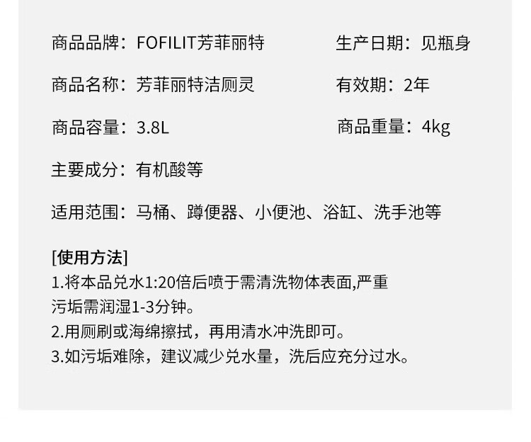 Fangfeilite Toilet Cleaner Toilet Cleaner Removes Yellow Scale and Urinary Alkali Dissolving Liquid Large Barrel 3.8L*4 Barrels