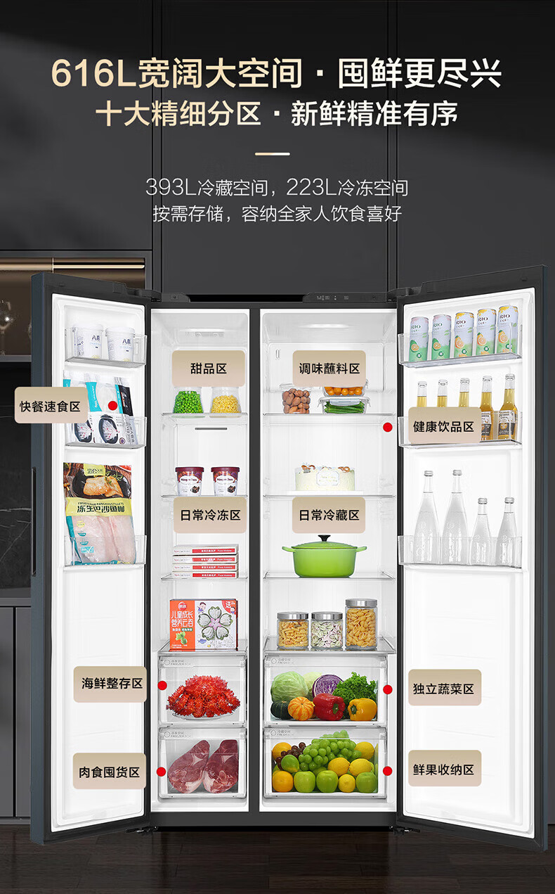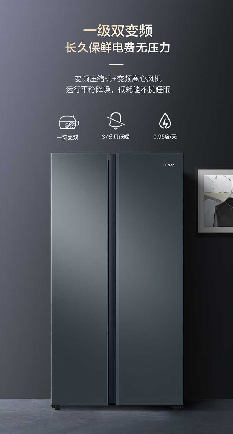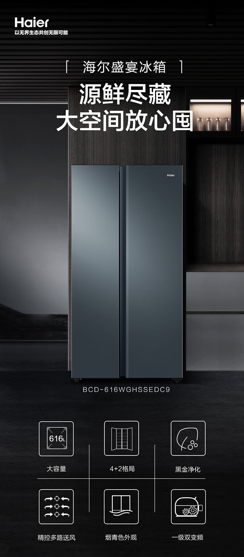 Haier refrigerator double door 616 liter large capacity refrigerator household side-by-side refrigerator first-class energy efficiency variable frequency large capacity ultra-thin household refrigerator air-cooled and frost-free black gold purification + free package installation BCD-616WGHSSEDC9
