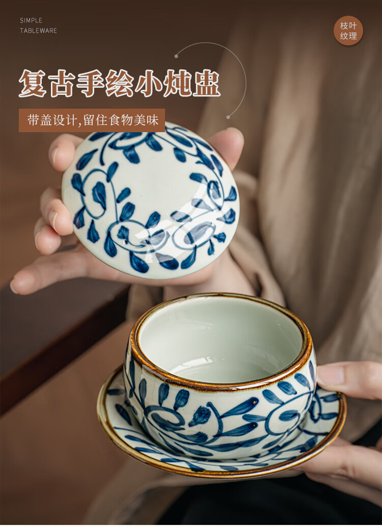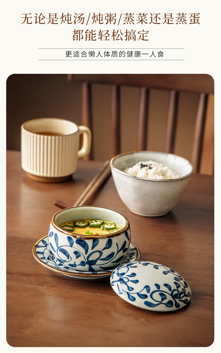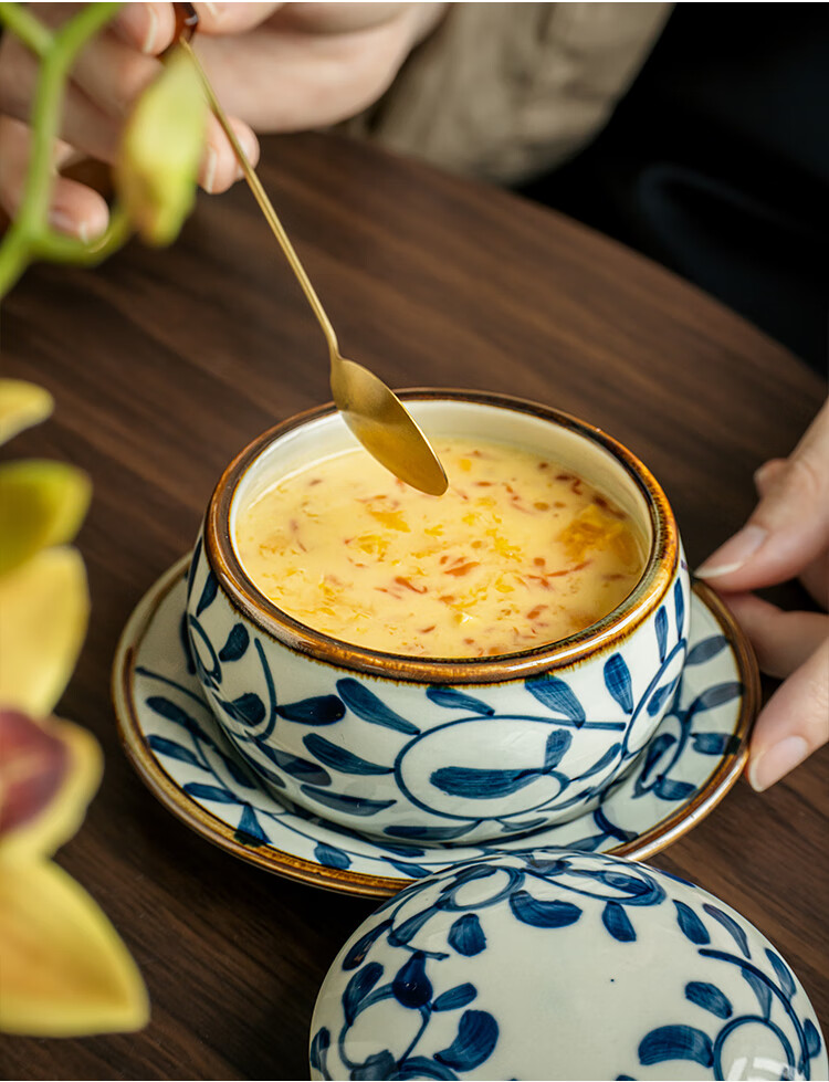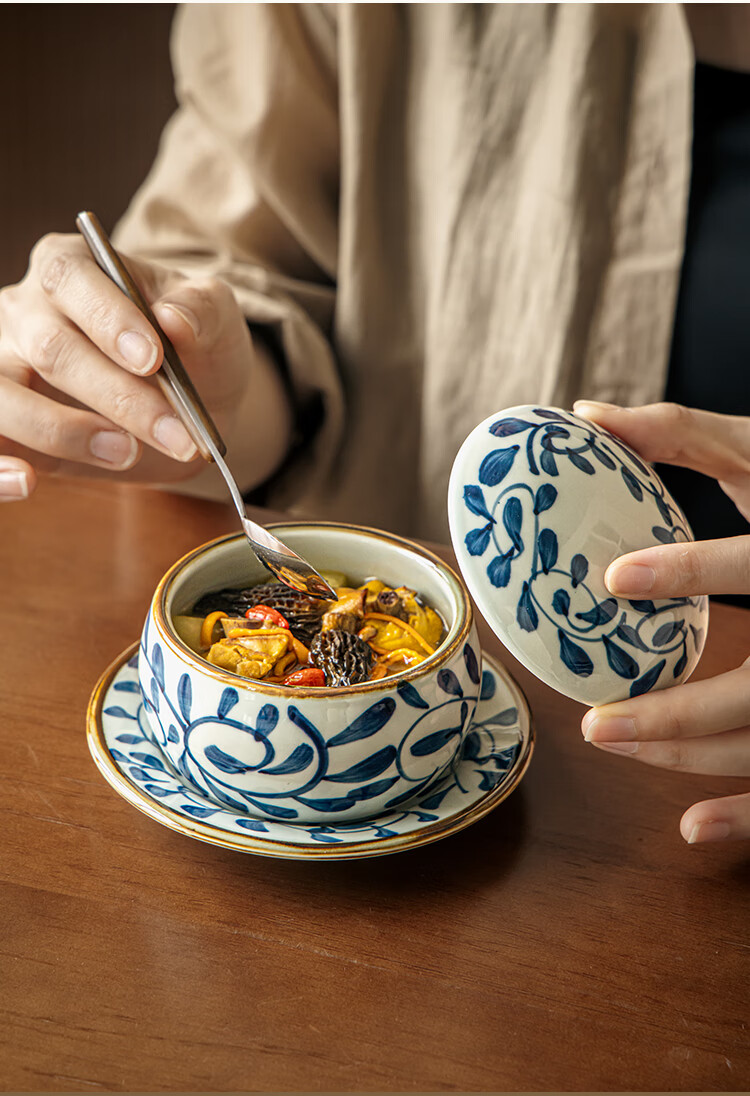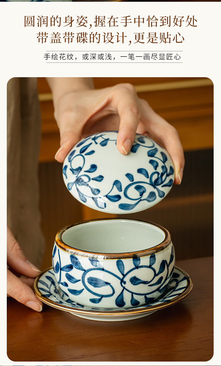 Youcci Blue Gou Teng exquisite hand-painted small stew pot ceramic soup cup with lid Japanese steamed egg cup special bird's nest bowl for one person (2 pieces) 3.5-inch small stew pot - Blue Gou Teng