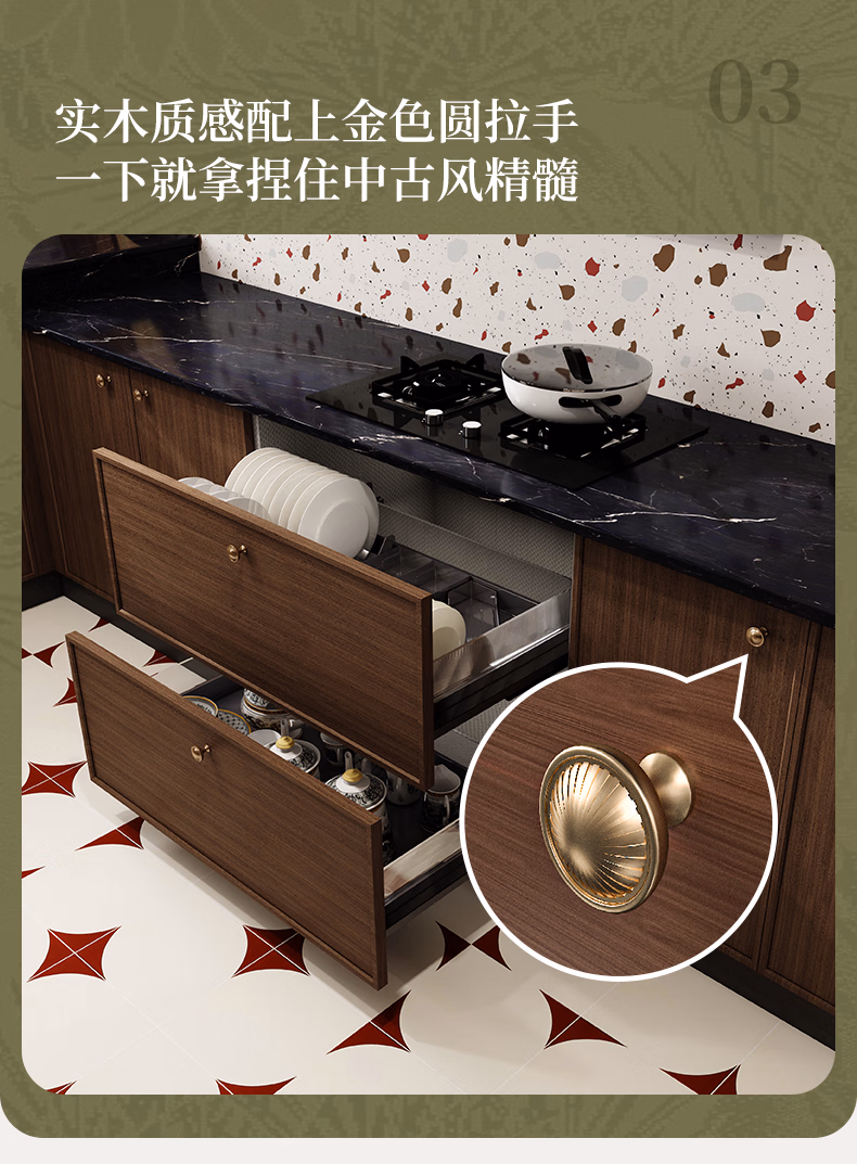 Sophia cabinet customization Medieval style retro kitchen decoration kitchen cabinet cupboard integrated quartz stone countertop stove cabinet cabinet custom gold