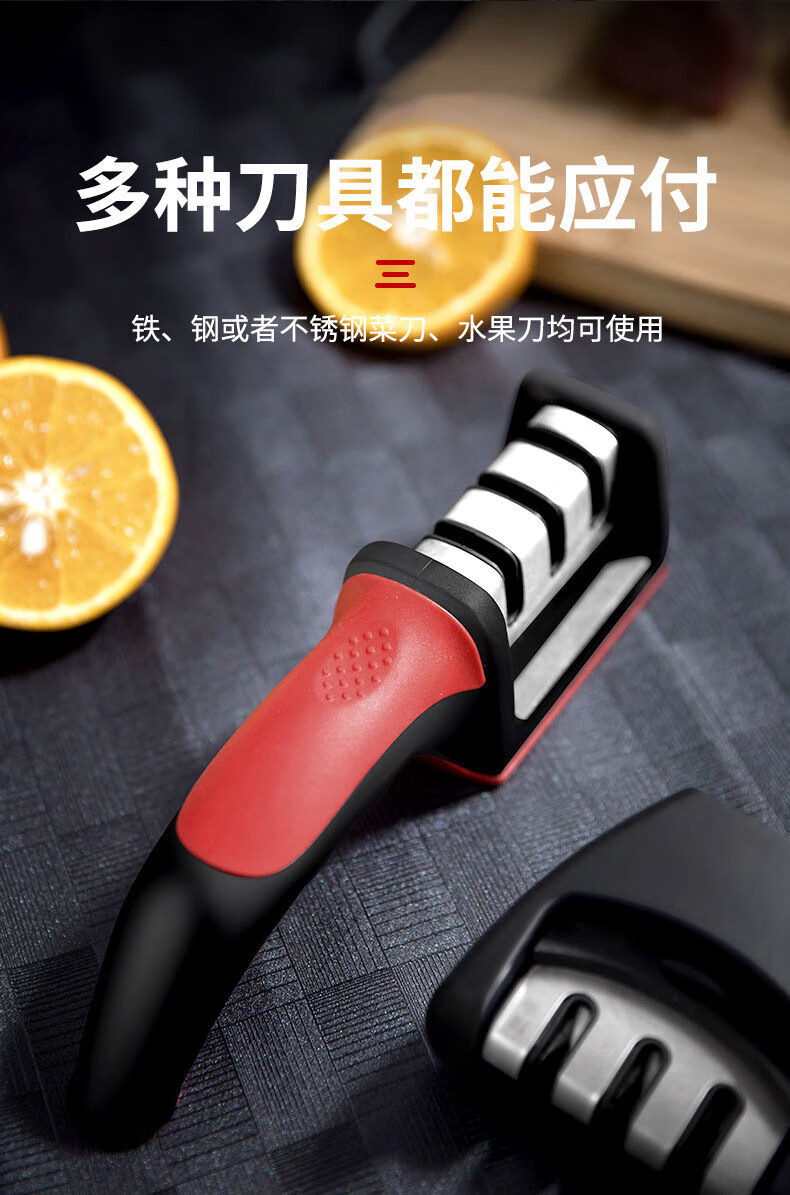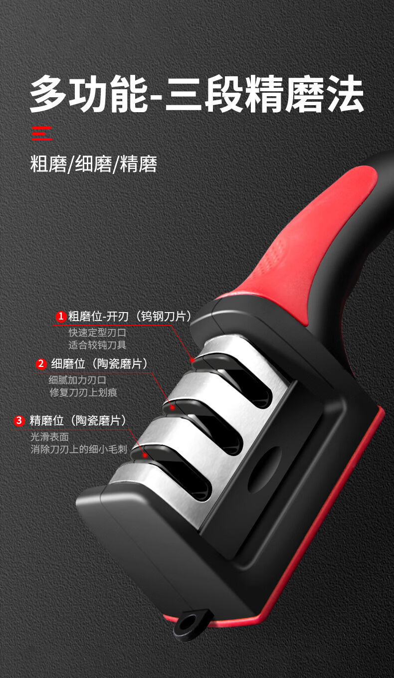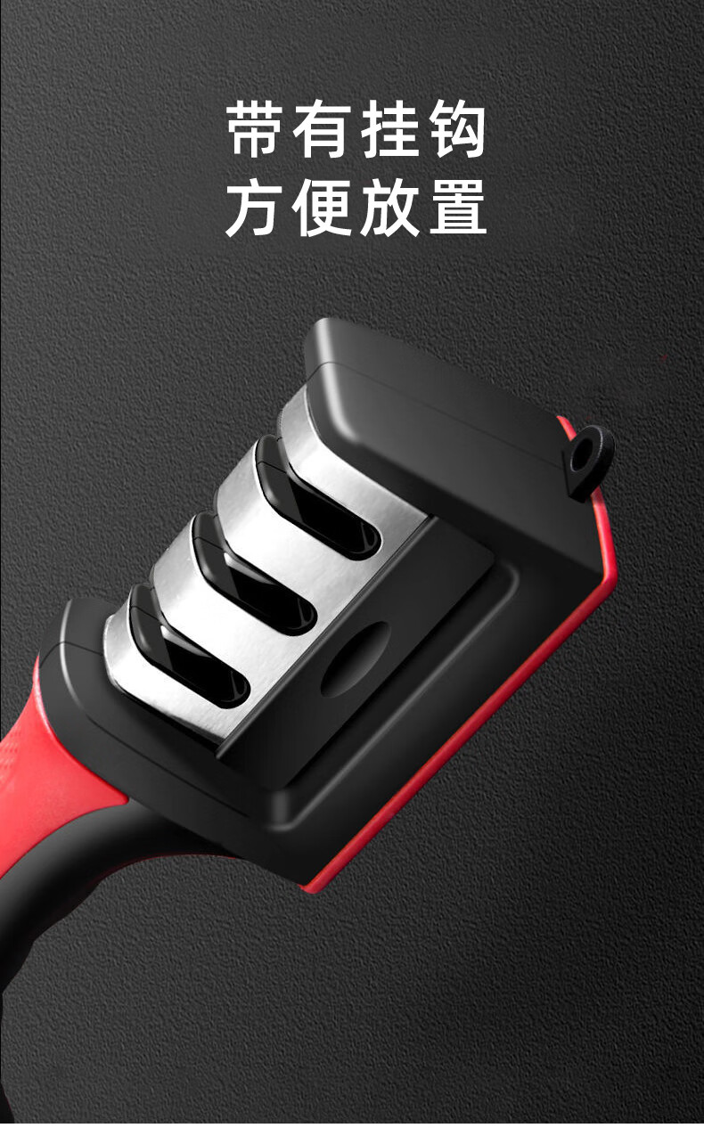 The household quick knife sharpener is easy to use and can be hung with a tail hook. It is a three-stage knife sharpener, a multi-function handheld tool for sharpening and shearing.