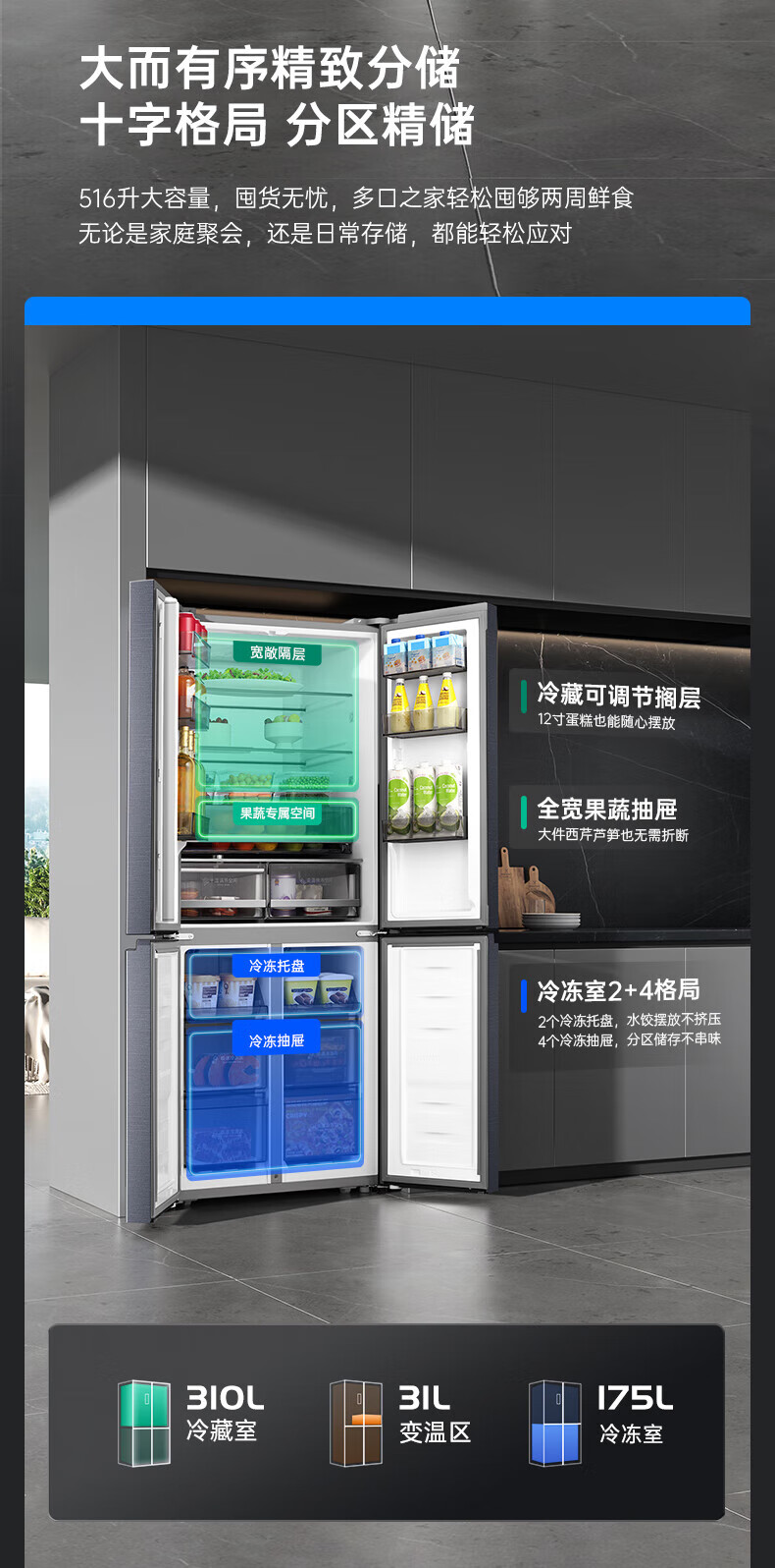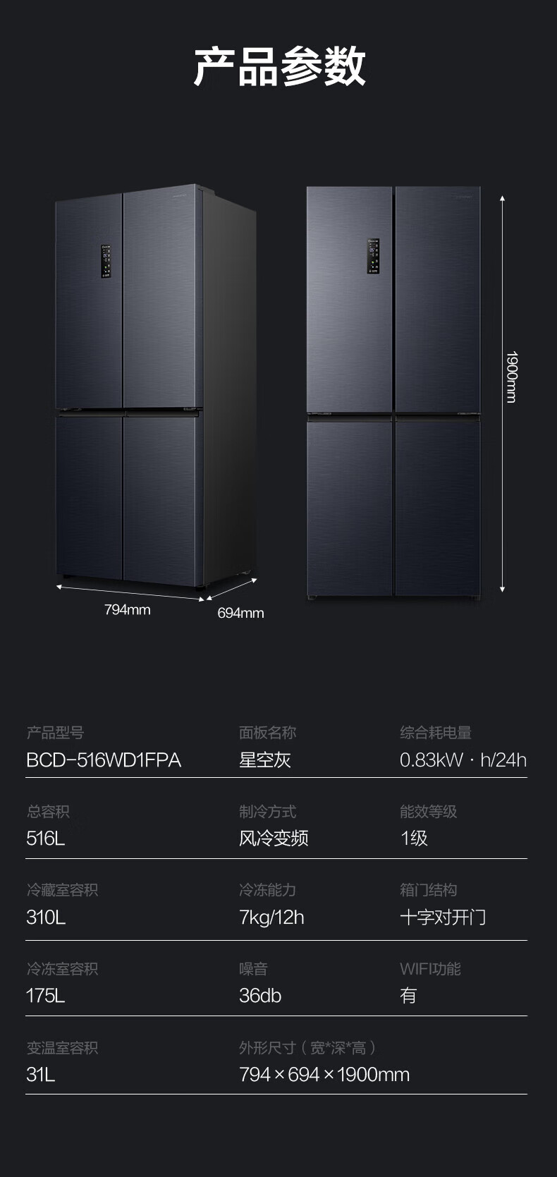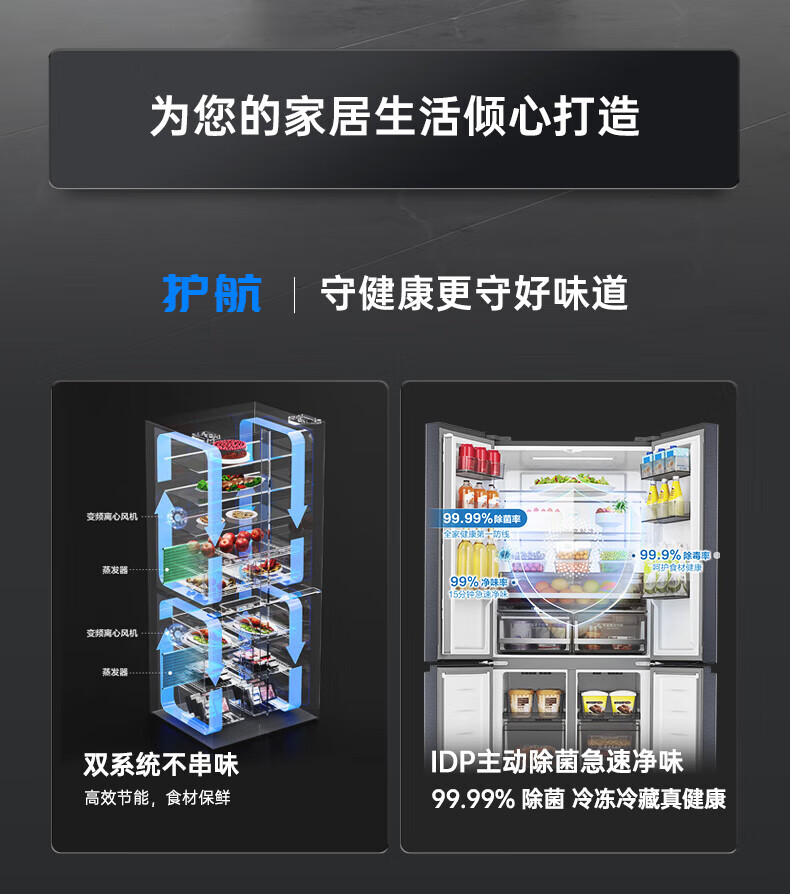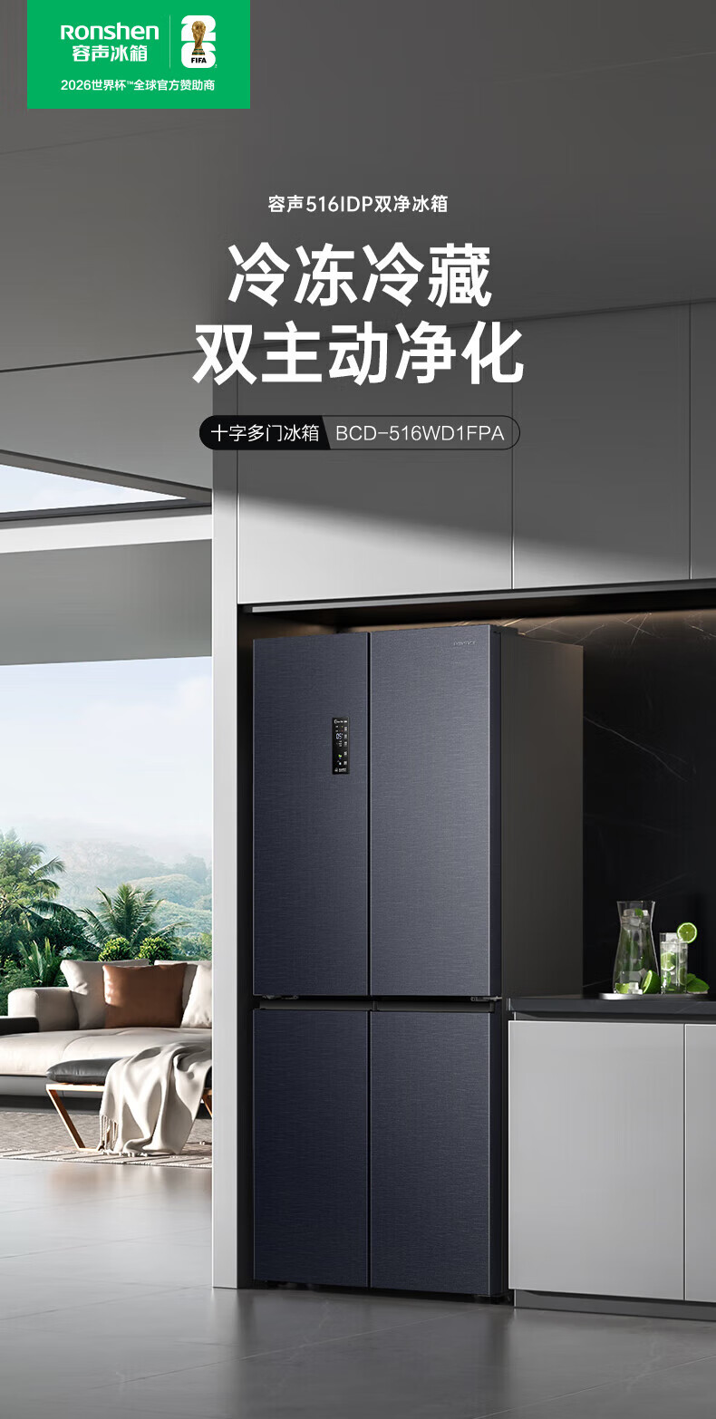 Rongsheng 516 liter double purifier dual system cross four-door refrigerator household first-class energy efficiency air-cooled frost-free large capacity BCD-516WD1FPA gray national subsidy 526 cross model IDP active sterilization and odor independent dual system