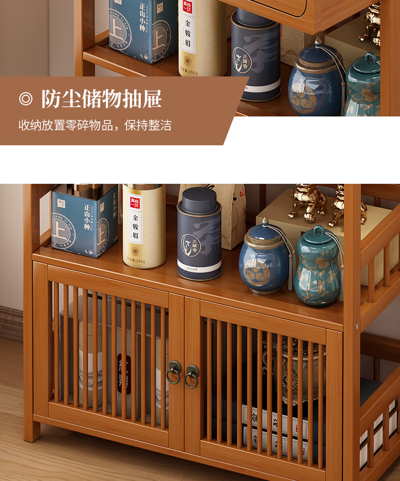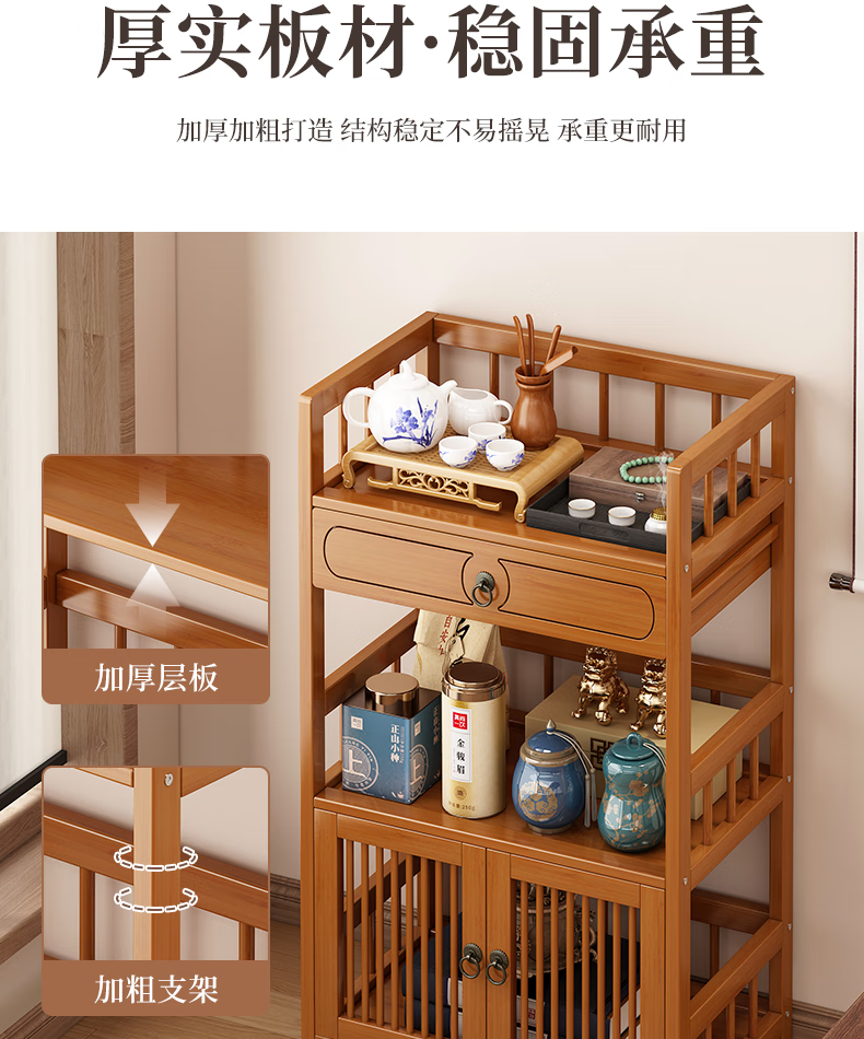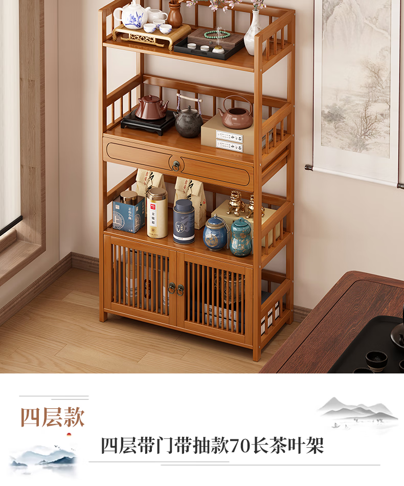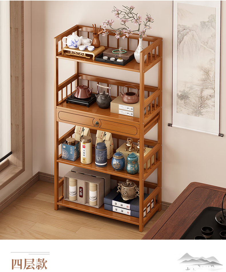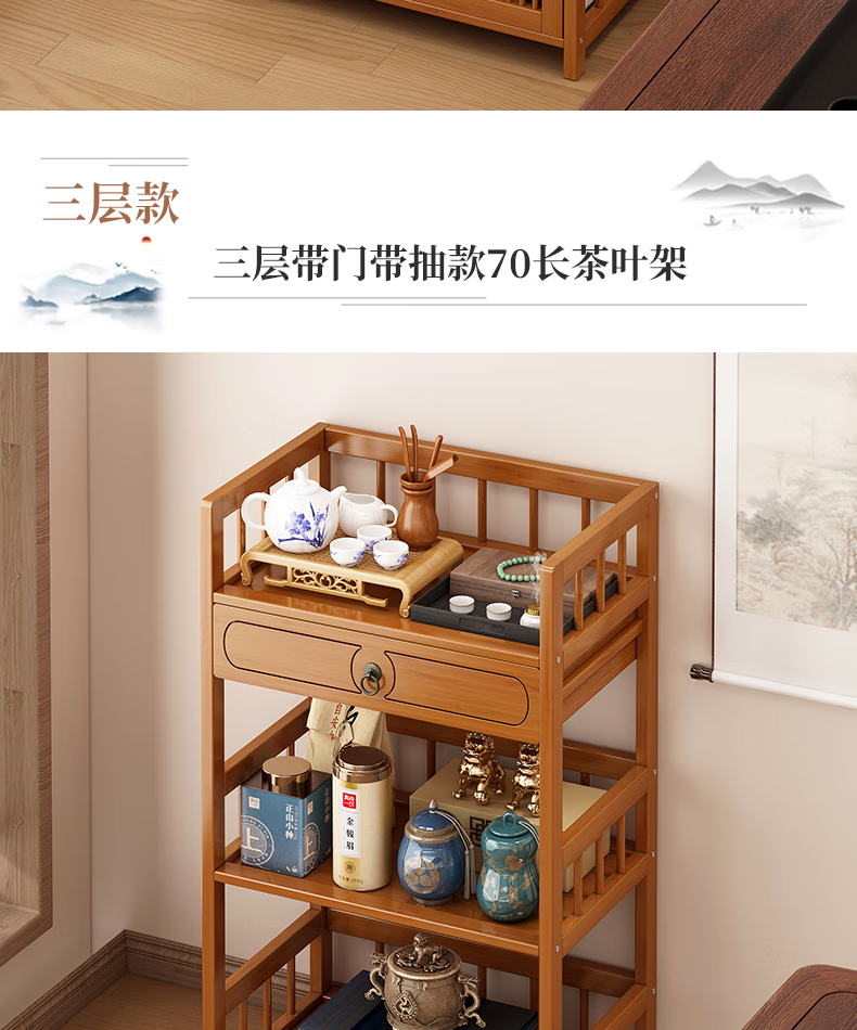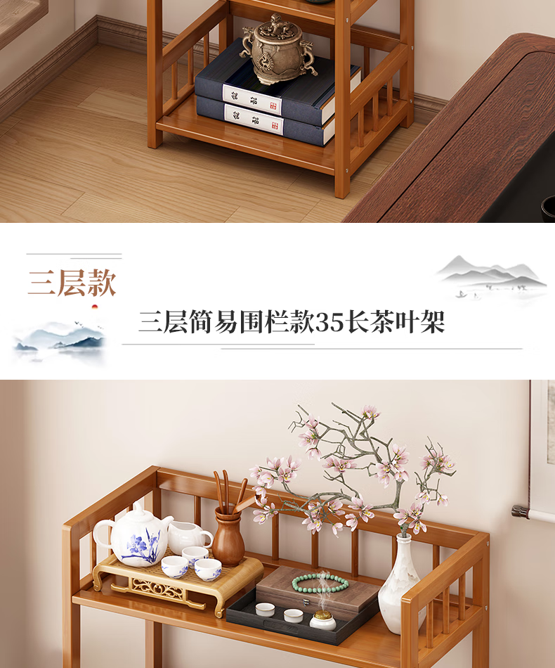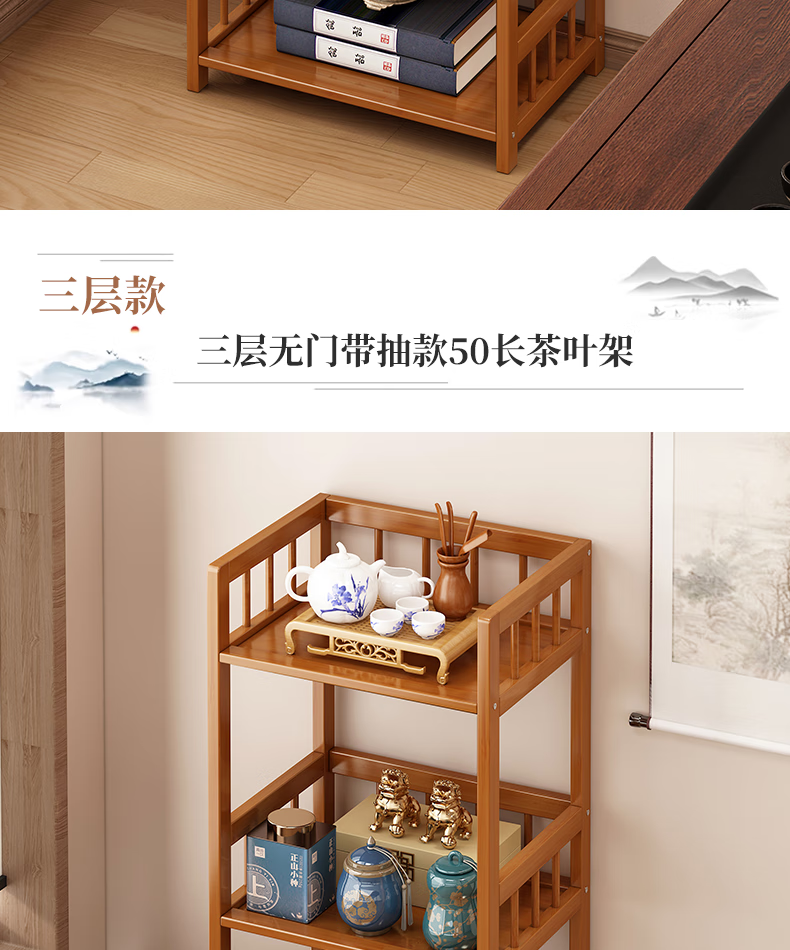 Baizhong tea rack storage rack bamboo non-solid wood tea rack storage cabinet living room small Bogu rack tea room multi-layer tea set rack three-layer simple style 50 long