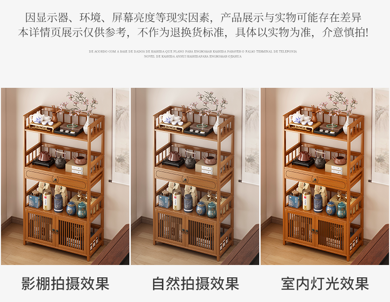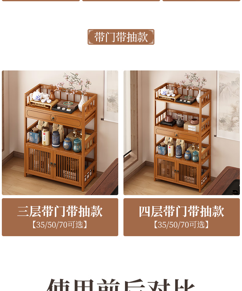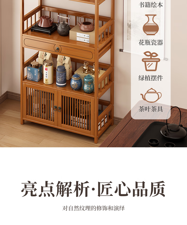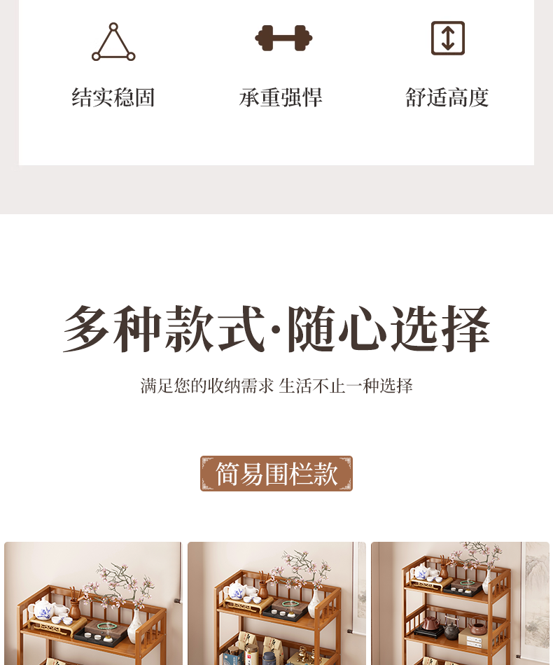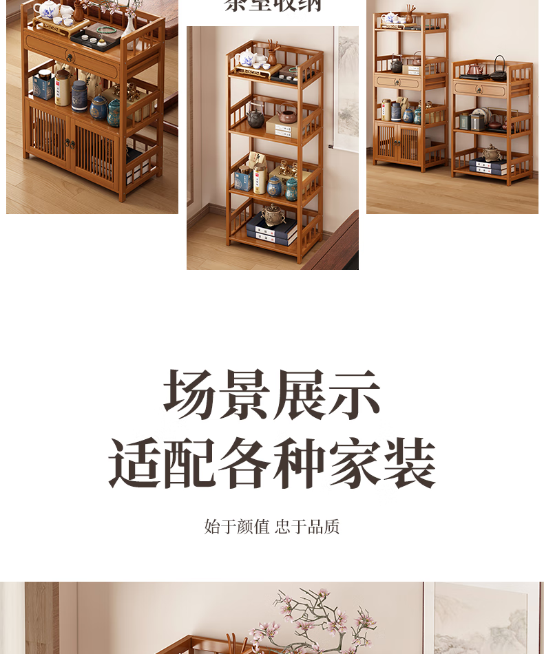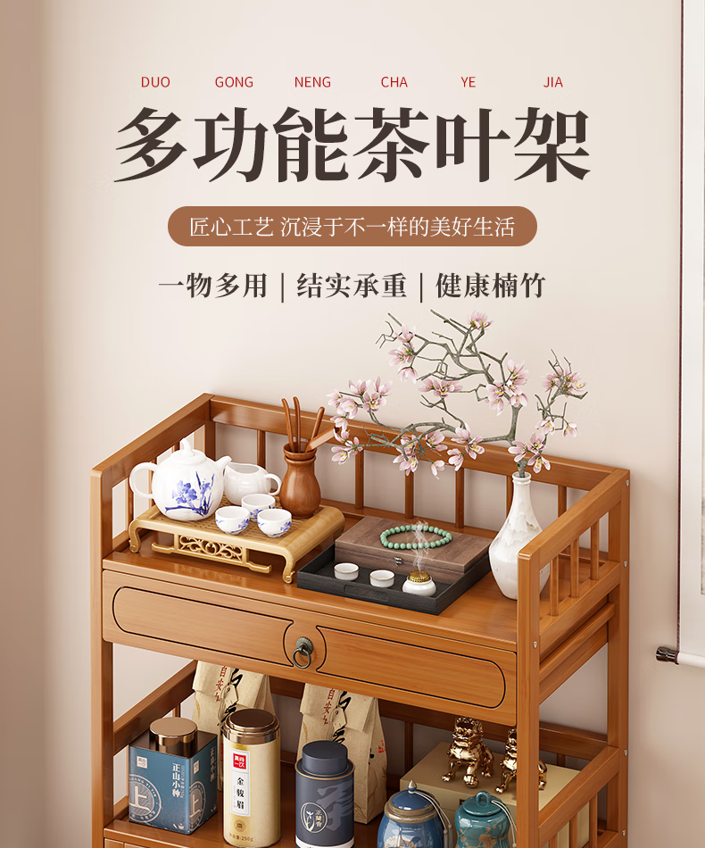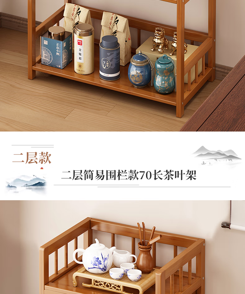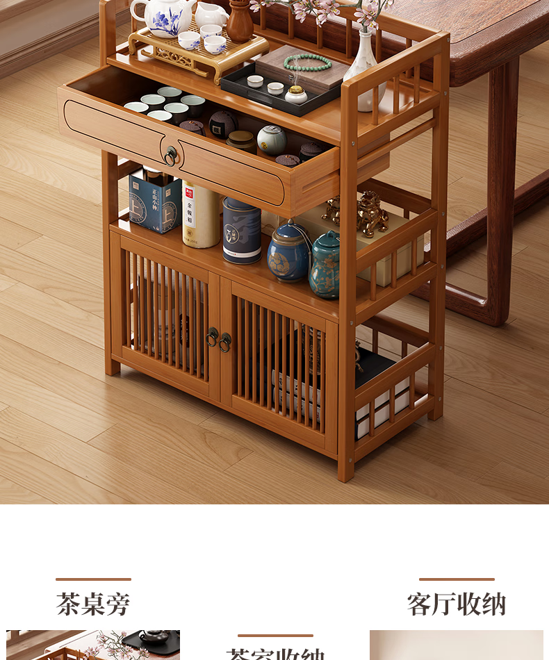 Baizhong tea rack storage rack bamboo non-solid wood tea rack storage cabinet living room small Bogu rack tea room multi-layer tea set rack three-layer simple style 50 long