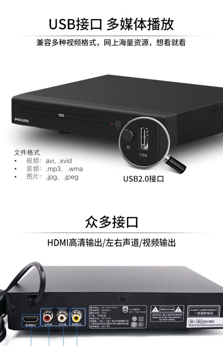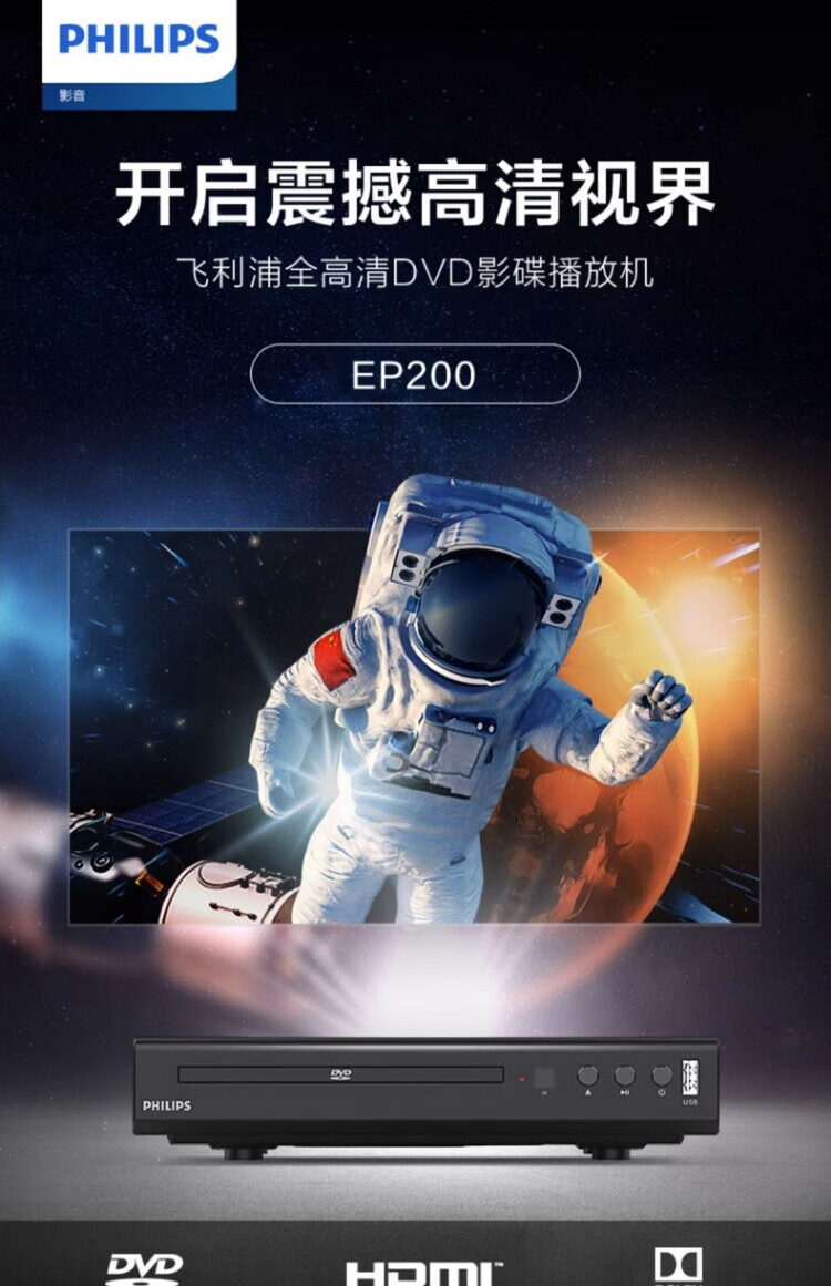 Philips (PHILIPS) TAEP200 powerful disc reading CD VCD DVD player home playback machine non-Blu-ray USB playback high-definition decoder disc audio playback TAEP200+HDMI high-definition cable