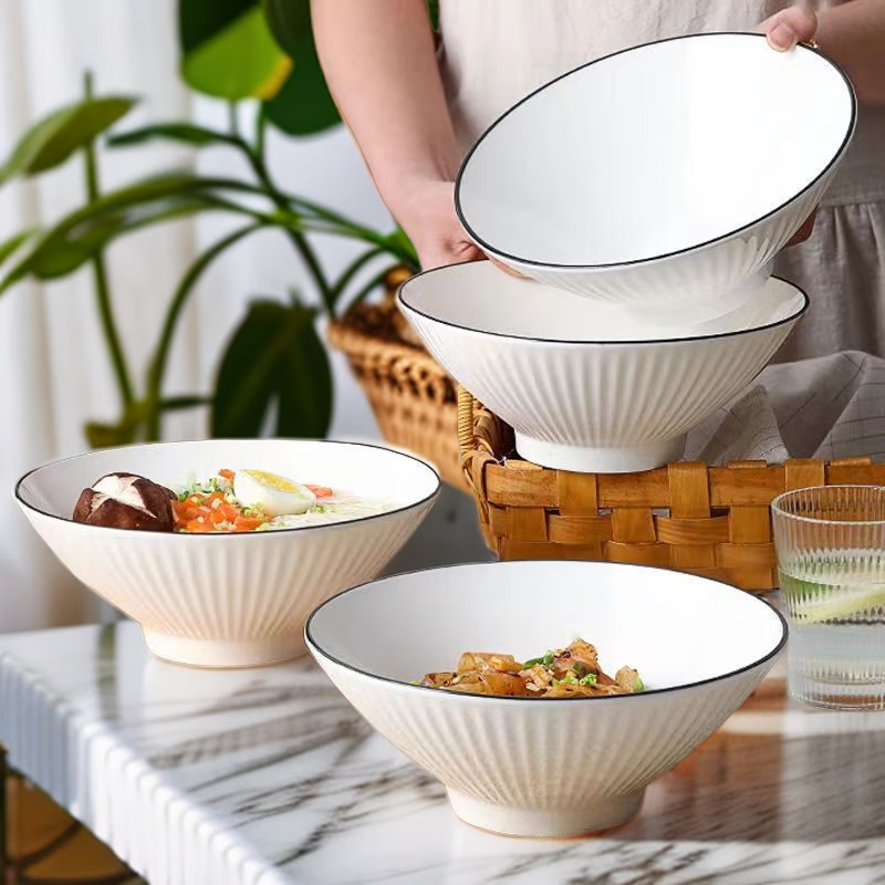 Simple and fashionable soup bowl household large bowl Japanese style large 8-inch vertical pattern bucket hat anti-scalding ceramic tableware instant noodle bowl pure white and black line 8-inch vertical pattern bucket hat bowl 4 pack