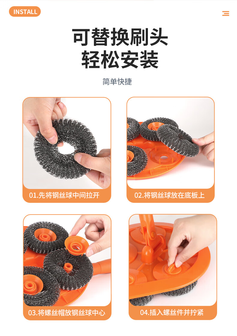 Pool fish pond brush mop wipe floor tiles long handle brush steel ball floor brush to remove moss artifact outdoor cleaning orange steel ball brush + steel wire replacement head 10 pieces