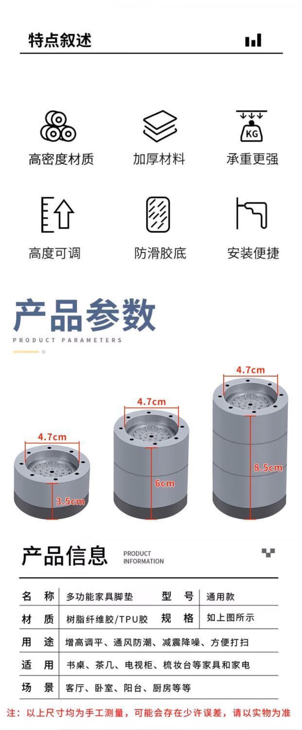 An Junsheng Heightening Pad Table Leg Table High Artifact Washing Machine Coffee Table Base Foot Pad Furniture Sofa Adjustable Anti-Slip Height Gray Round Leg Pad - Height 1.5cm - One Pack