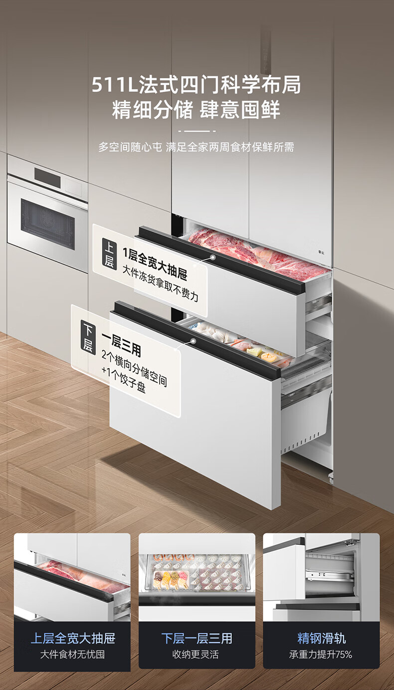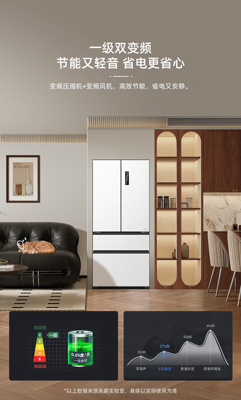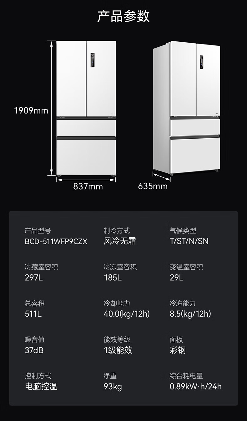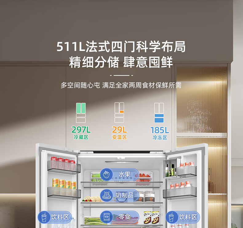 Meiling MNC+ odor upgrade, active sterilization 511L dual system, small footprint, zero built-in refrigerator, French home subsidy BCD-511WFP9CZX511L Snowy White