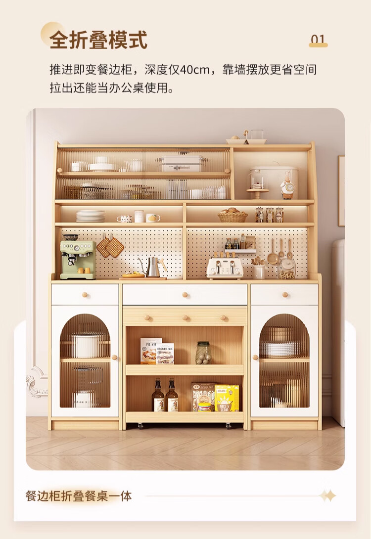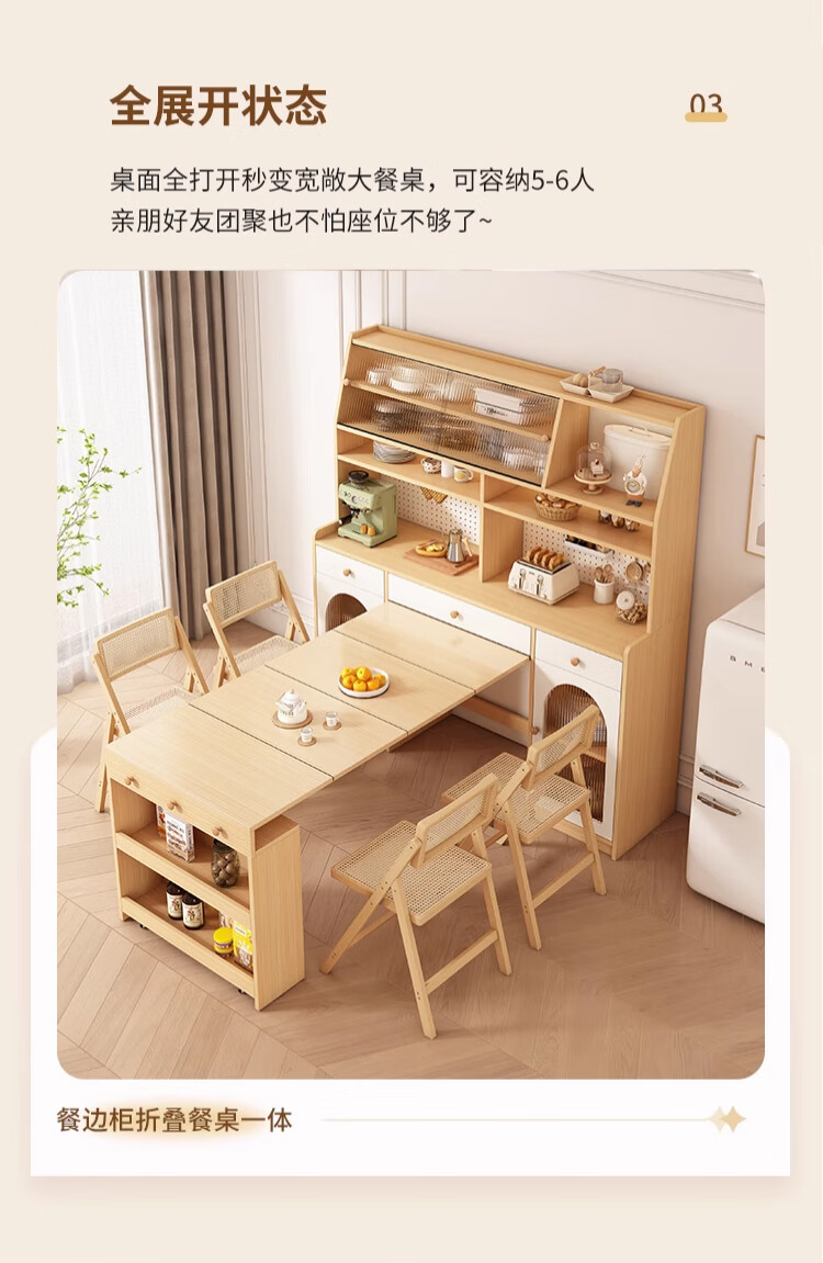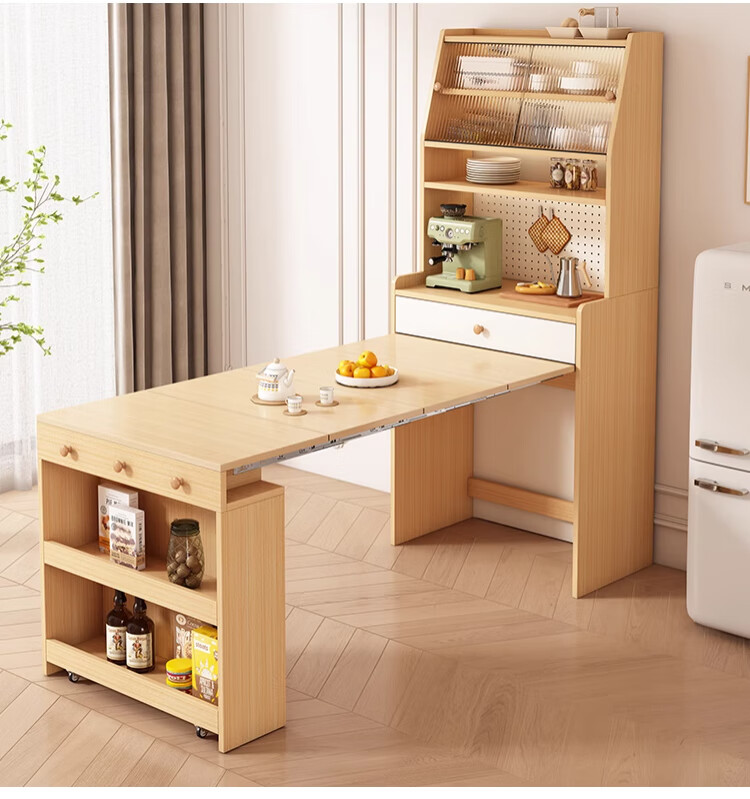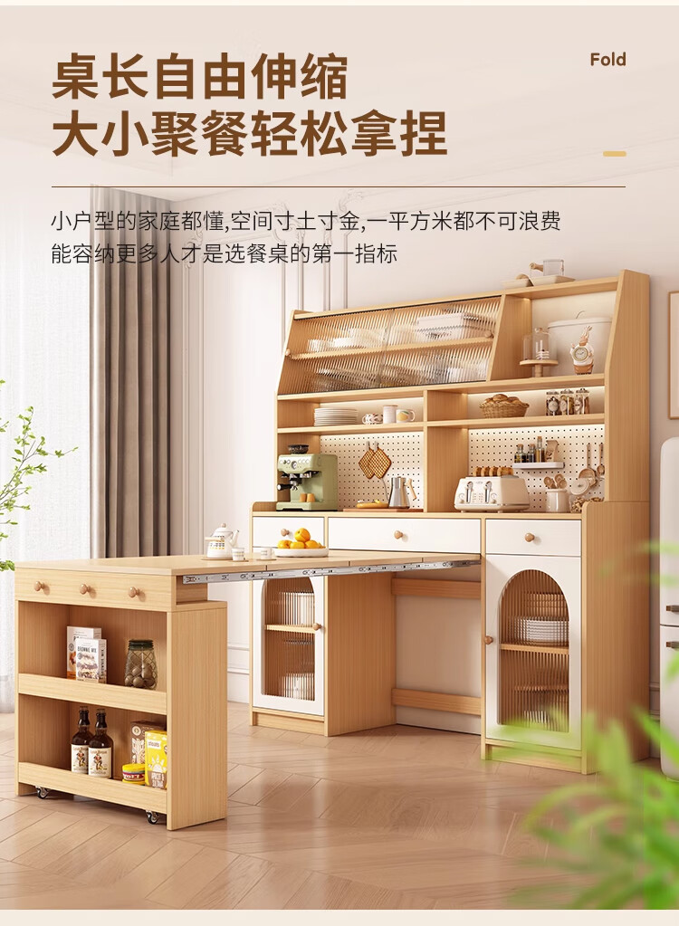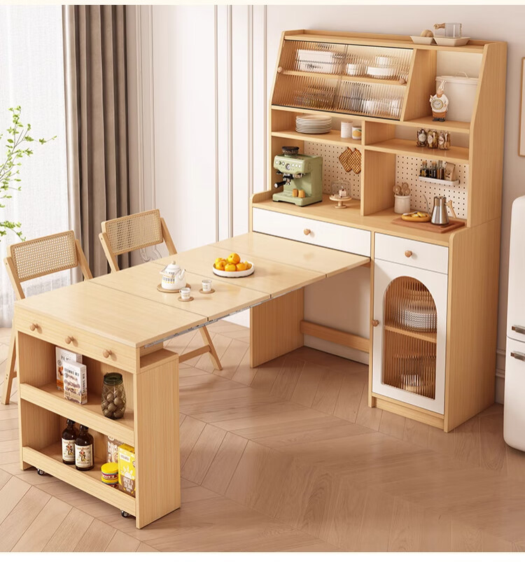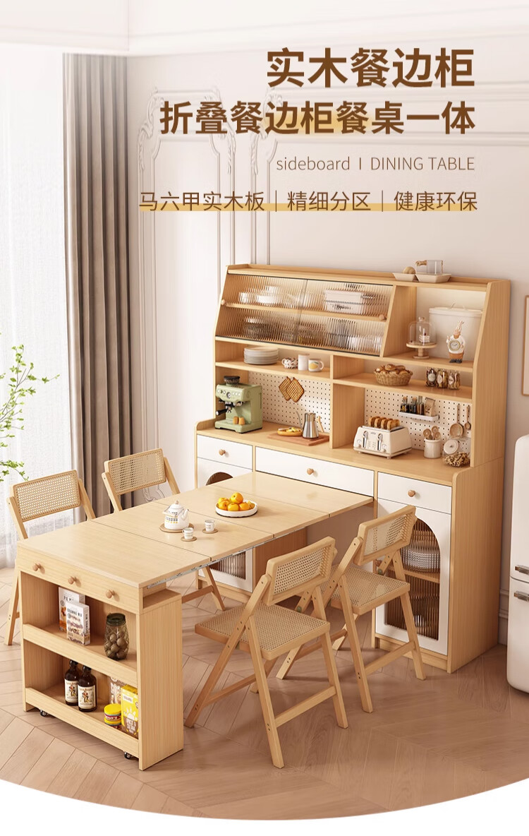 Maixiu solid wood sideboard and dining table integrated retractable and foldable small apartment living room home wall wine cabinet storage rack solid wood sideboard 120CM + retractable dining table-log cream color