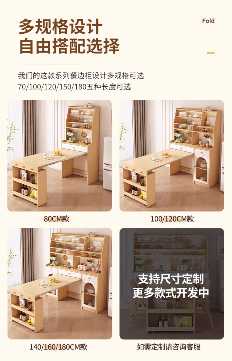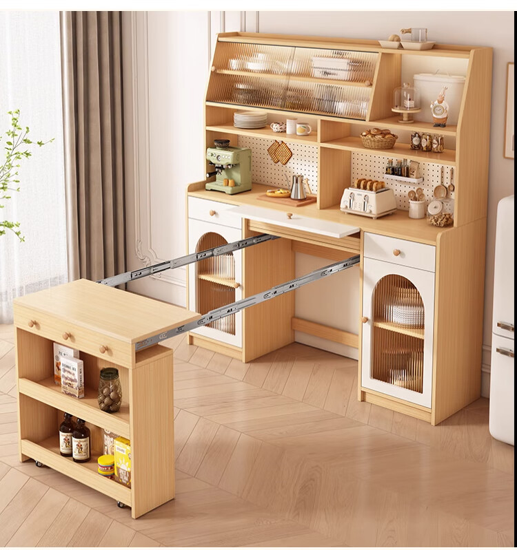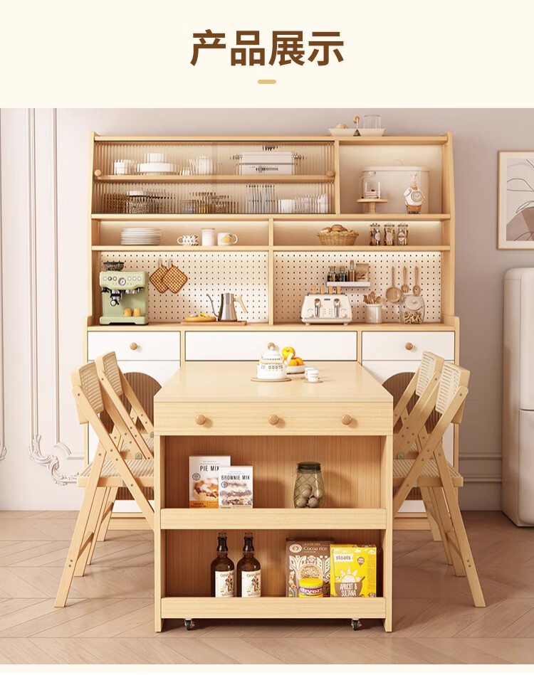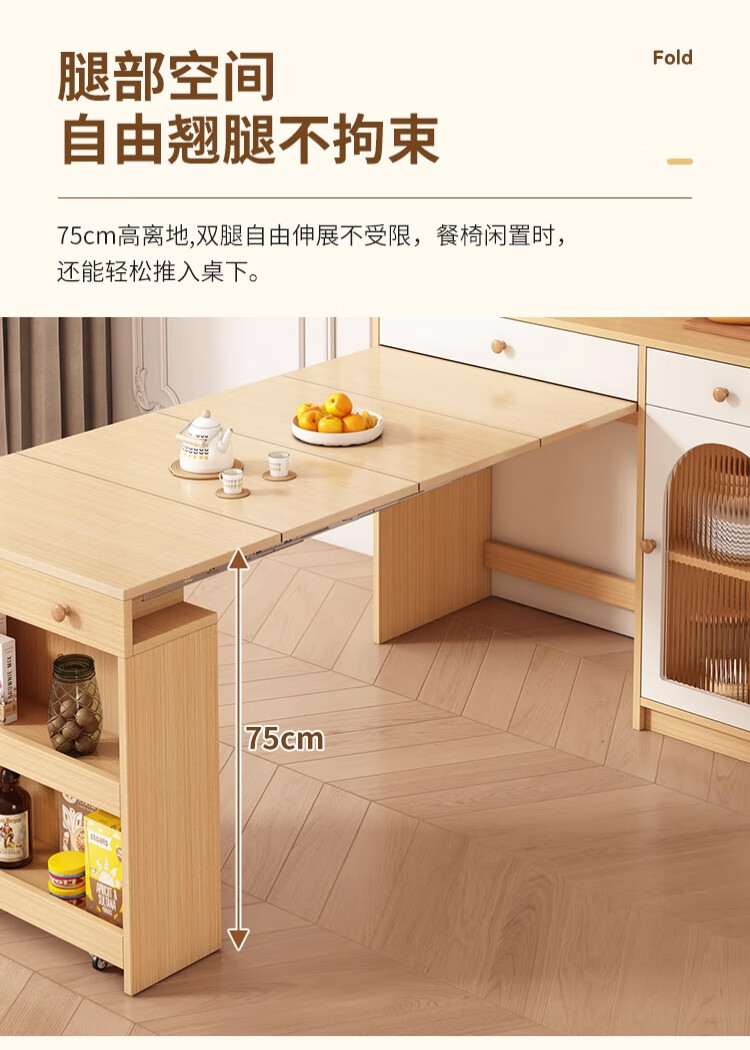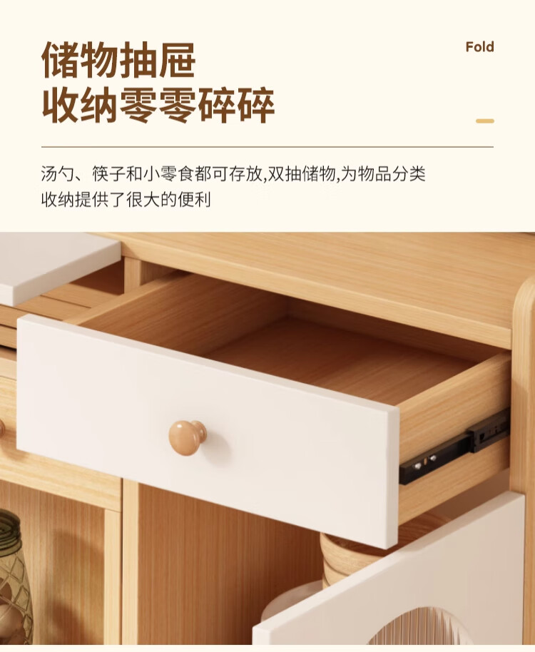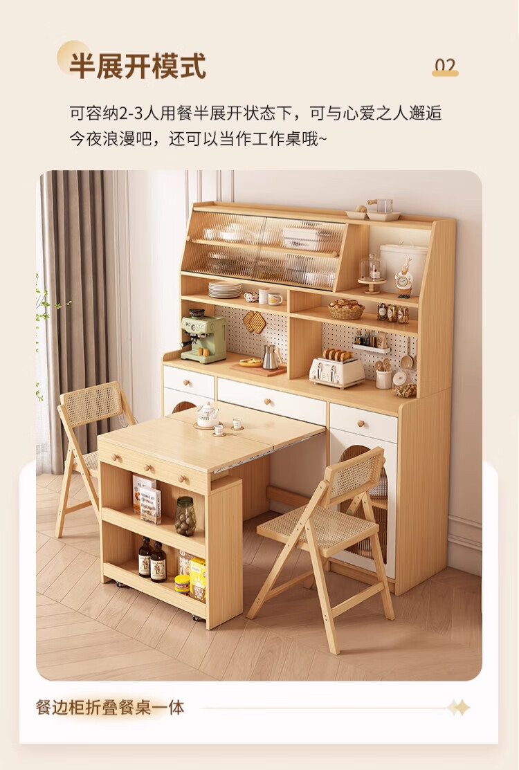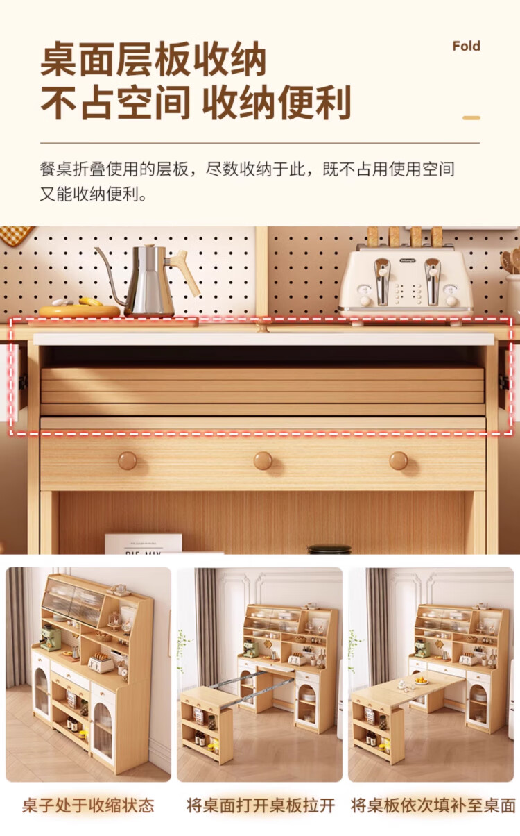 Maixiu solid wood sideboard and dining table integrated retractable and foldable small apartment living room home wall wine cabinet storage rack solid wood sideboard 120CM + retractable dining table-log cream color