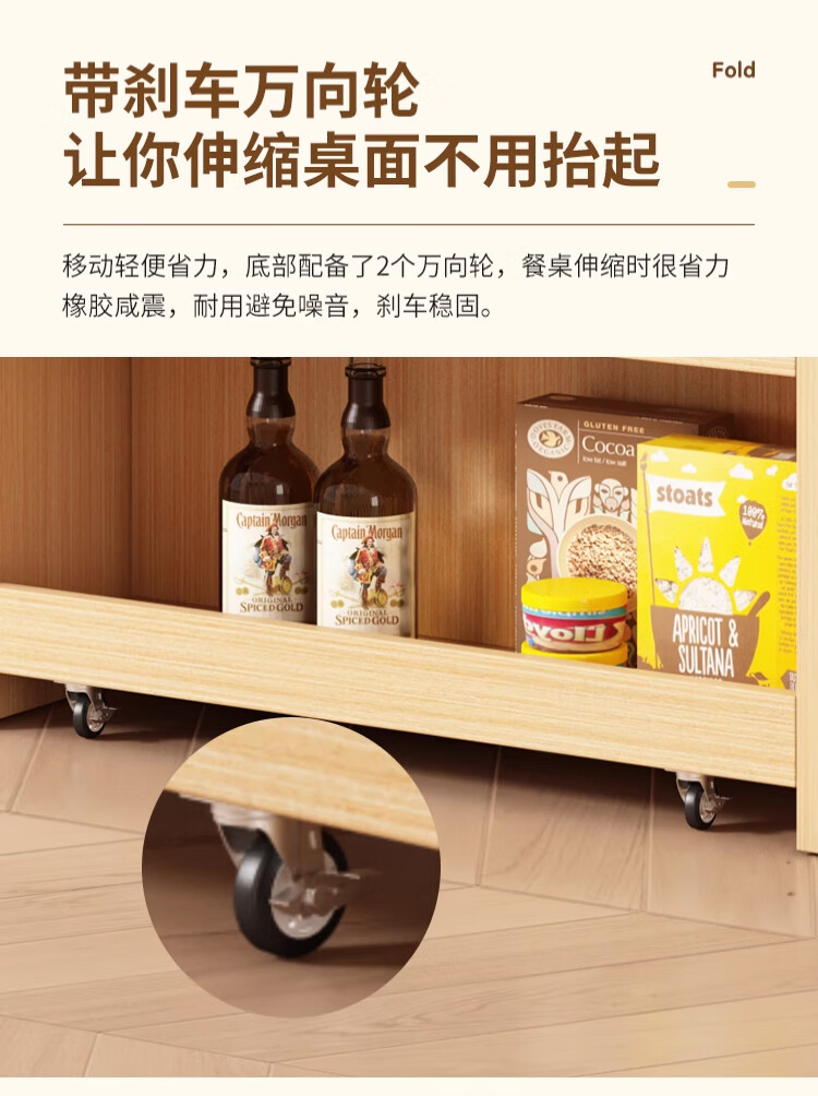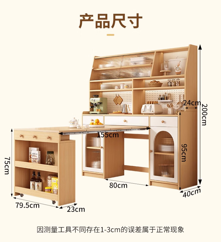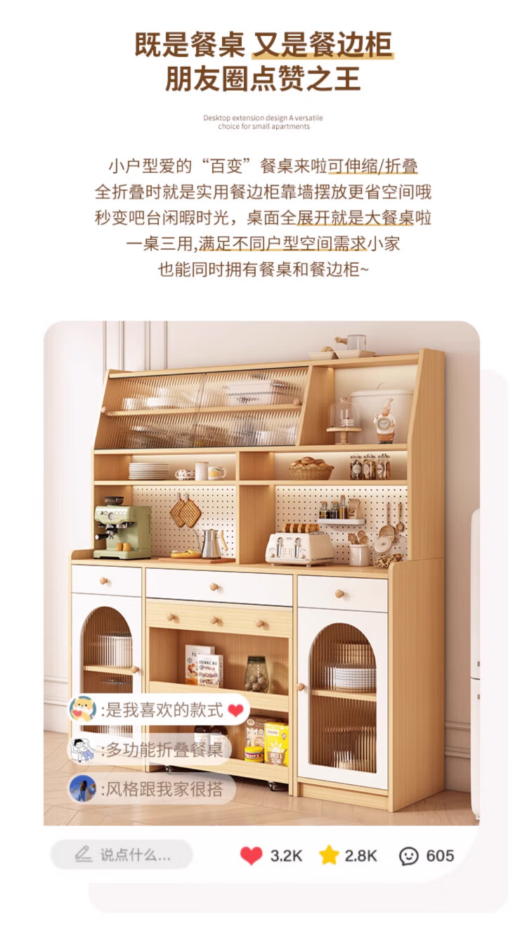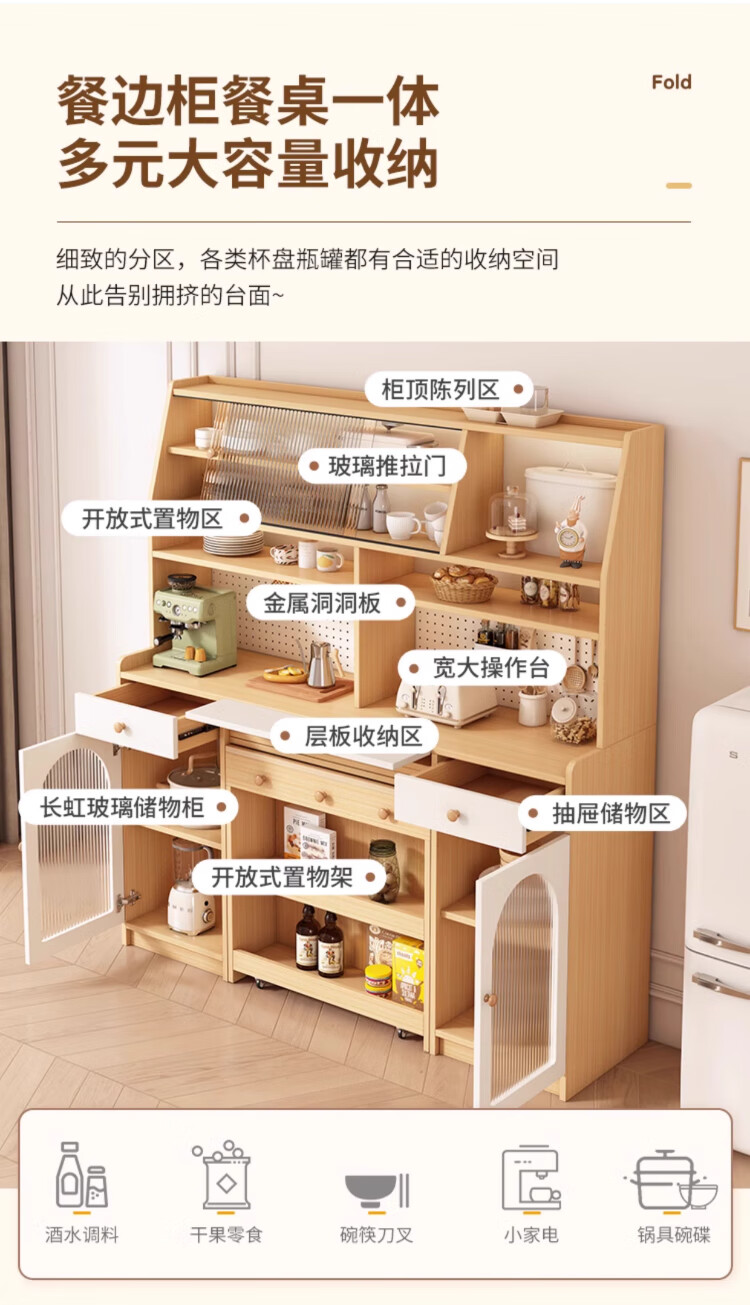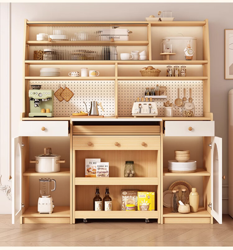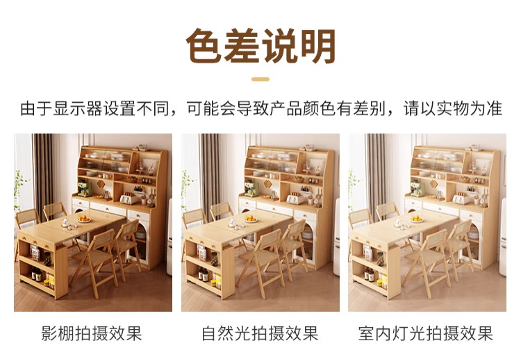 Maixiu solid wood sideboard and dining table integrated retractable and foldable small apartment living room home wall wine cabinet storage rack solid wood sideboard 120CM + retractable dining table-log cream color