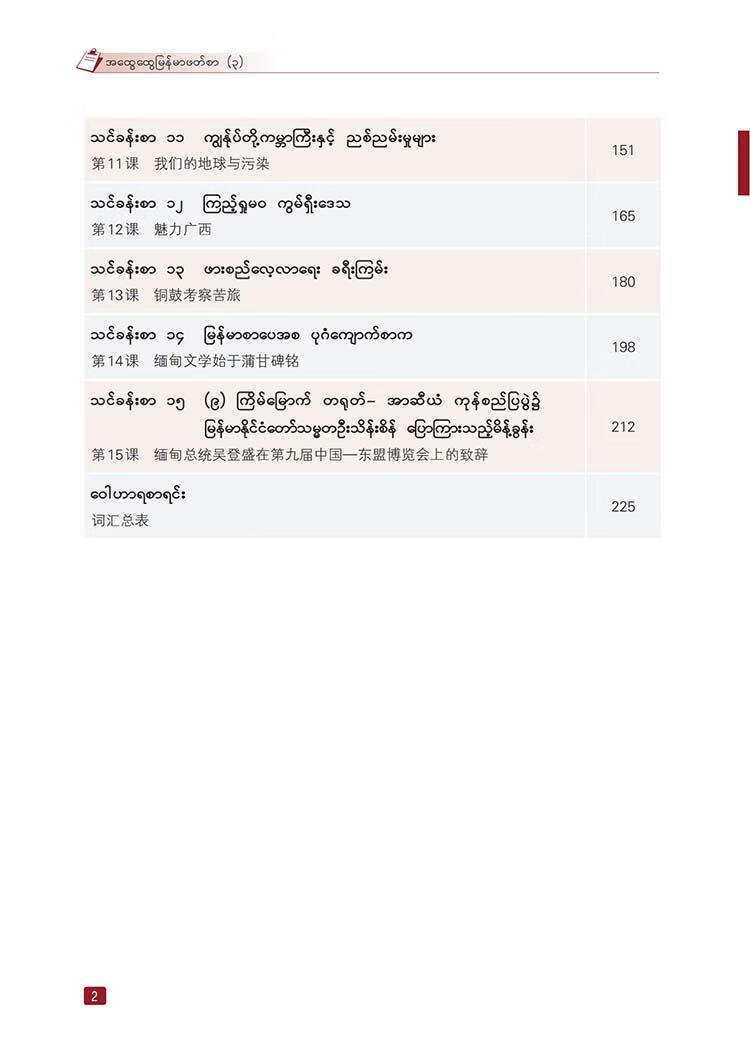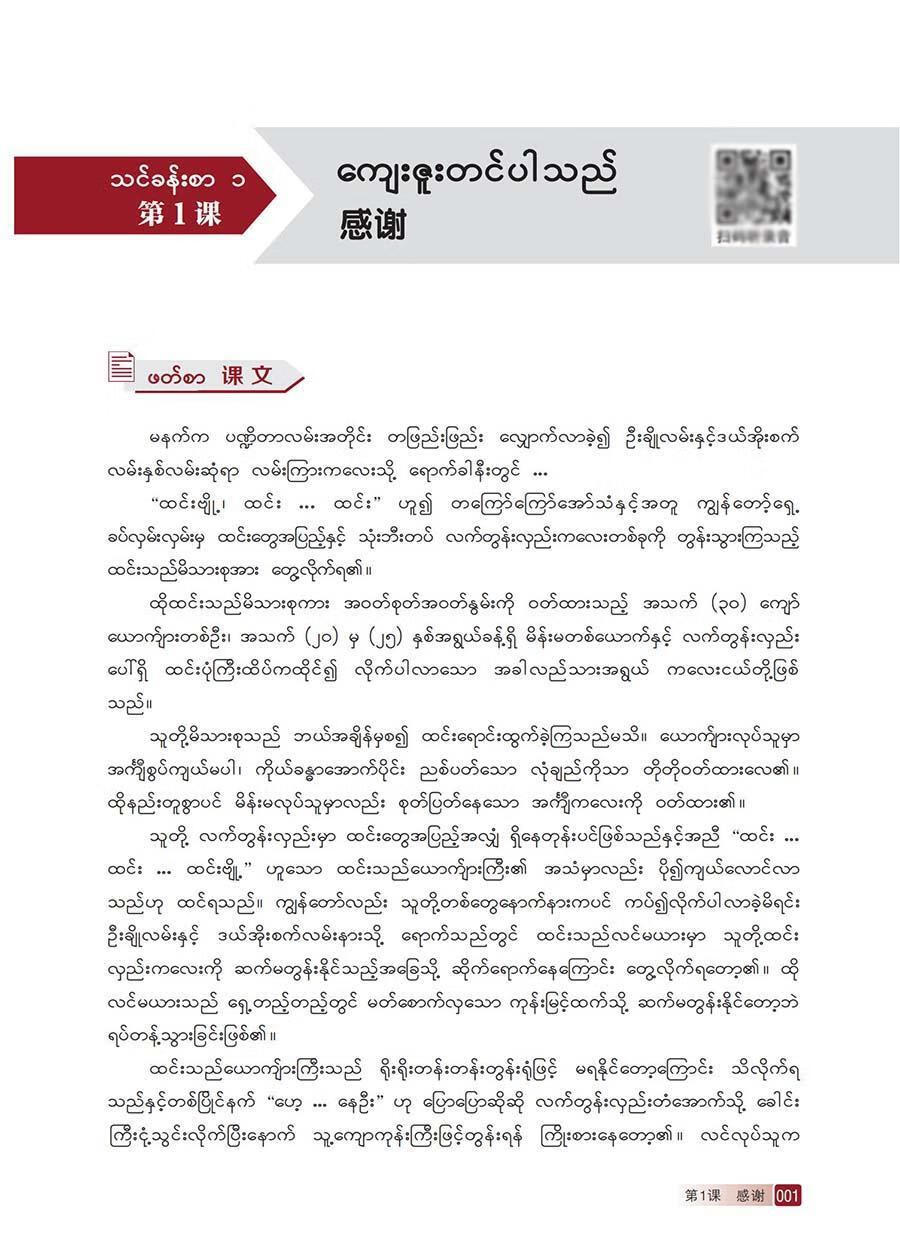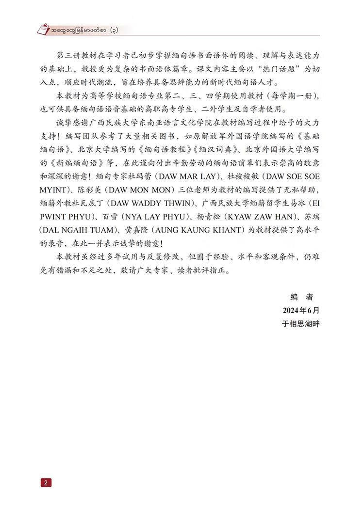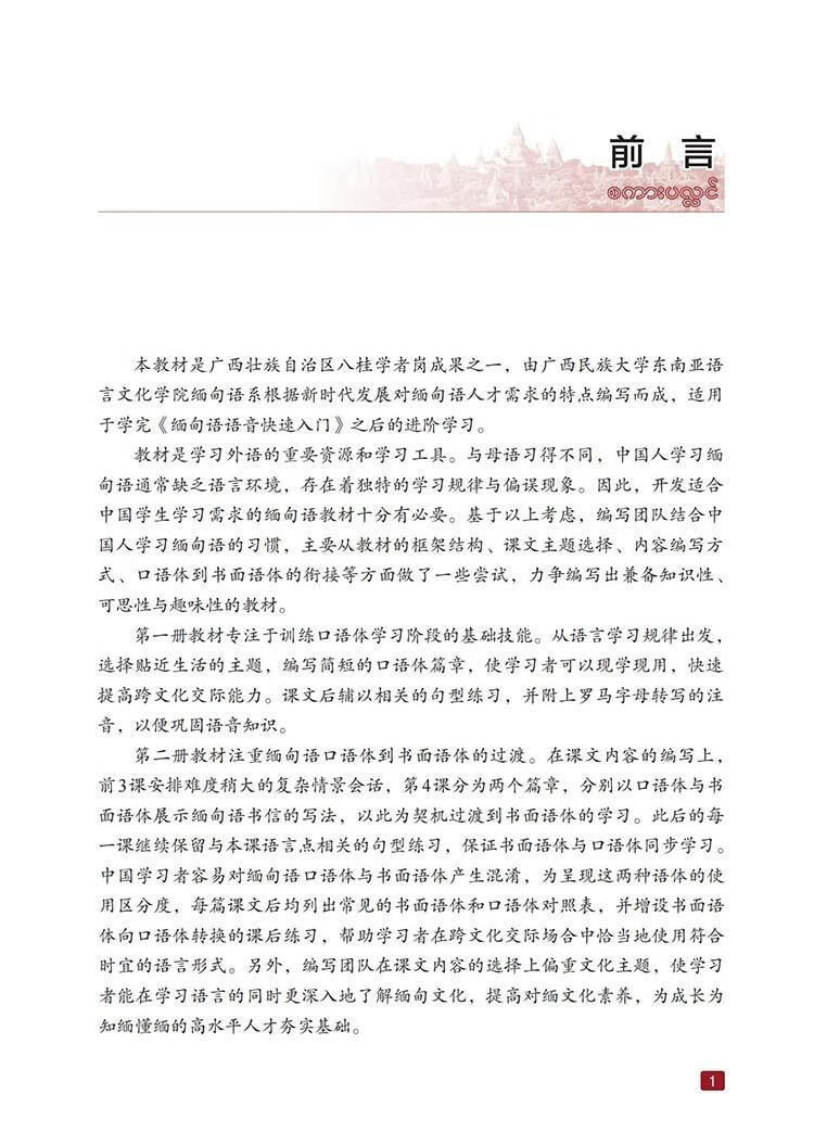本教材是广西壮族自治区八桂学者岗成果之一,由广西民族大学东南亚语言文化学院缅甸语系根据新时代发展对缅甸语人才需求的特点编写而成,适用于学完《缅甸语语音快速入门》之后阶学/p> 教材是学的重要资源和学。与母语同,中国人学语通常缺乏语言环境,存在着的学与偏误现象。因此,开发适合中国学生学的缅甸语教材十分有必要。基于以上考虑,编写团队结合中国人学语的主要从教材的框架结构、课文主题选择、内容编写方式、口语体到书面语体的衔接等方面做了一些尝试,力争编写出兼备知识性、可思性与趣味性的教材, 册教材专注于口语体学的基础技能。从语言学出发,选择近生活的主题,编写简短的口语体篇章,使学以现学现用,快速提高跨文化交际能力。课文后辅以相关的句型练附上罗马字母转写的注音,以便巩固语音知识。 二册教材注重缅甸语口语体到书面语体的过渡。在课文内容的编写上,前3课安排难度稍大的复杂景会话,4课分为两个篇章,分别以口语体与书面语体展示缅甸语书信的写法,以此为契机过渡到书面语体的学后的每一课继续保留与本课语言点相关的句型练面语体与口语体同步学国学易对缅甸语口语体与书面语体产生混淆,为呈现这两种语体的使用区分度,每篇课文后均列出常见的书面语体和口语体对照表,并增设书面语体向口语体转换的课后练助学跨文化交际场合中恰当地使用符合时宜的语言形式。另外,编写团队在课文内容的选择上偏重文化主题,使学在学的同时更深入地了解缅甸文化,提高对缅文化素养,为成长为知缅懂缅的高水平人才夯实基础。 三册教材在学初步掌握缅甸语书面语体的阅读、理解与表达能力的基础上,教授更为复杂的书面语体篇章。课文内容主要以“热门话题”为切入点,顺应时代潮流,旨在培养具备思辨能力的新时代缅甸语人才。 本教材为高等学校缅甸语专业二、三、四学期使用教材(每学期一册),也可供具备缅甸语语音基础的高职高专学生、二外学生及自学者使用。 诚挚感谢广西民族大学东南亚语言文化学院在教材编写过程中给予的大力支持!编写团队参考了大量相关图书,如原解放军外国语学院编写的《基础缅句语》、大学编写的《缅甸语教程》《缅汉词典》、外国语大学编写的《缅甸语》等,在此谨向付出辛勤劳动的缅甸语前辈们表示崇高的敬意和深深的谢意!缅甸专家杜玛蕾(DAW MAR LAY)、杜梭梭敏(DAW SOE SOEMYINT)、陈彩美(DAW MON MON)三位老师为教材的编写提供了无私帮助缅籍外教杜瓦底丁(DAW WADDY THWIN)、广西民族大学缅籍留学生易冰(EIPWINT PHYU)、雪(NYA LAY PHYU)、杨青松(KYAW ZAW HAN)、苏端(DAL NGAIH TUAM)、黄嘉隆(AUNG KAUNG KHANT)为教材提供了高水平的录音,在此一并表示诚挚的谢意! 太教材虽过多年与反复修改,但围于验、水平和客观条件、仍难免有错漏和不足之处,敬请广大专家、读者批评指正。 |