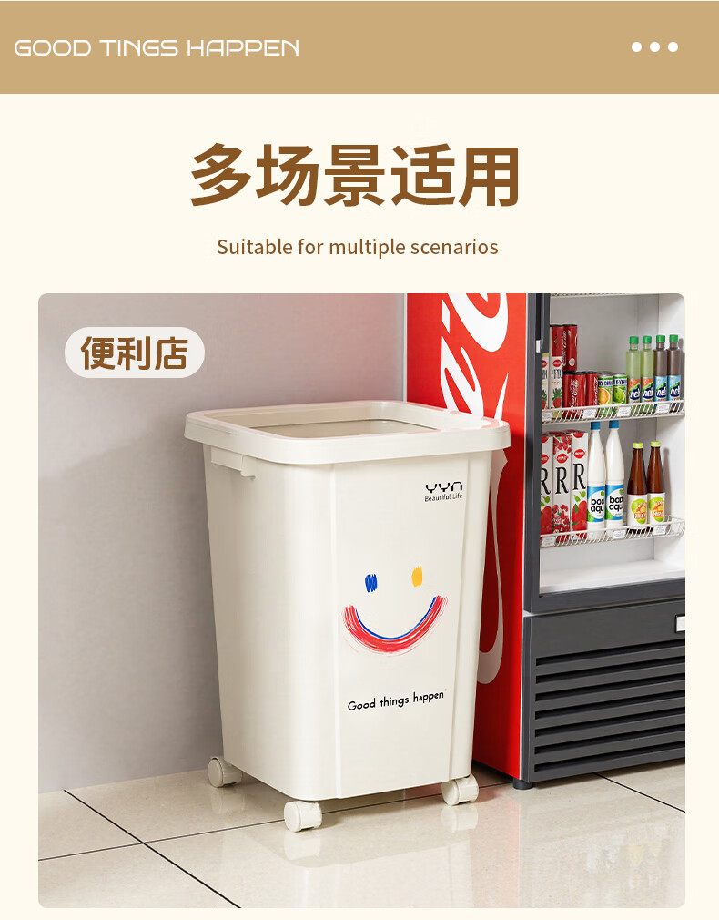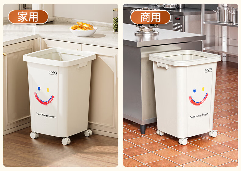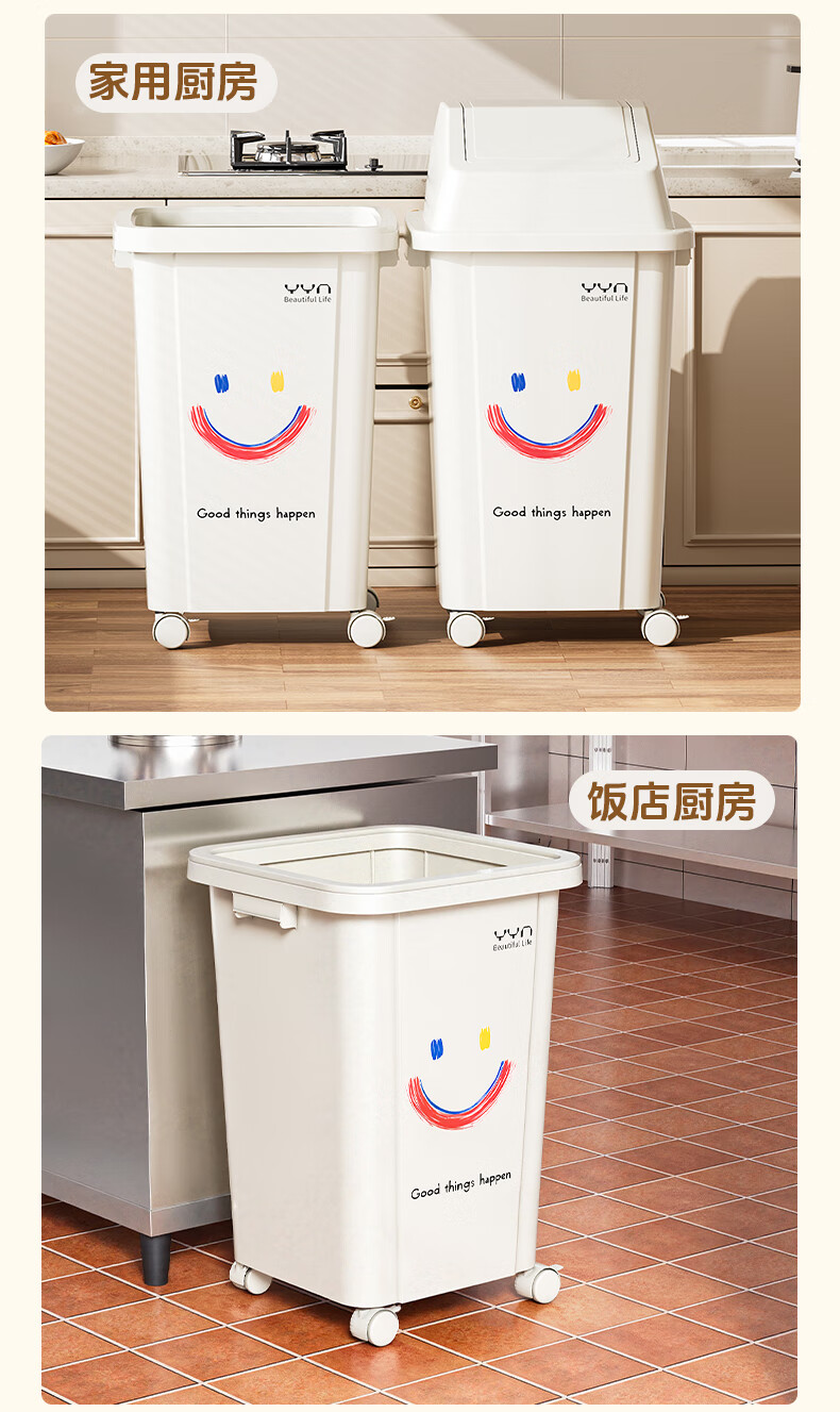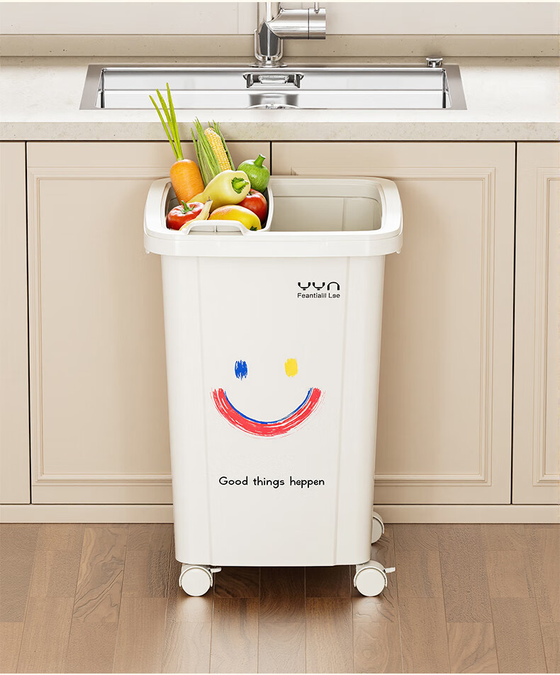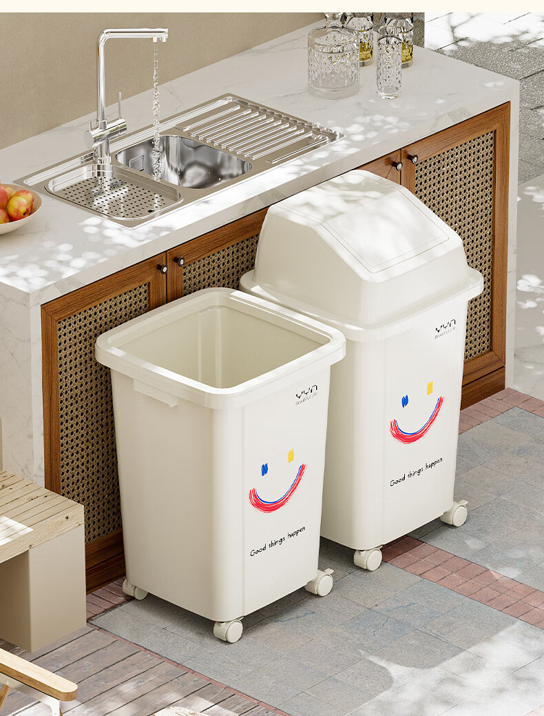PUCHU wheeled trash can 2025 new style light luxury high-capacity household and commercial large size without lid with lid for kitchen rectangular swing lid milk white 60L (wheeled) smiley style