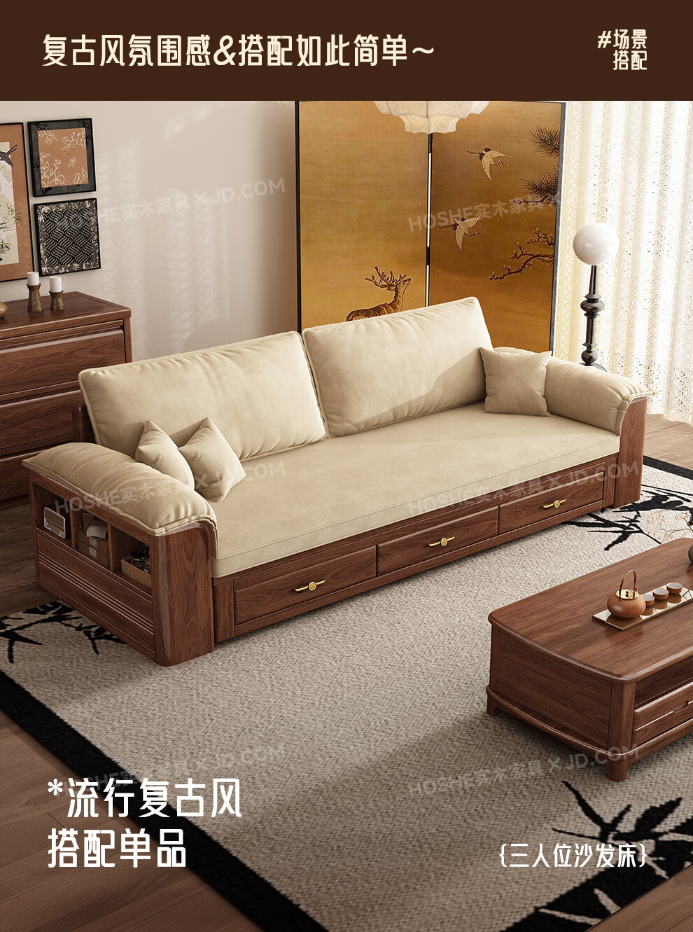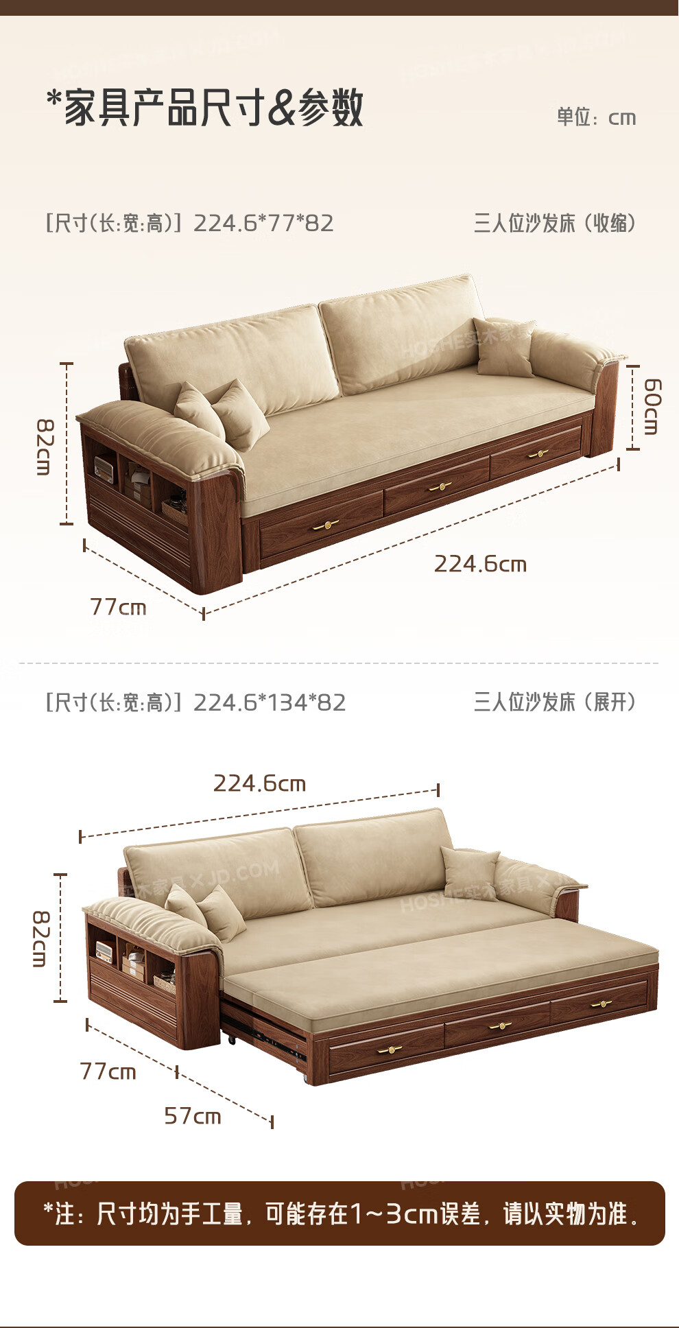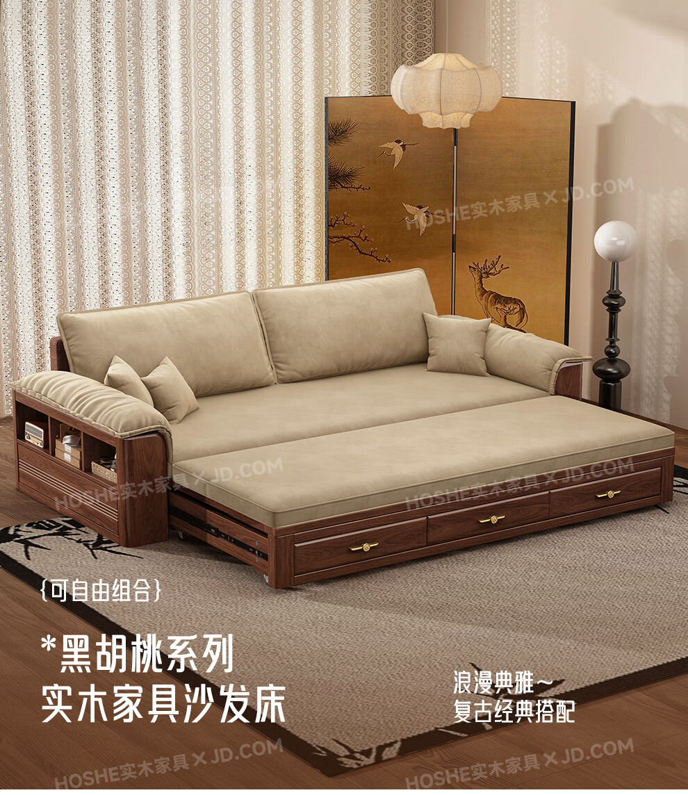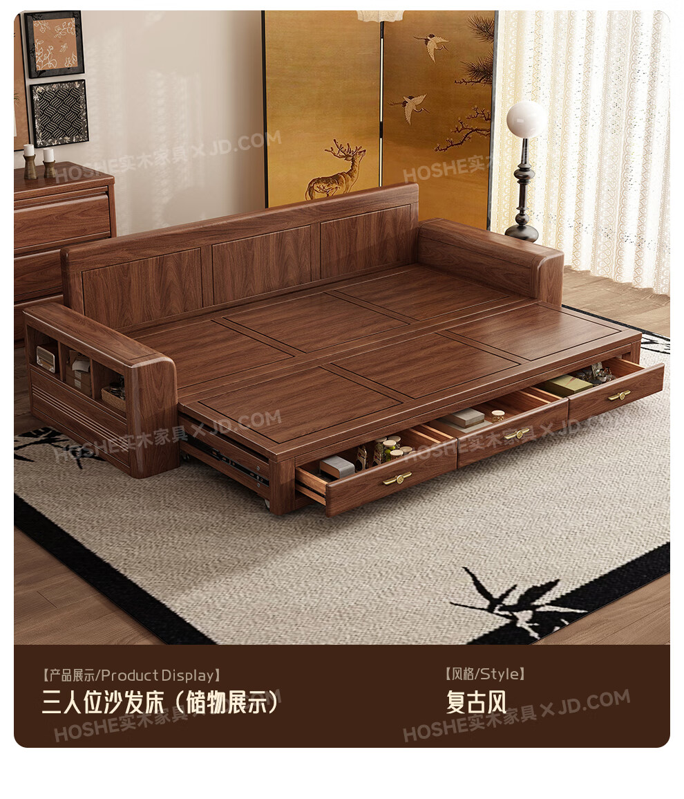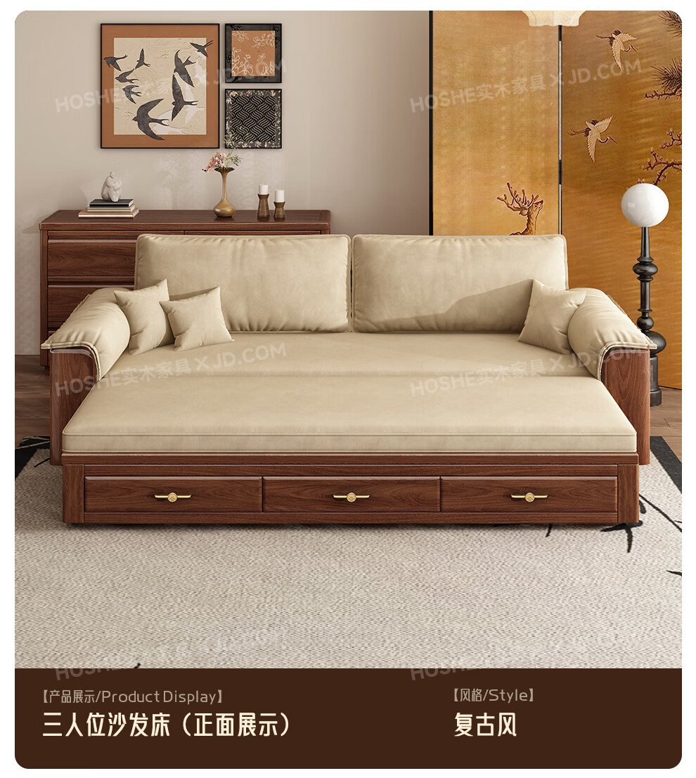 Harmony Home Sofa Bed Black Walnut Solid Wood Sofa Bed All-in-One Dual-Purpose 2025 New Push-Pull Small Apartment Sofa Living Room 2.19 Meter Sofa Bed Without Armrest Package Assembly