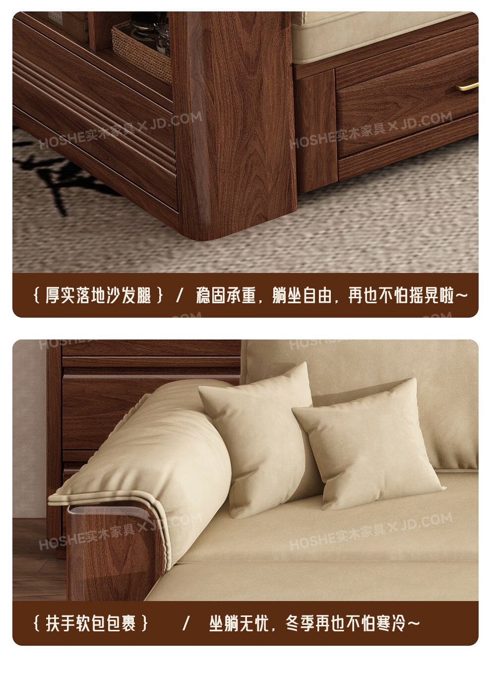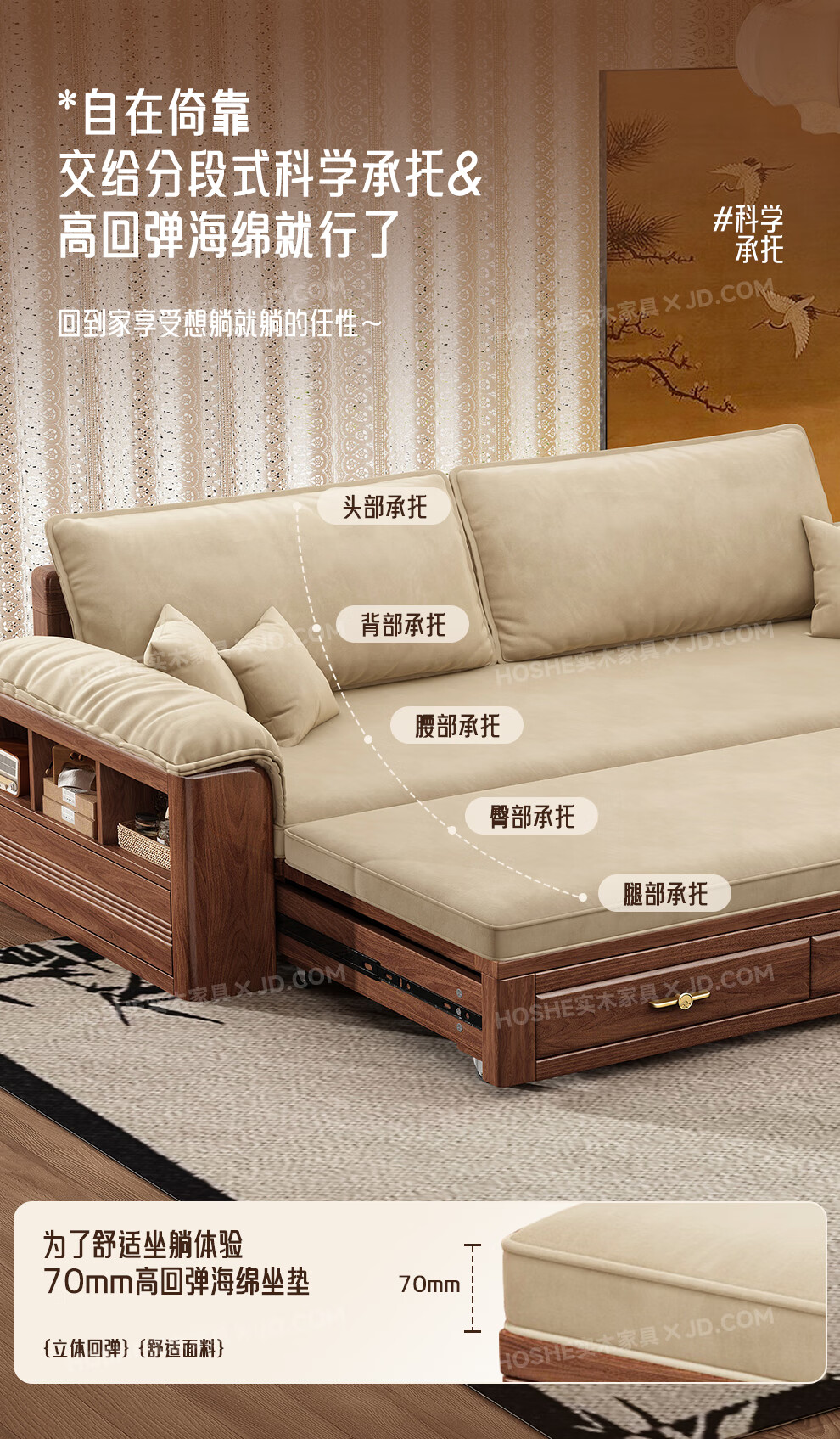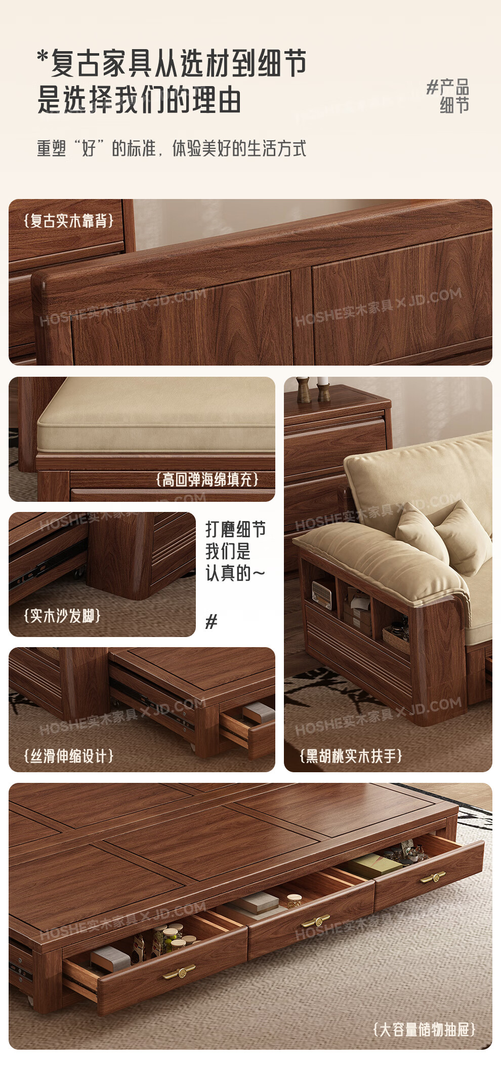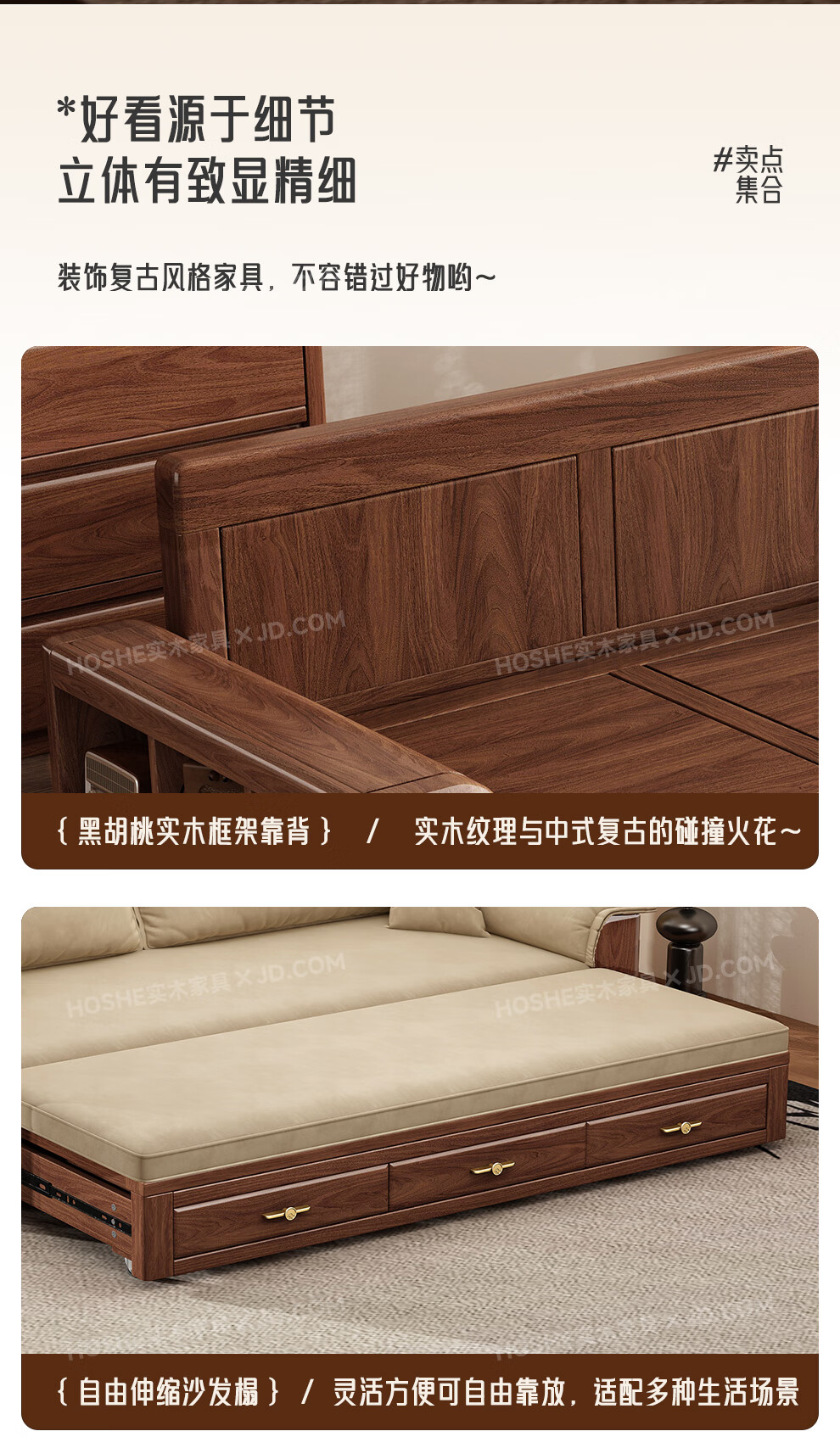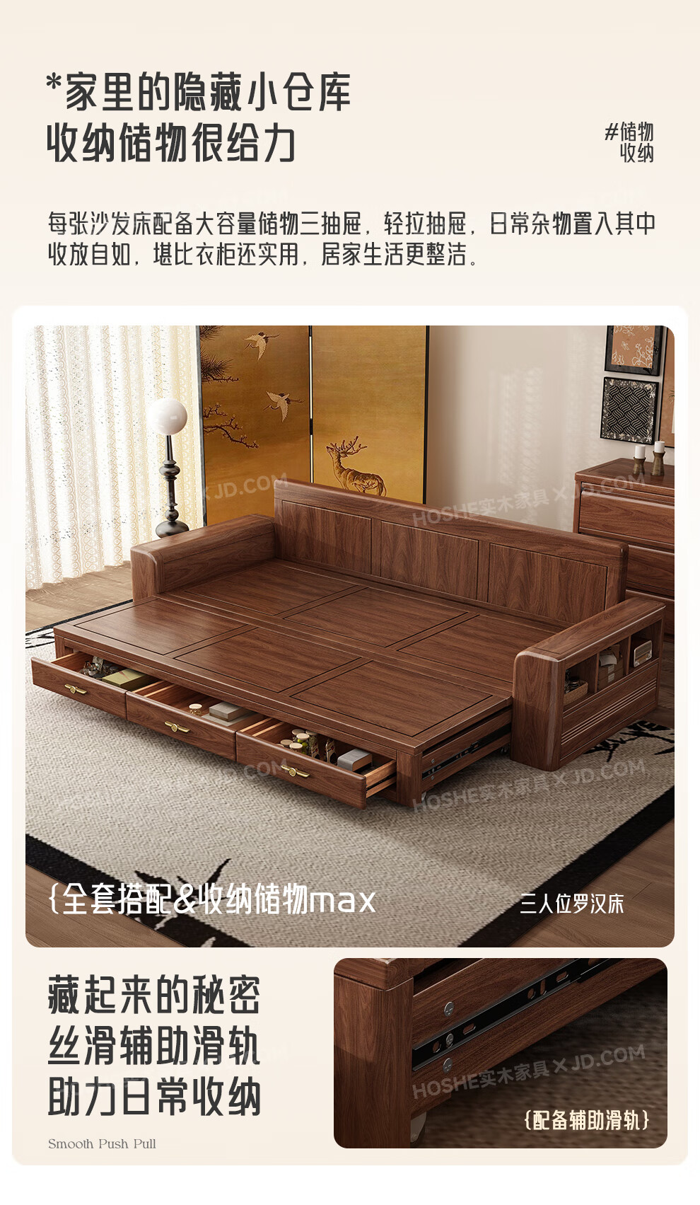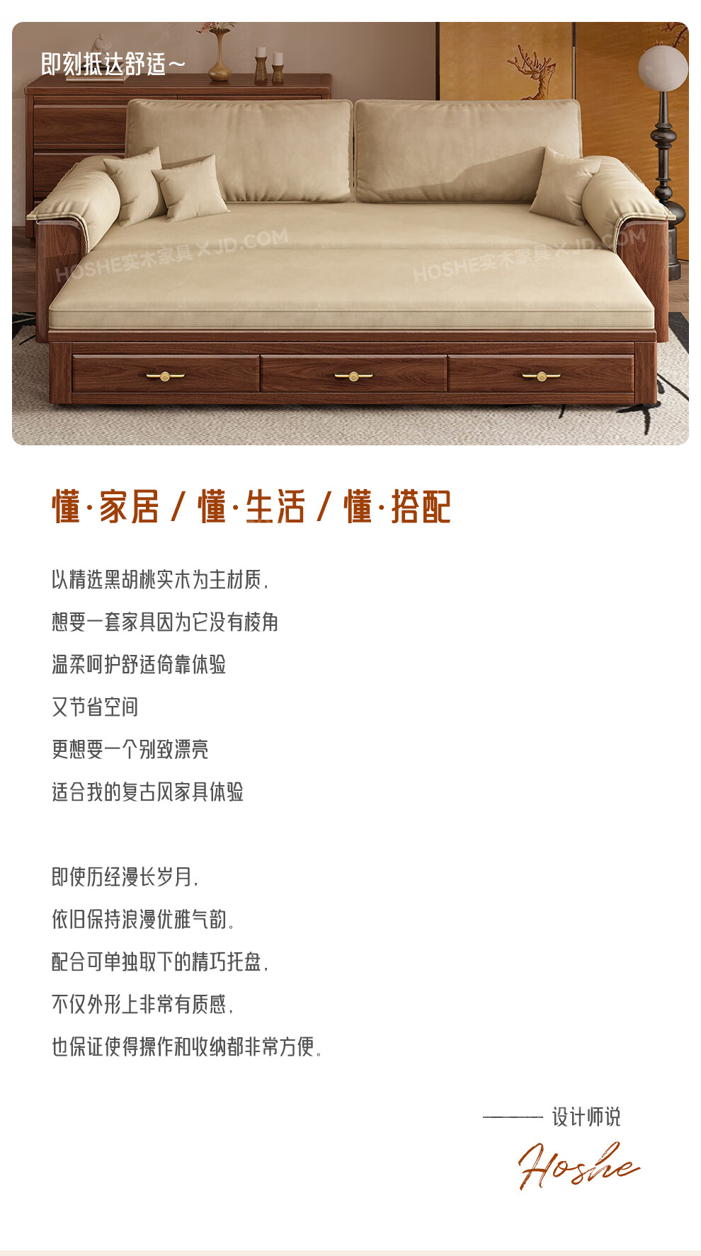 Harmony Home Sofa Bed Black Walnut Solid Wood Sofa Bed All-in-One Dual-Purpose 2025 New Push-Pull Small Apartment Sofa Living Room 2.19 Meter Sofa Bed Without Armrest Package Assembly