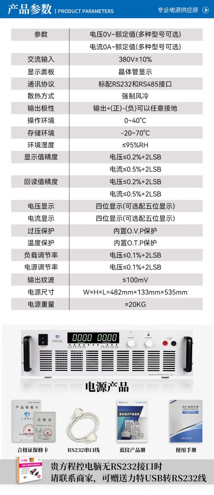 Lanyi Electronics 600V16.7A DC power supply adjustable programmable program-controlled voltage stabilization special aging high-precision high power 10KW ULPS1024 600V16.7A