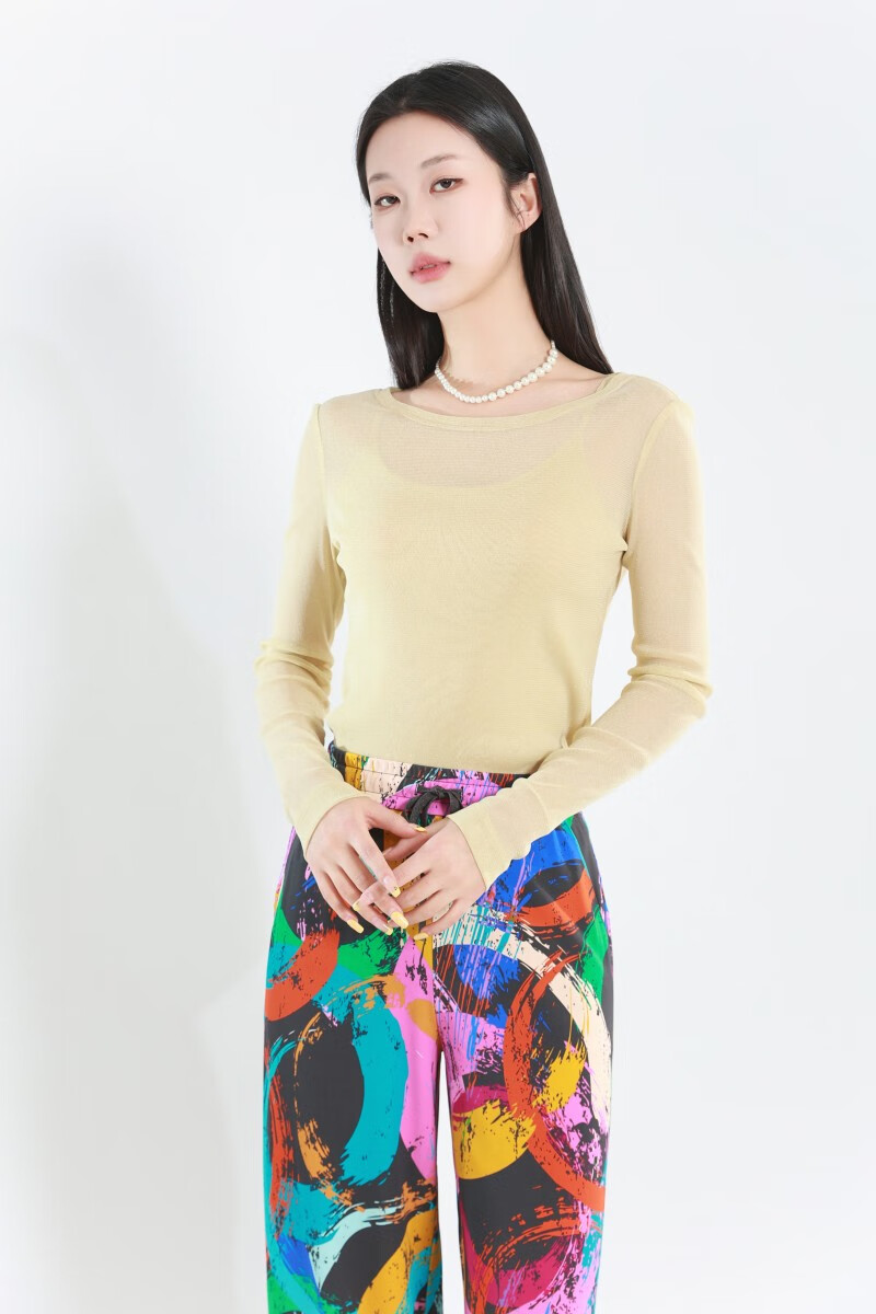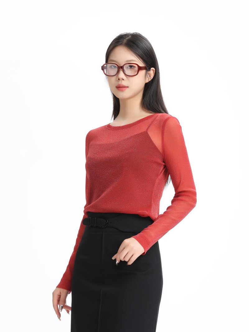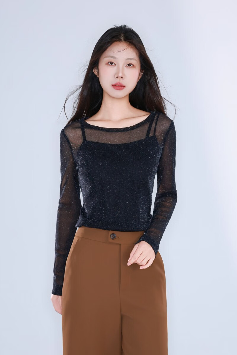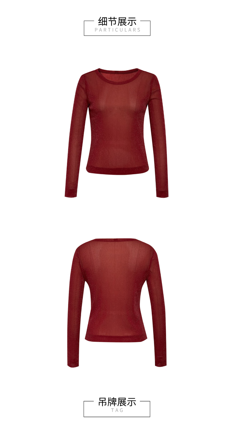 GIRDEAR Women's Bottoming Shirt Fashionable Retro All-match Round Tie Onion Mesh Fabric Top Slim T-shirt 1300958 Black M (3 yards)