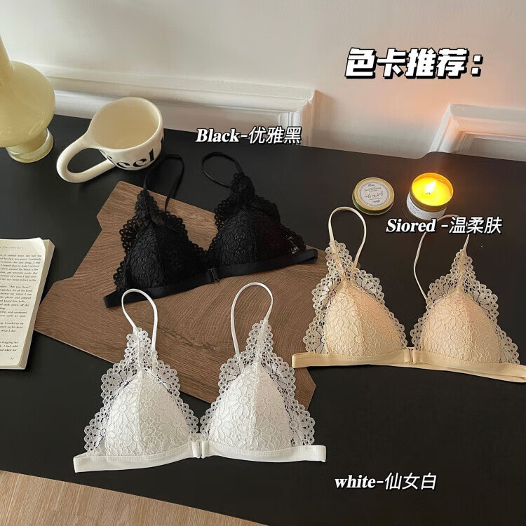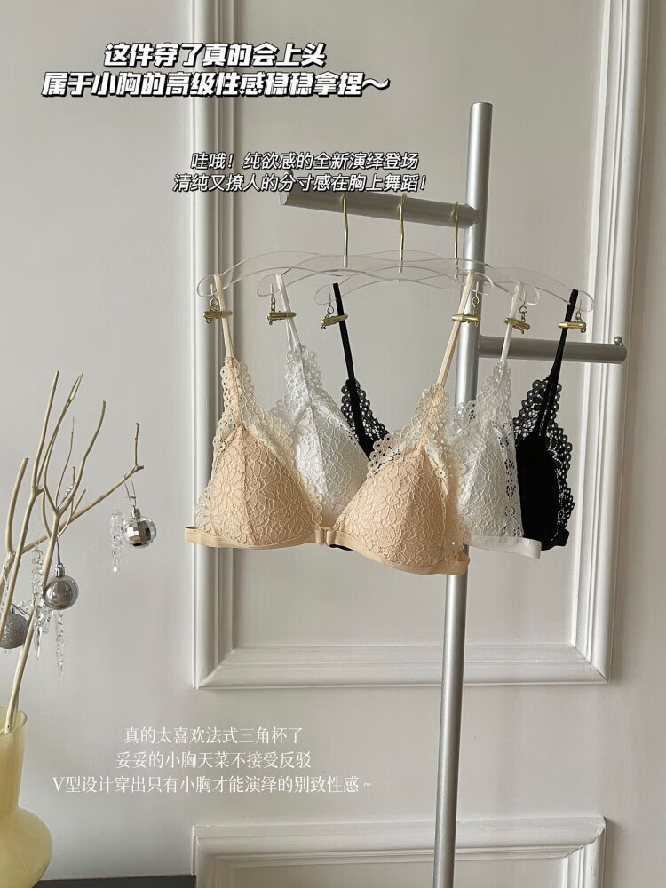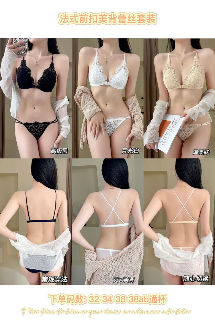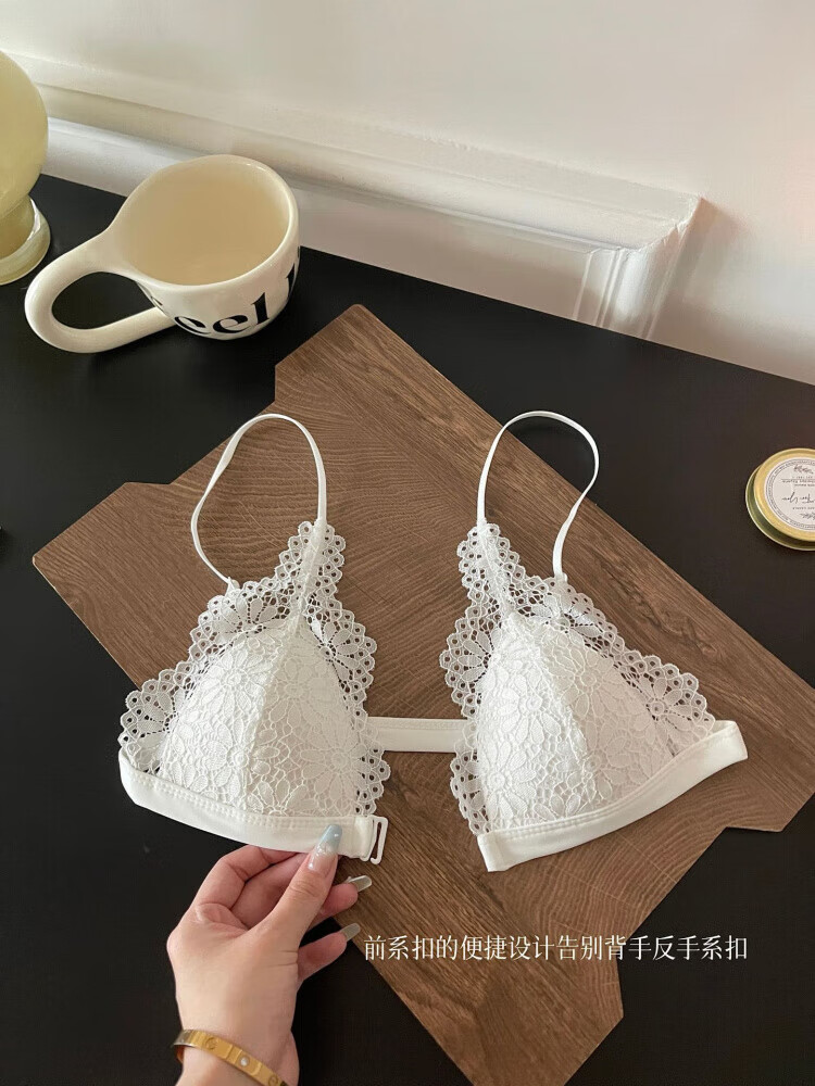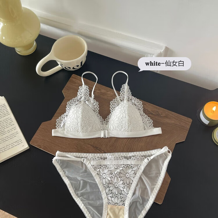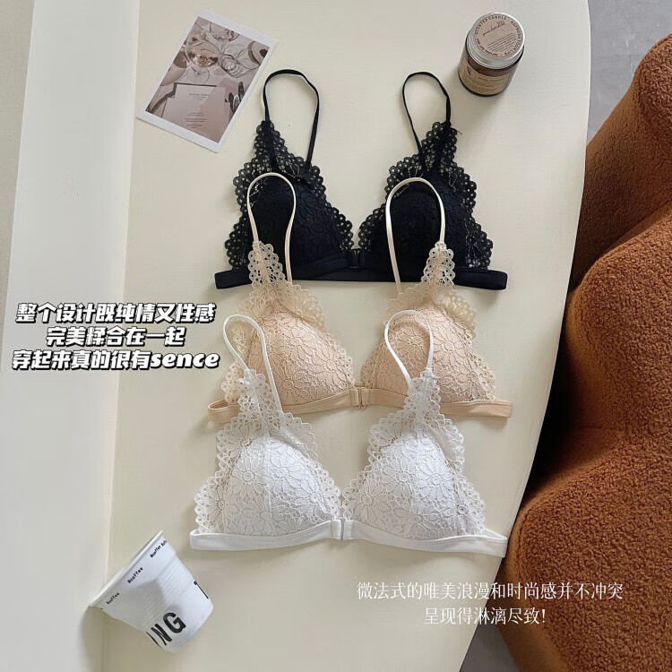 Modal beautiful back and front button bra for women without rims, small breasts, French lace triangle cup, seamless thin strap bra set, summer, gentle on skin, 75A 34B (95-110 pounds)