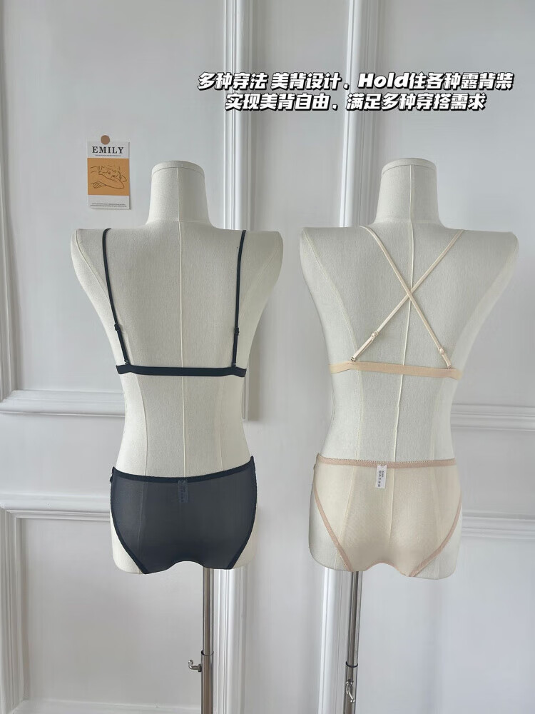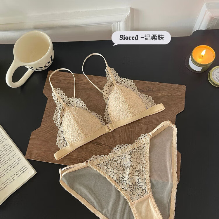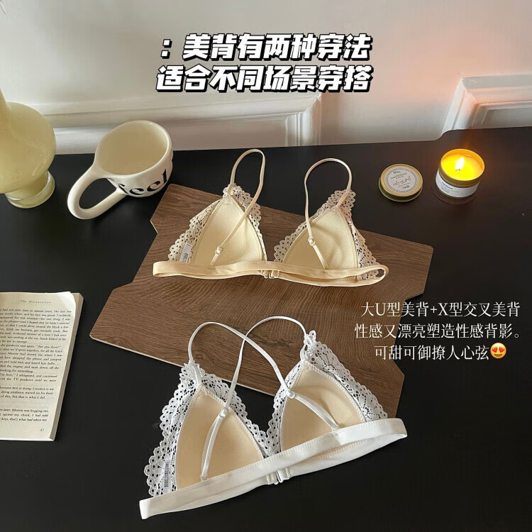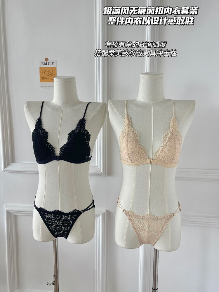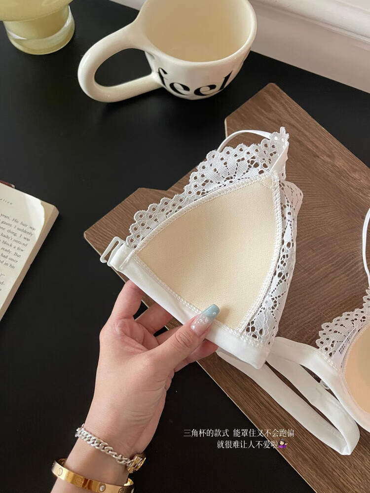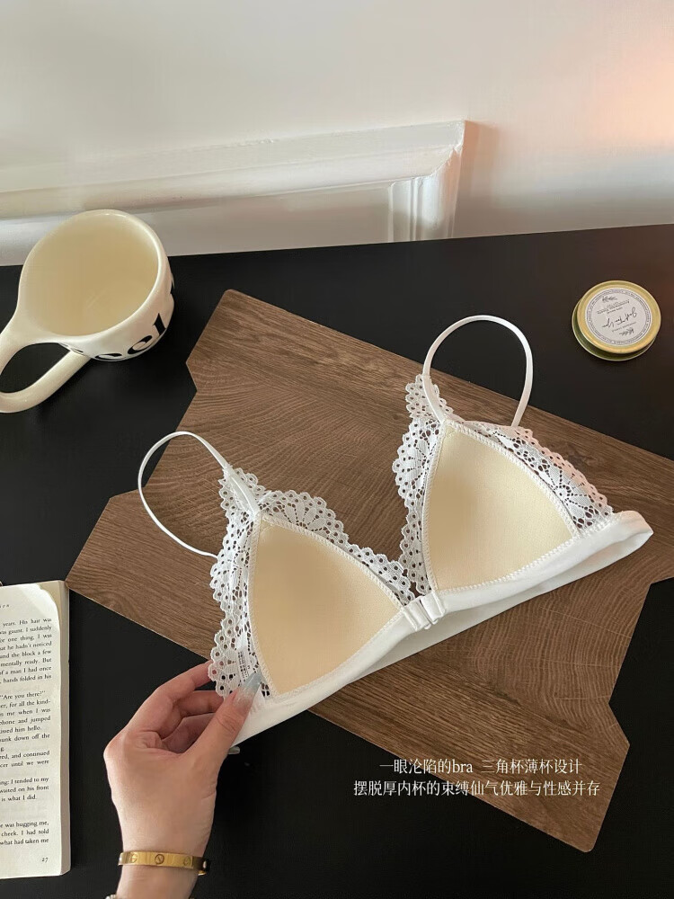 Modal beautiful back and front button bra for women without rims, small breasts, French lace triangle cup, seamless thin strap bra set, summer, gentle on skin, 75A 34B (95-110 pounds)