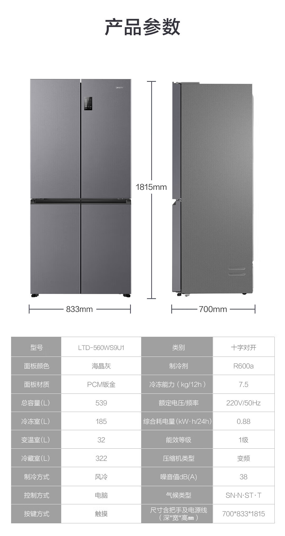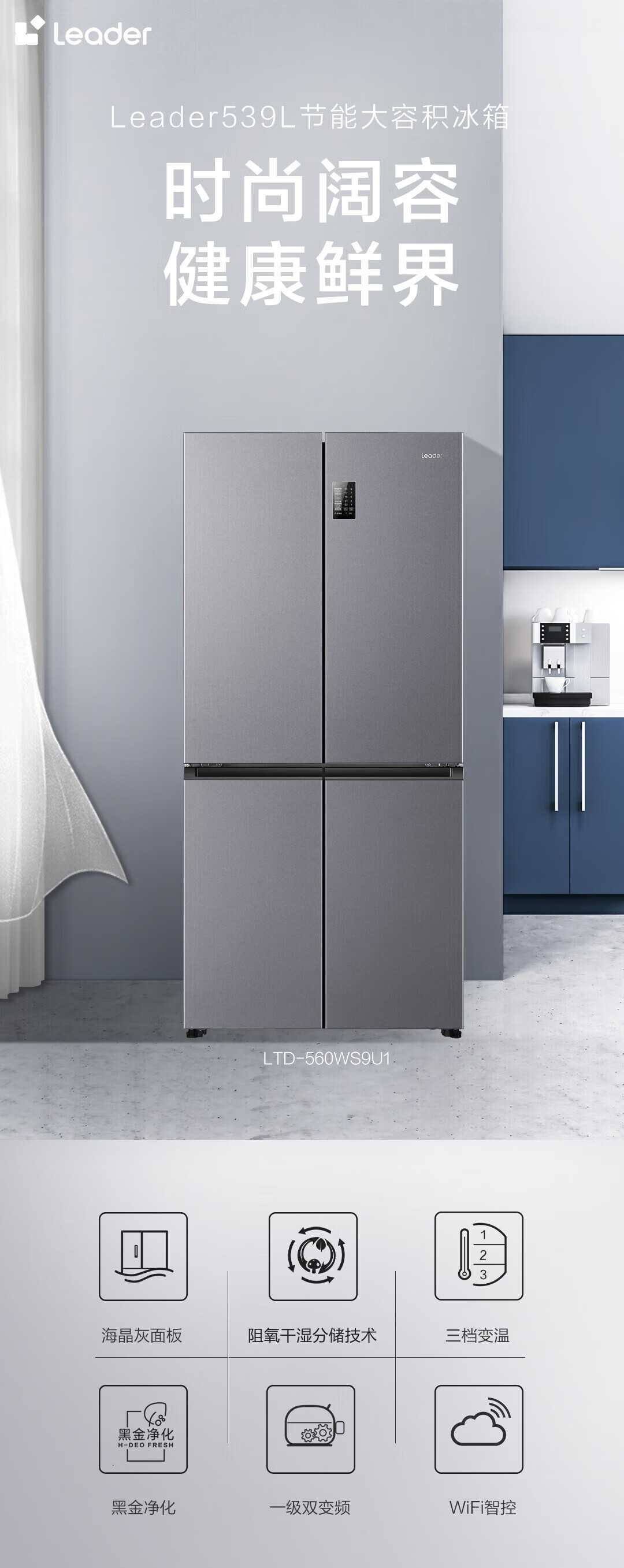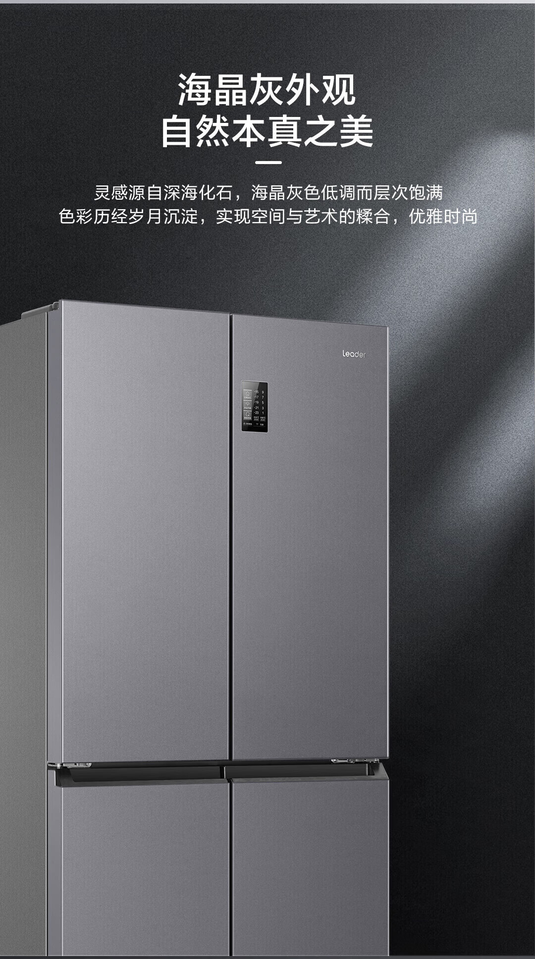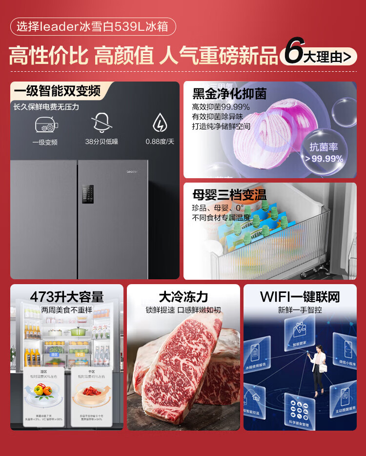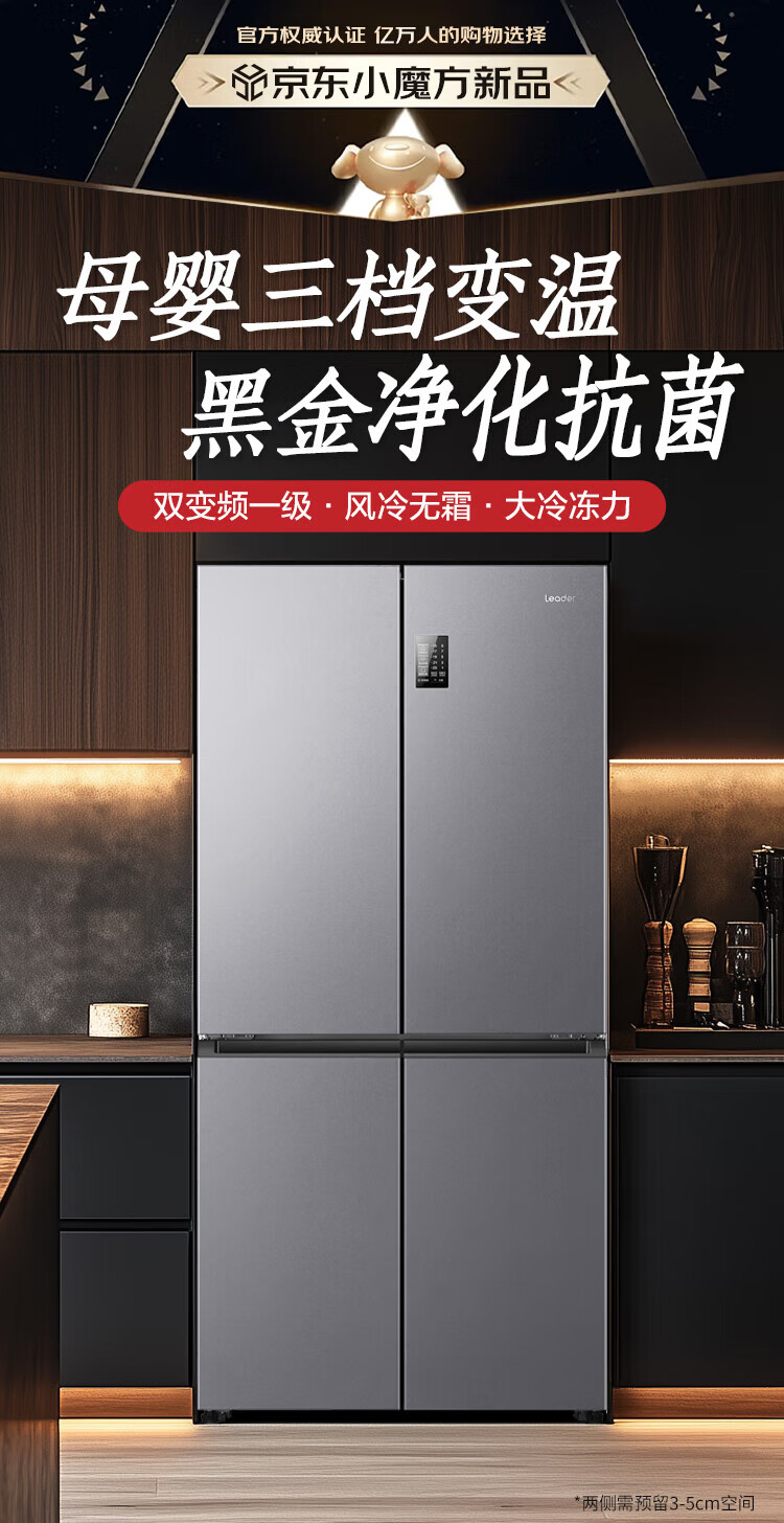 Haier refrigerator produced 560 four-door cross door Leader 539 liters large capacity first-class energy efficiency dual frequency conversion mother and baby three-speed variable temperature air-cooled frost-free oxygen-blocking dry and wet storage upgraded to 539 liters three-speed variable temperature space + black gold purification and antibacterial + mobile phone intelligent control
