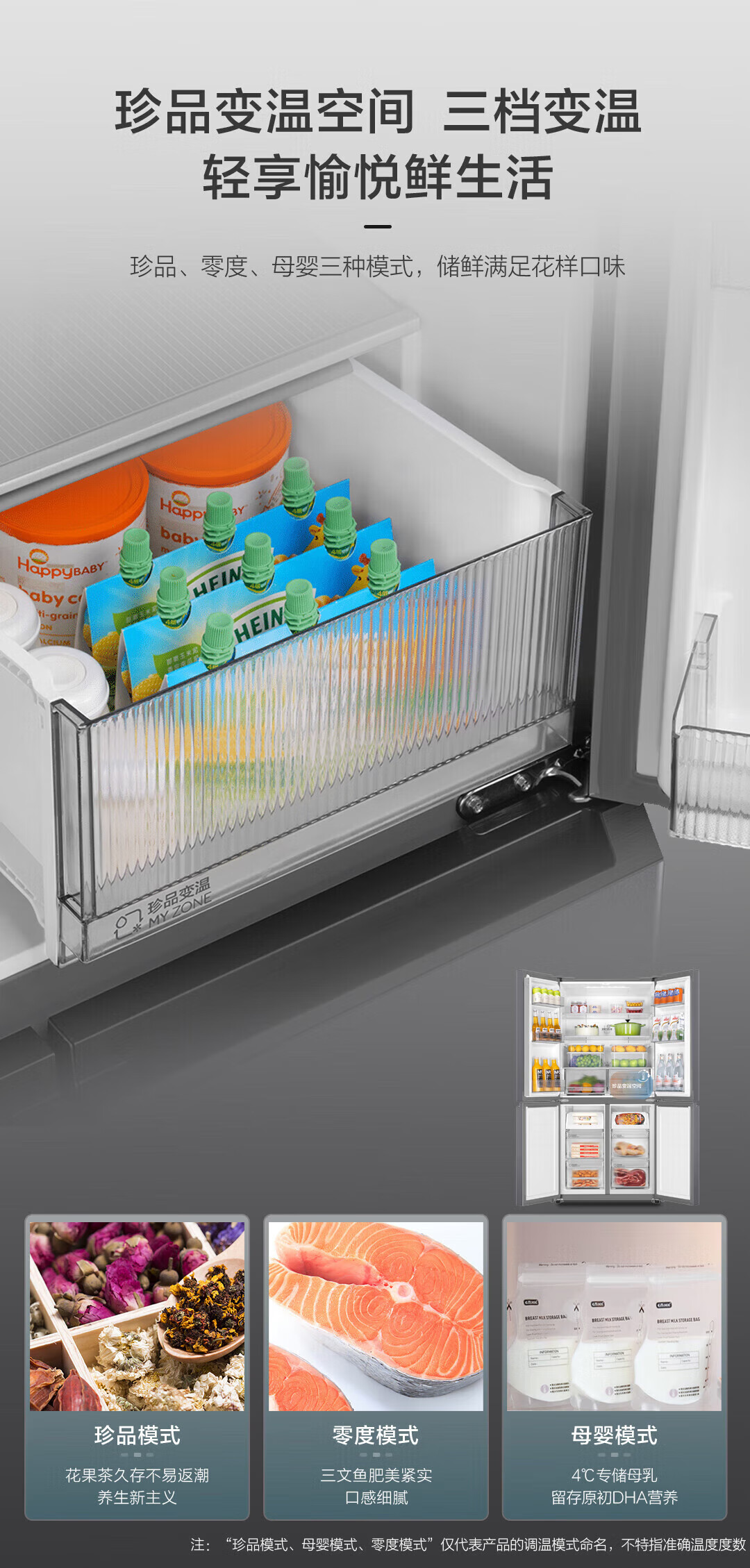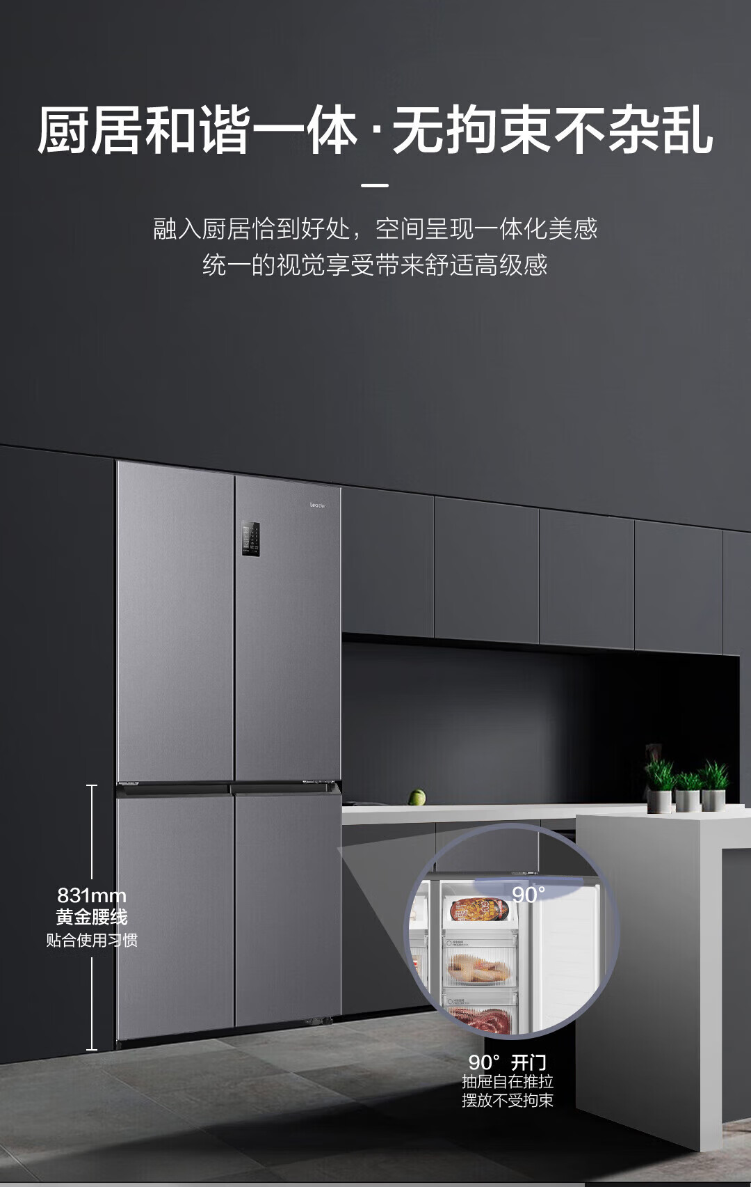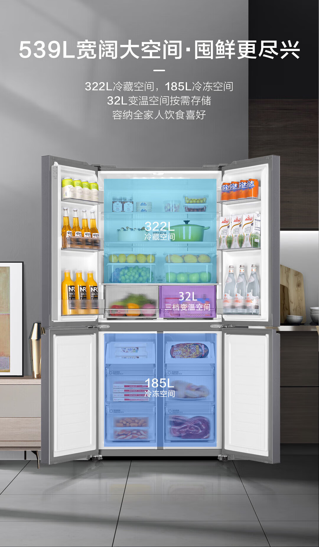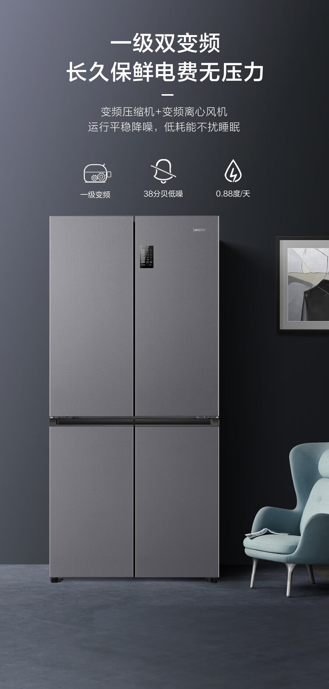 Haier refrigerator produced 560 four-door cross door Leader 539 liters large capacity first-class energy efficiency dual frequency conversion mother and baby three-speed variable temperature air-cooled frost-free oxygen-blocking dry and wet storage upgraded to 539 liters three-speed variable temperature space + black gold purification and antibacterial + mobile phone intelligent control
