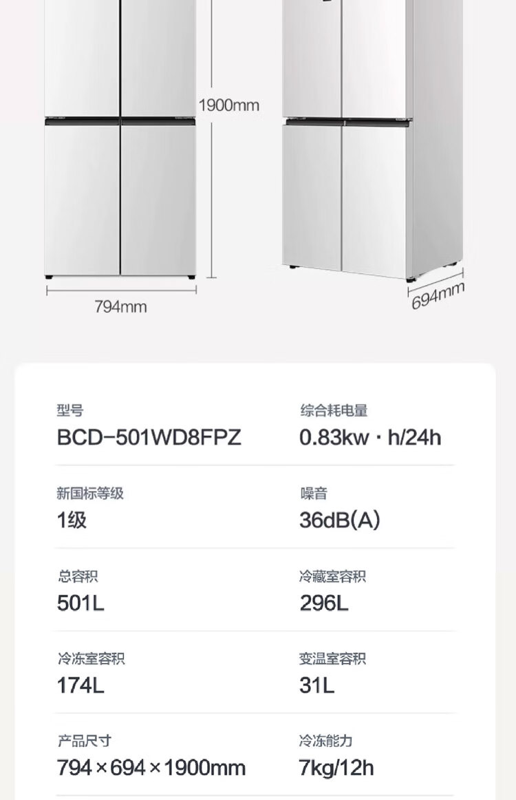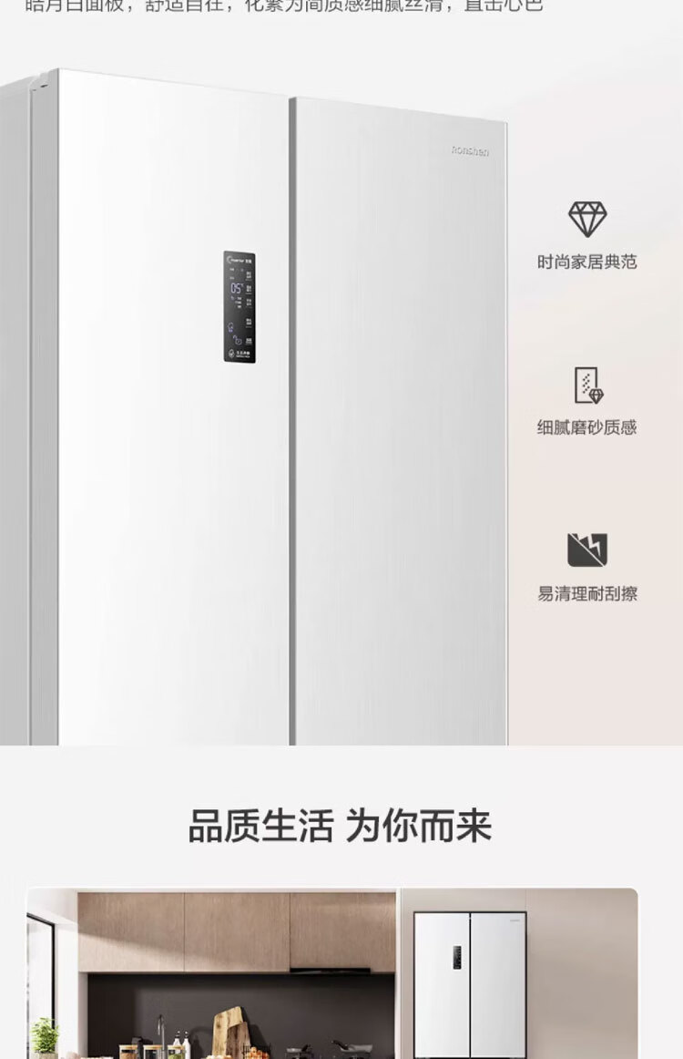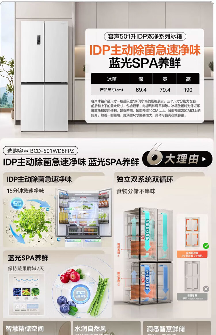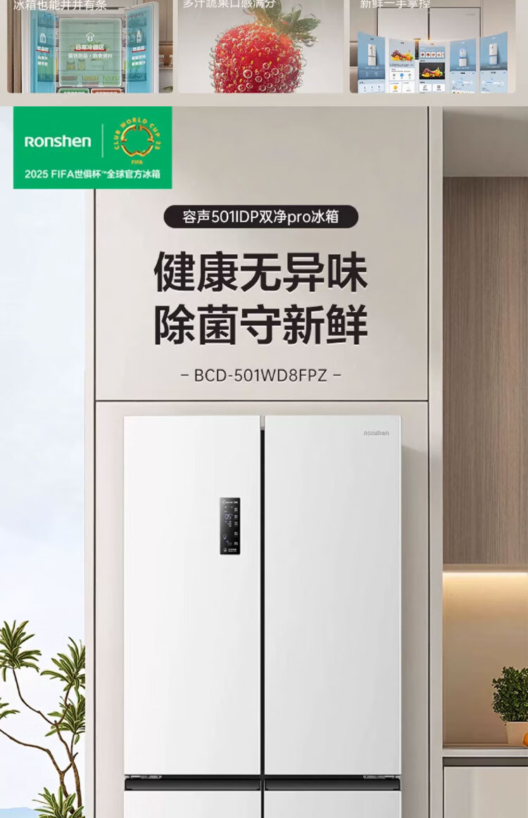 Rongsheng BCD-501WD8FPZ double clean cross-door four-door embedded first-class energy-efficiency frequency conversion ultra-thin active sterilization dual-cycle dual-system smart refrigerator (three-pack machine) official same model - tail cargo machine