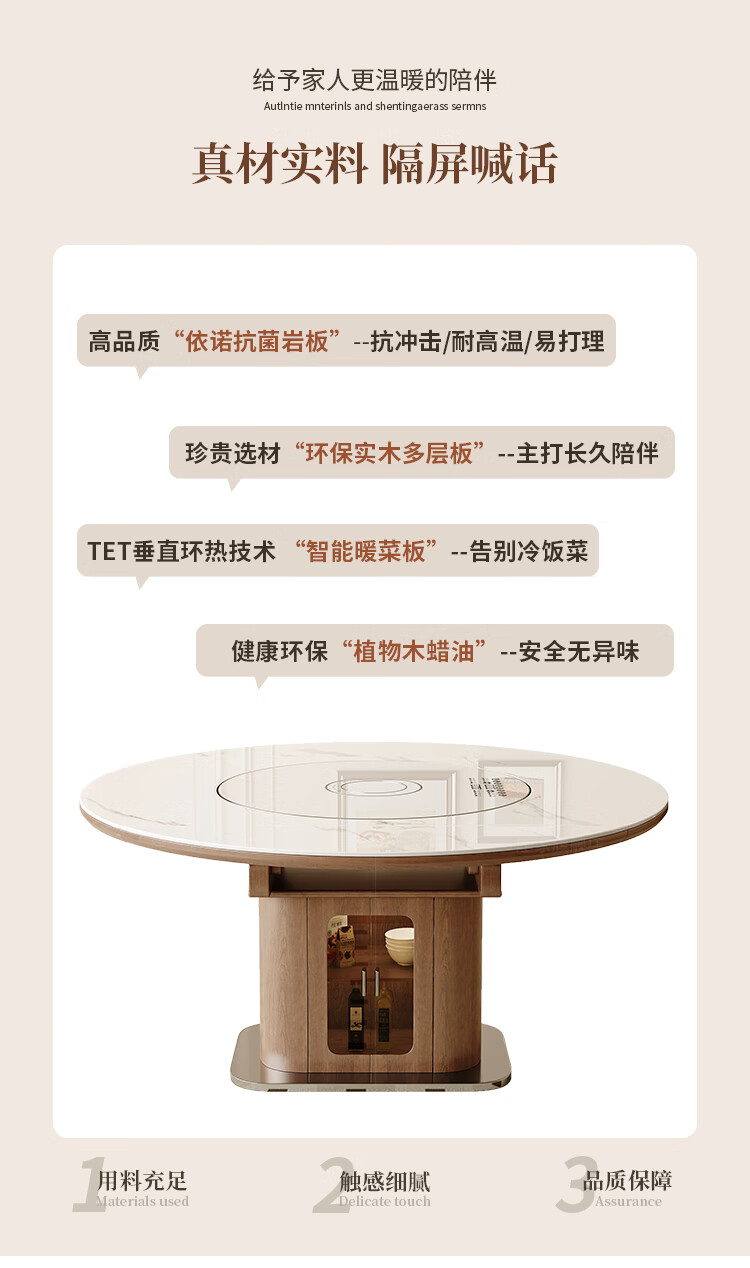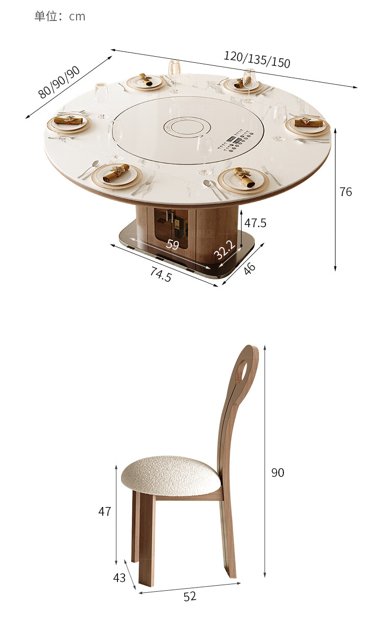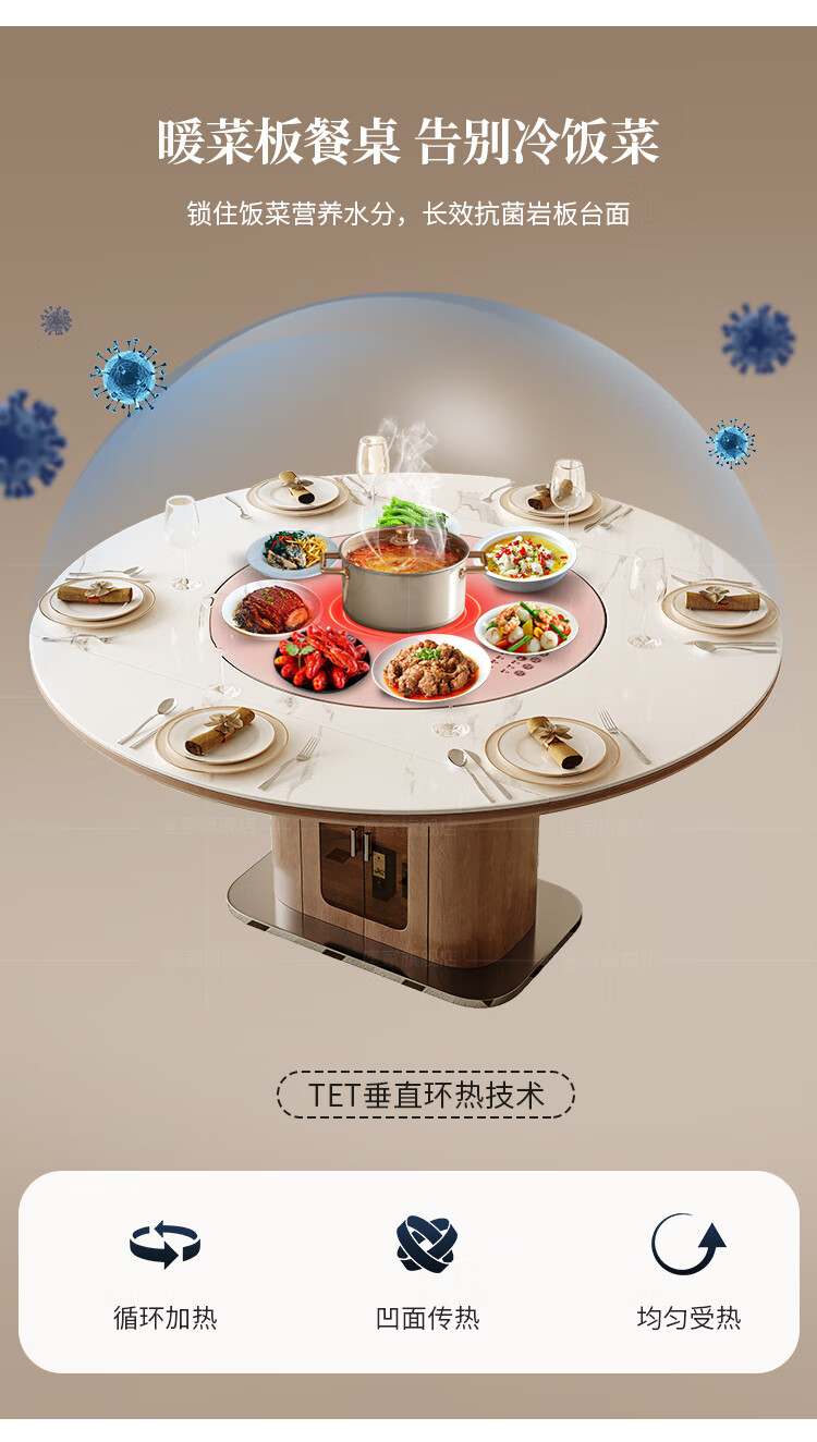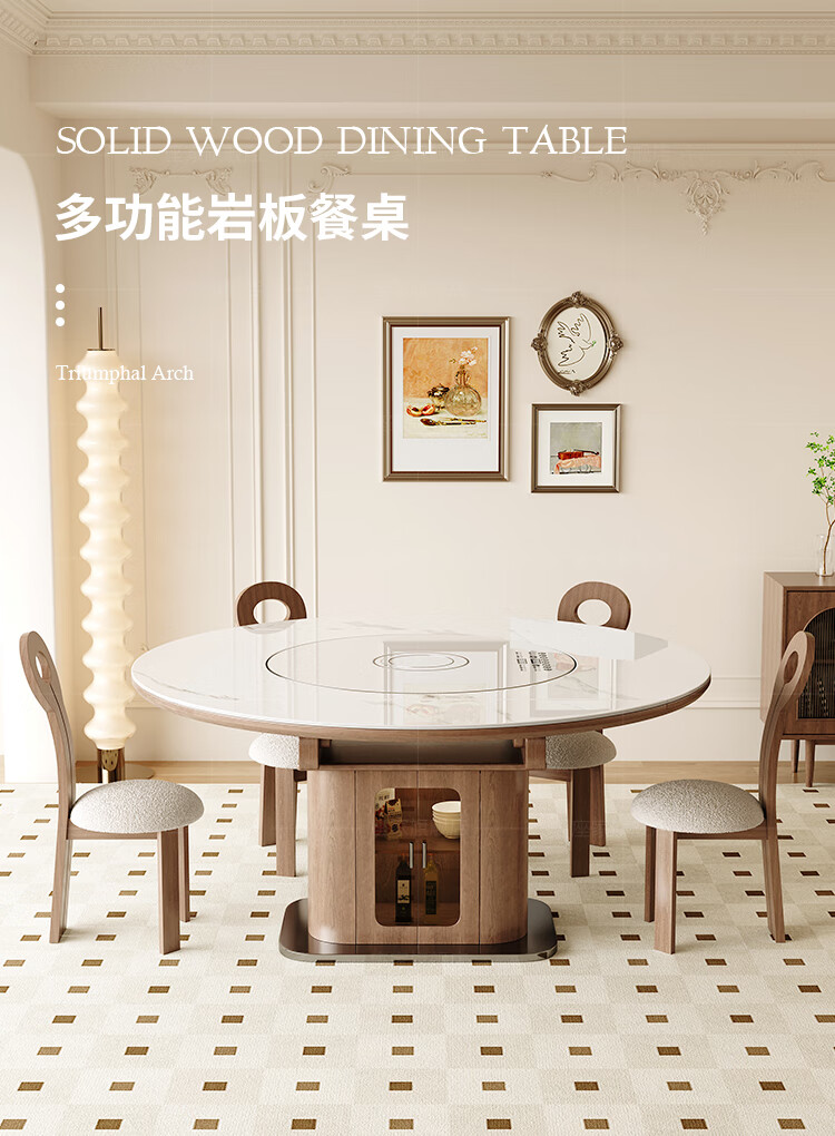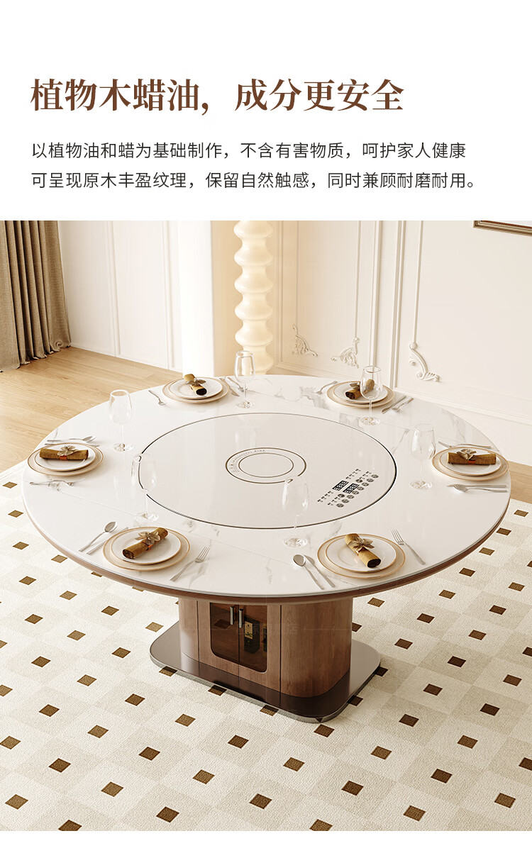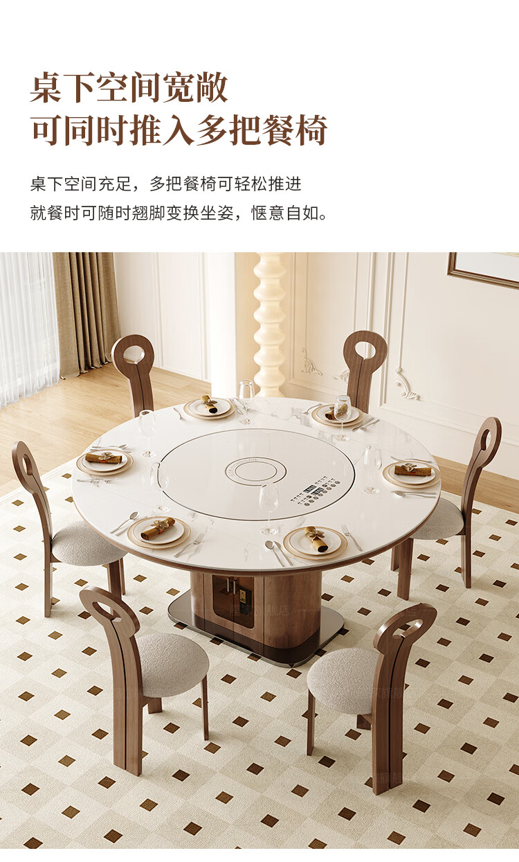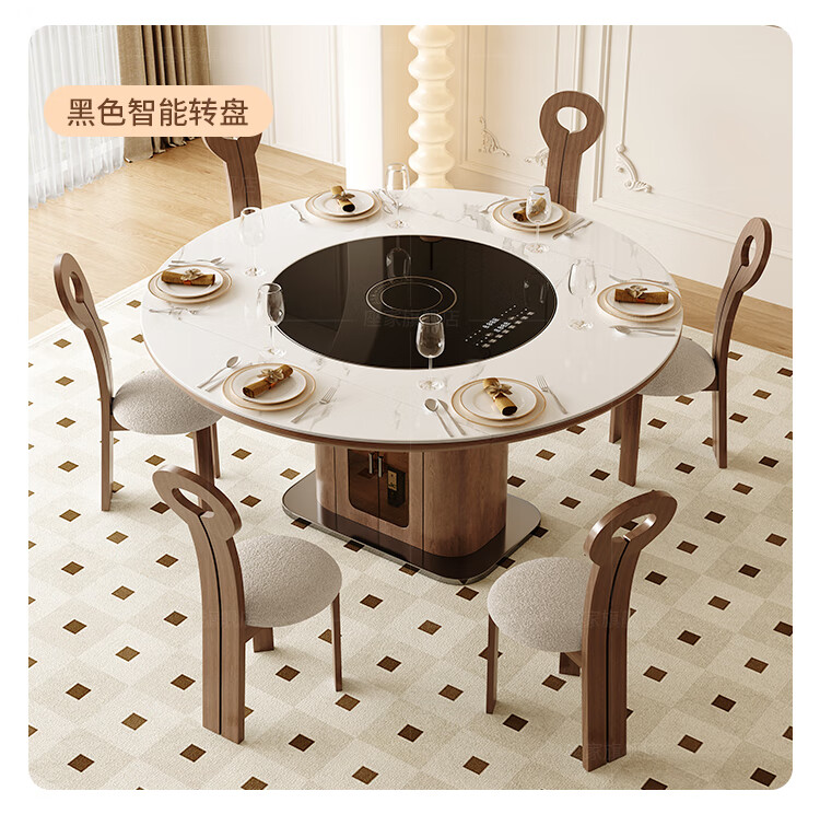 Zuojia solid wood slate smart dining table, light luxury and high-end household small apartment folding dual-purpose retractable round dining table and chairs, single table, hot dishes + induction cooker + electric turntable 1.5m