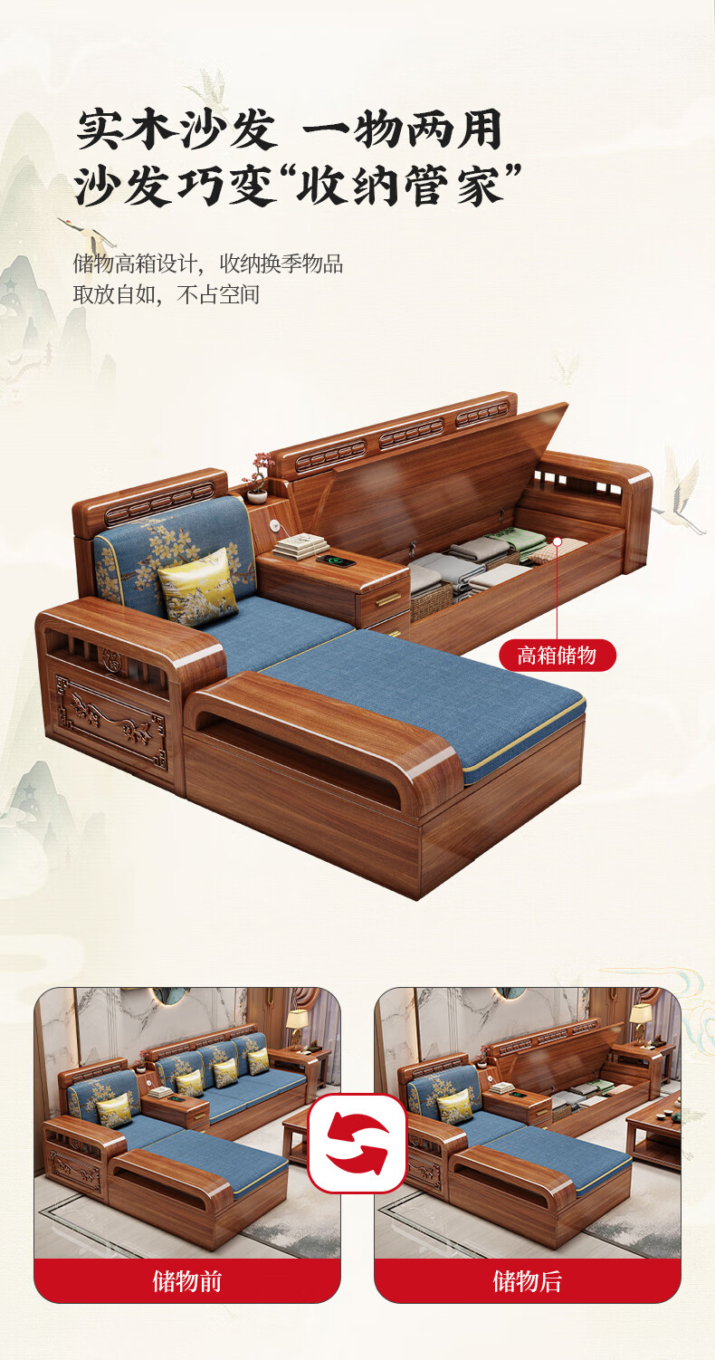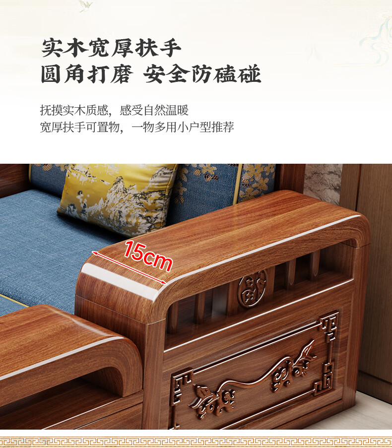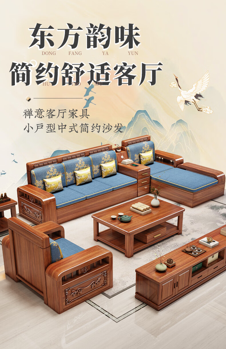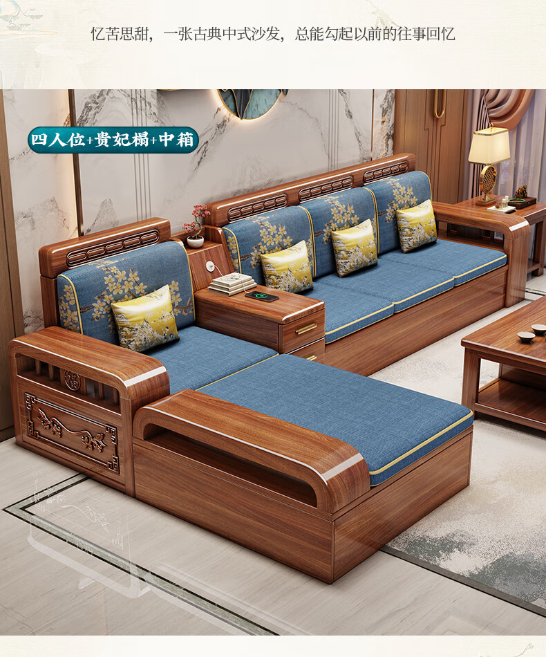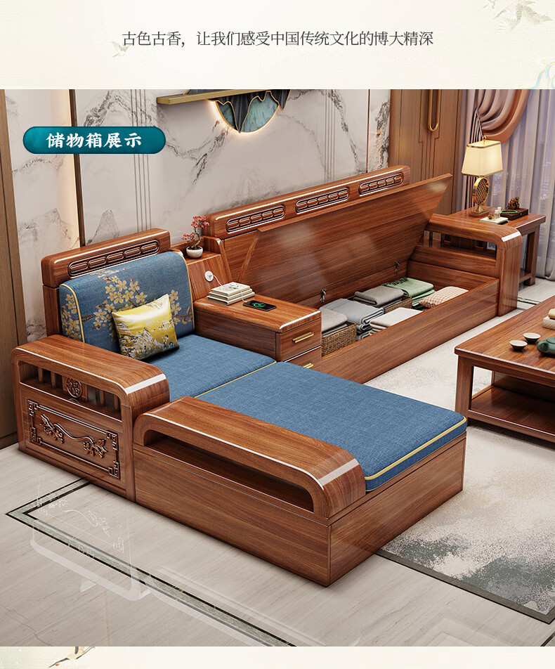 Yuemu Journey Walnut New Chinese Style Solid Wood Sofa Three-Seater Straight Row Small Apartment Winter and Summer Dual-use Storage Sofa Living Room Combination Four-Seater + Coffee Table