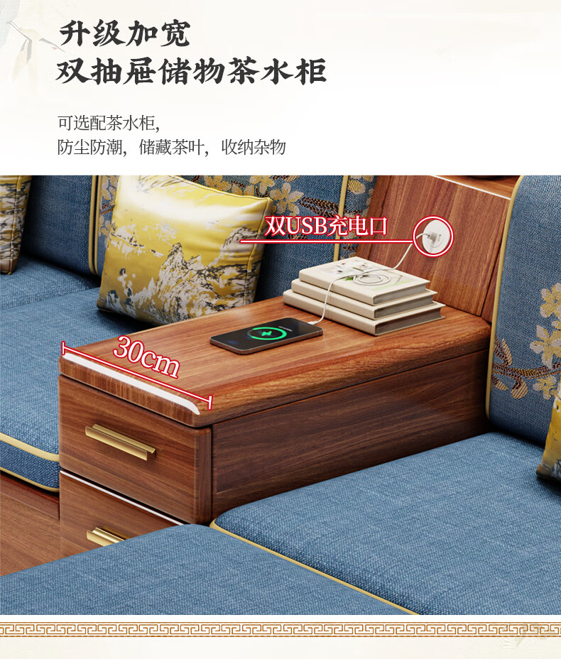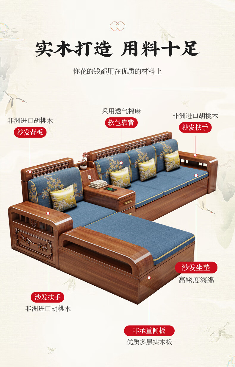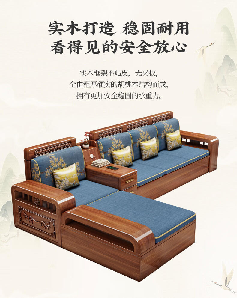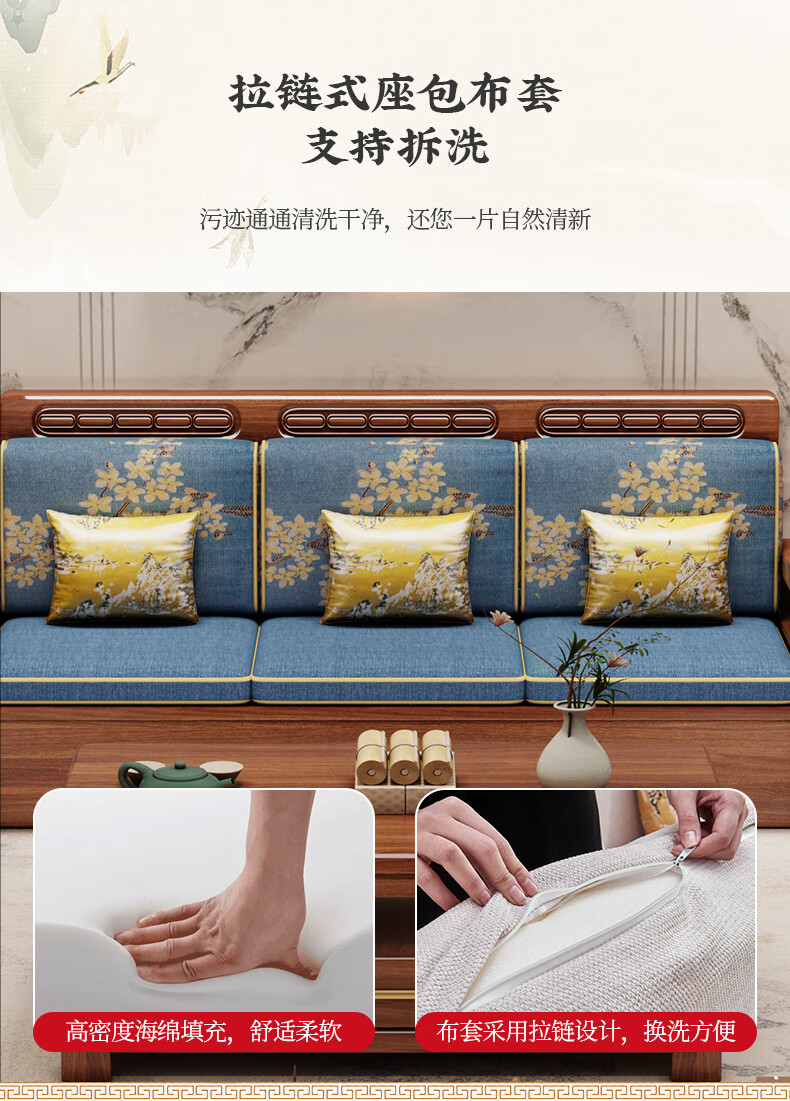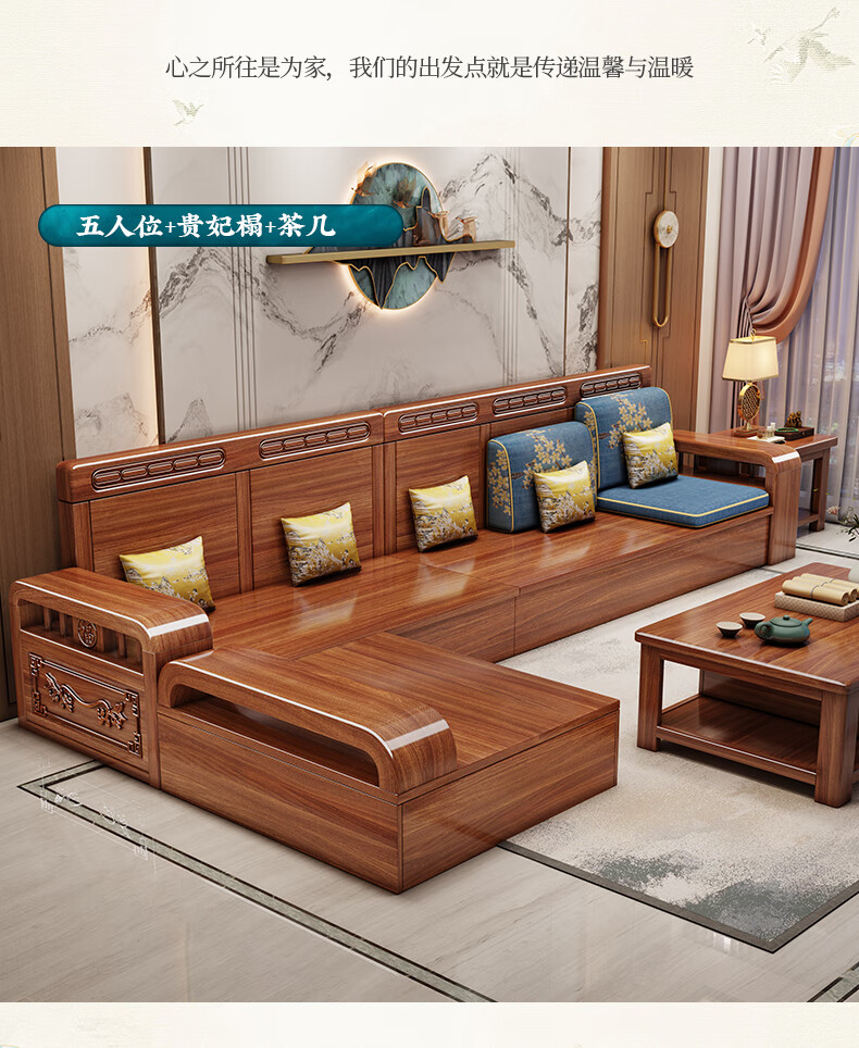 Yuemu Journey Walnut New Chinese Style Solid Wood Sofa Three-Seater Straight Row Small Apartment Winter and Summer Dual-use Storage Sofa Living Room Combination Four-Seater + Coffee Table