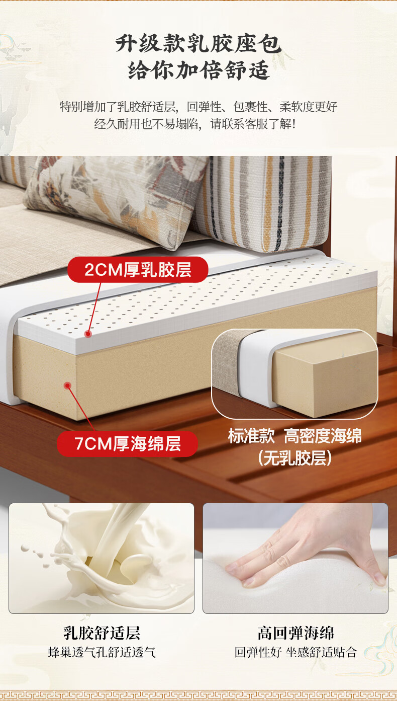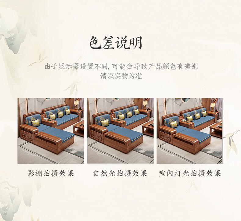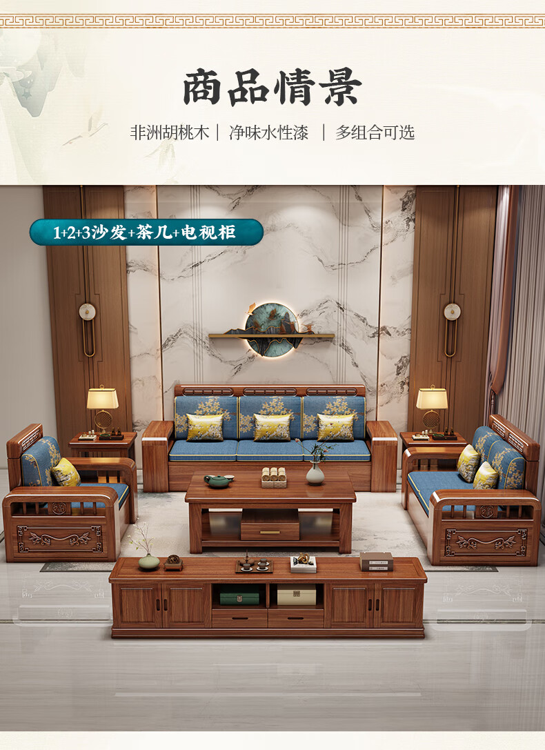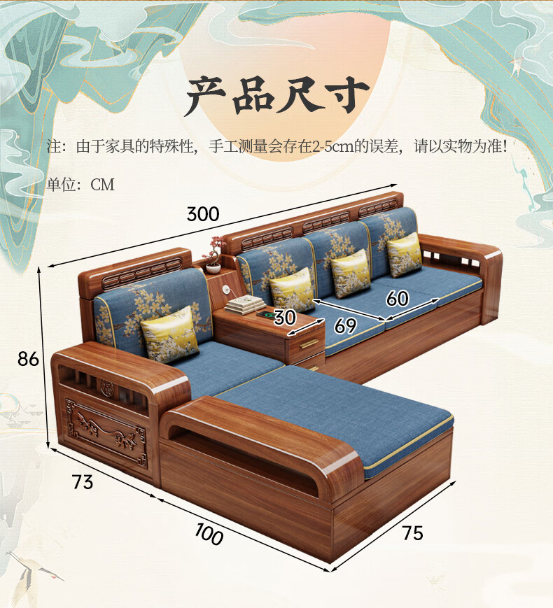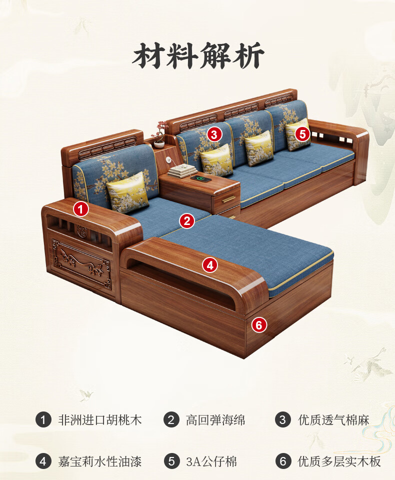 Yuemu Journey Walnut New Chinese Style Solid Wood Sofa Three-Seater Straight Row Small Apartment Winter and Summer Dual-use Storage Sofa Living Room Combination Four-Seater + Coffee Table