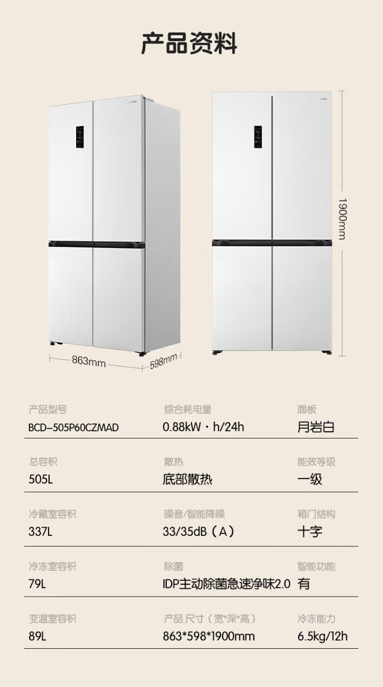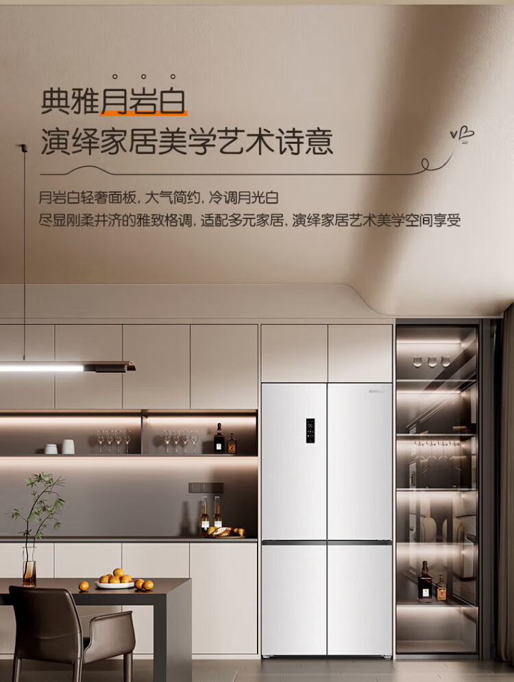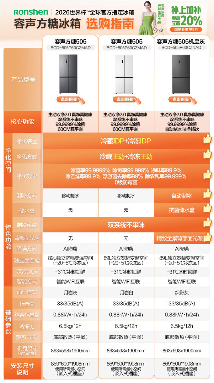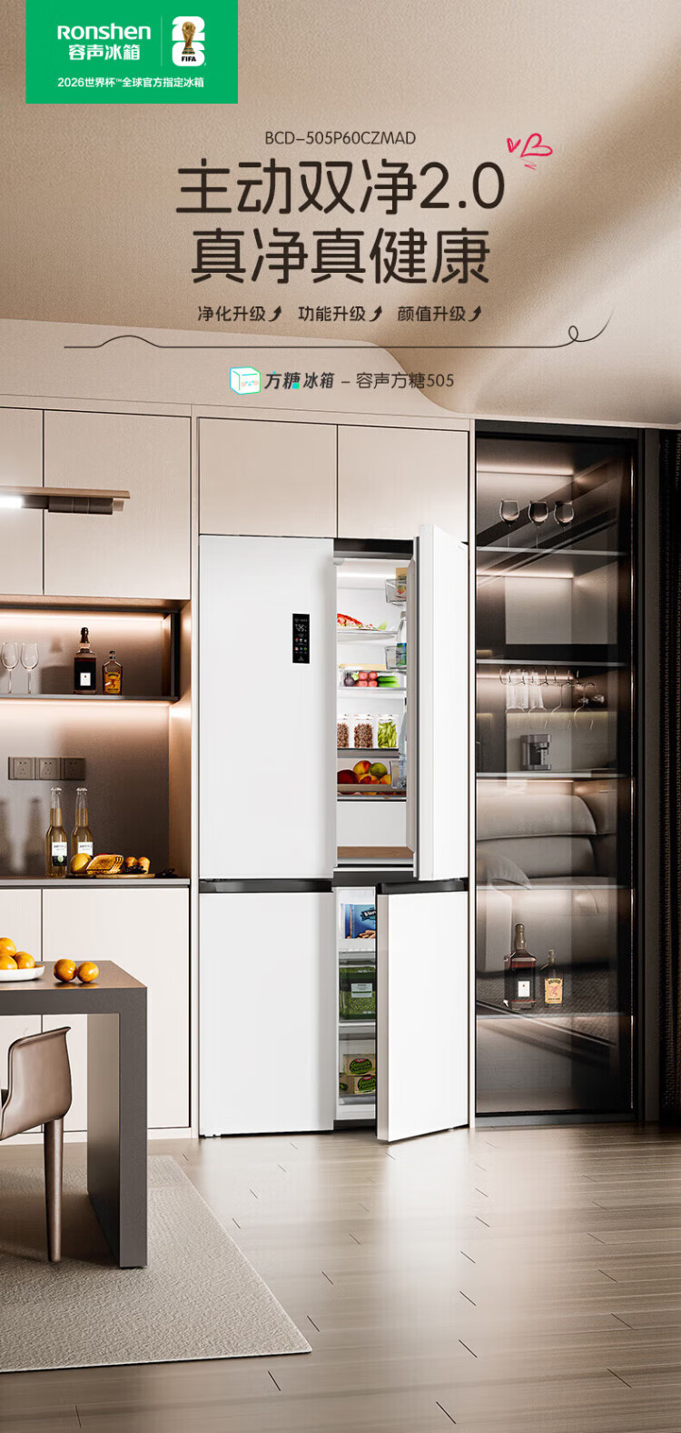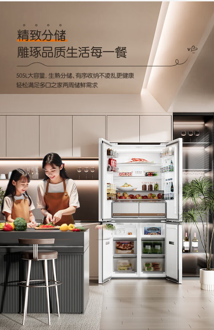 Rongsheng Cube Sugar 505L cross-door refrigerator dual-system cycle active sterilization ultra-thin embedded first-class energy efficiency frost-free large capacity white BCD-505P60CZMAD national subsidy 505 cross-door dual system zero embedded