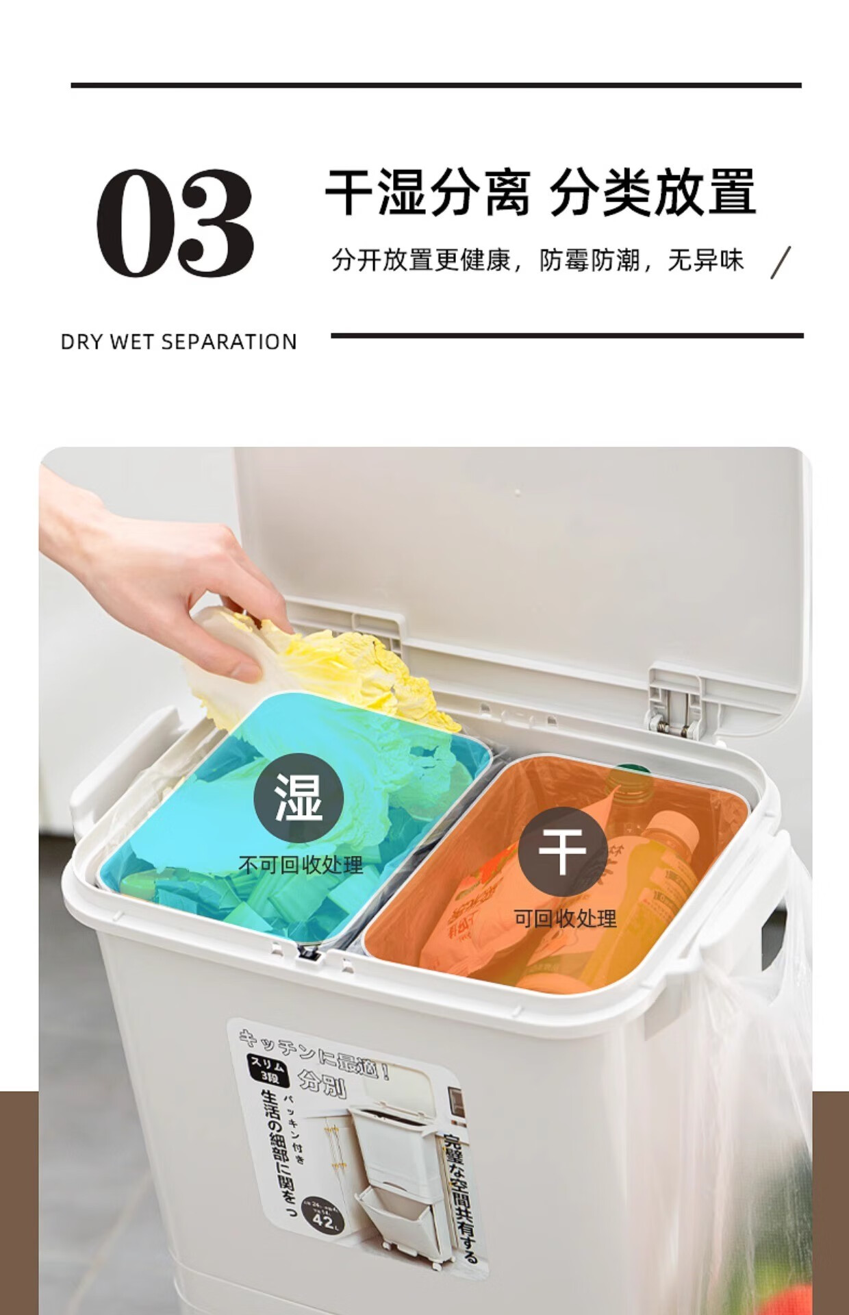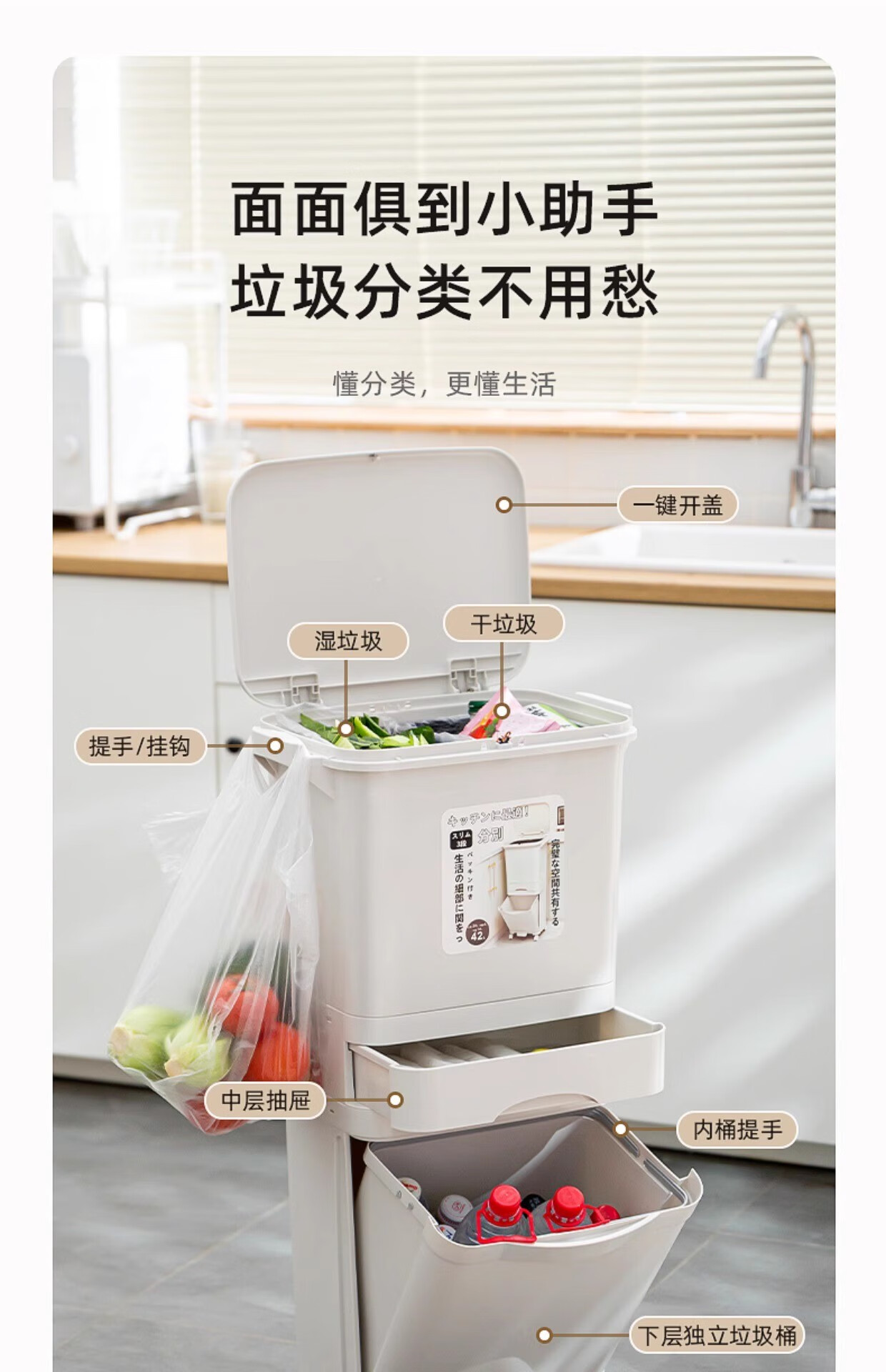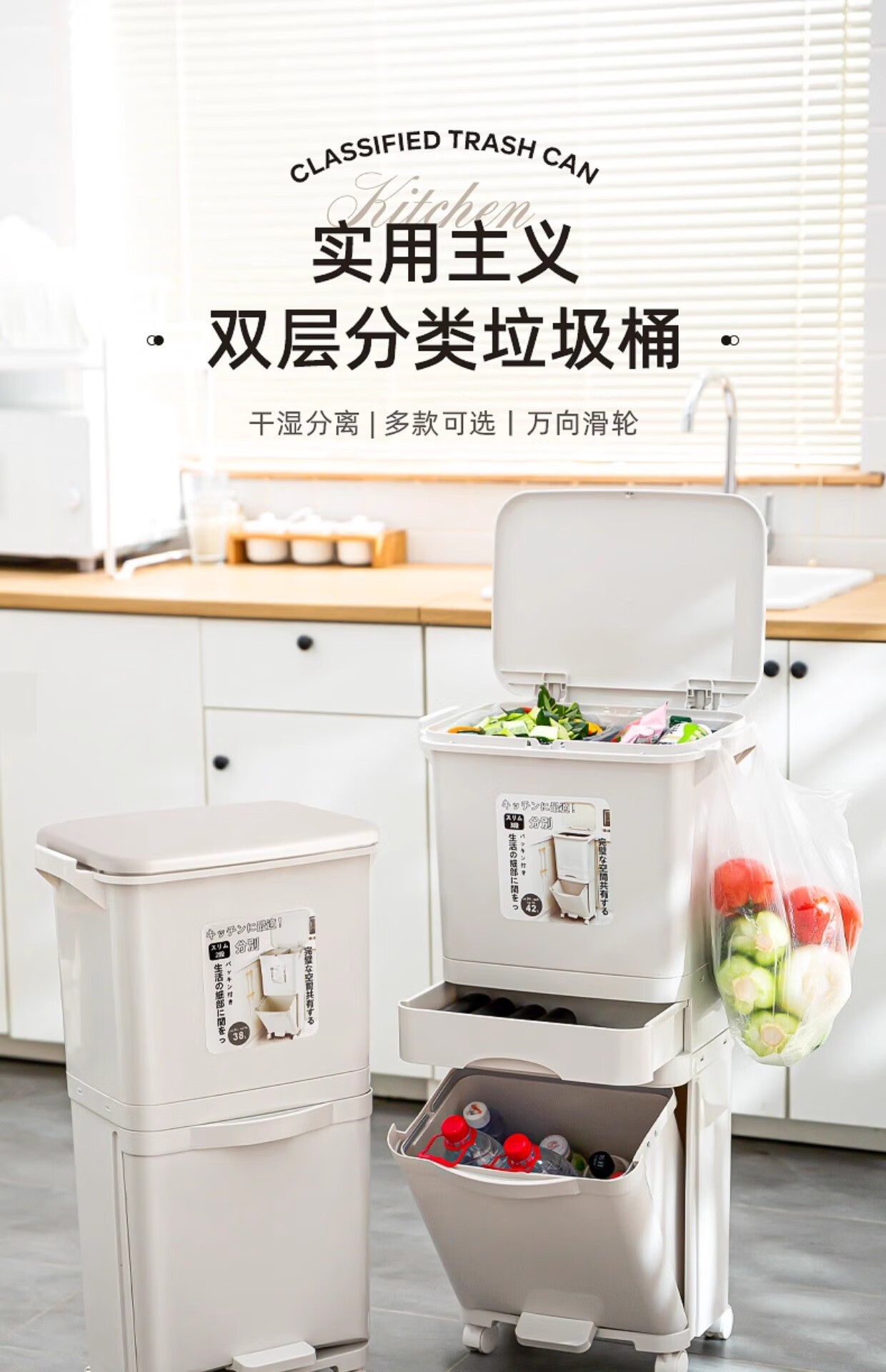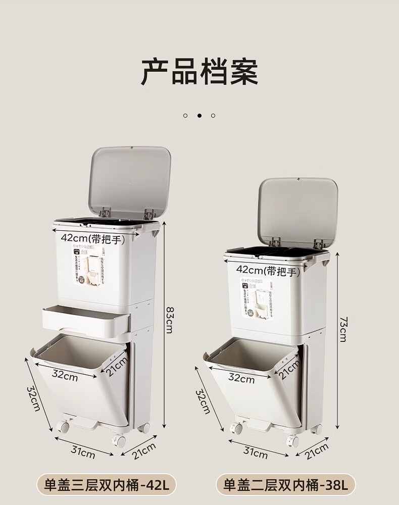 Double three-layer trash can Japanese kitchen classification food waste with lid large large capacity wheel dry and wet separation 38L double 38L double layer single lid manual opening