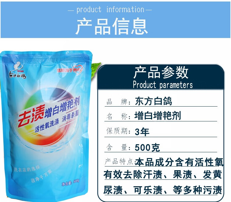 Multi-functional Oriental White Pigeon stain removal, whitening and brightening agent, lazy soaking disinfection, deodorizing washing powder white 1 bag of whitening agent