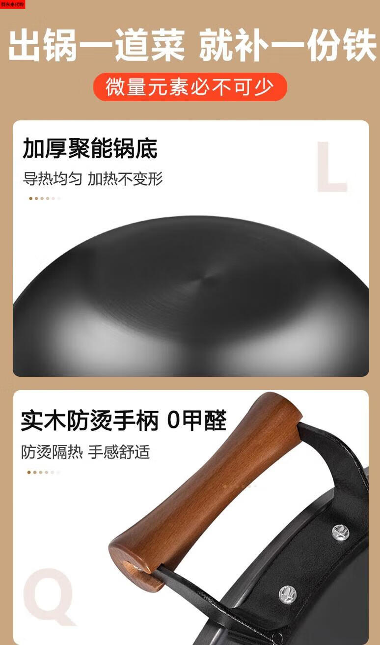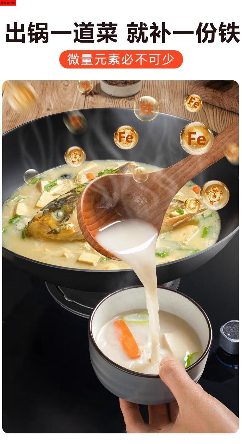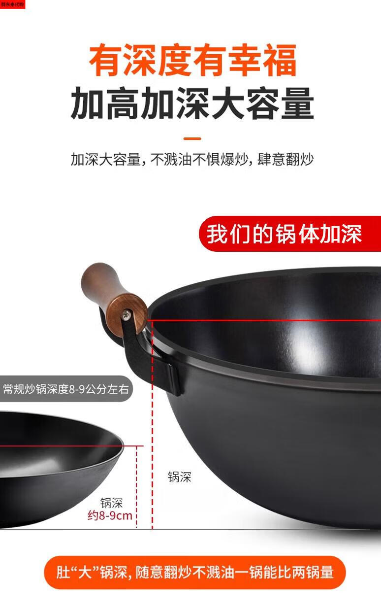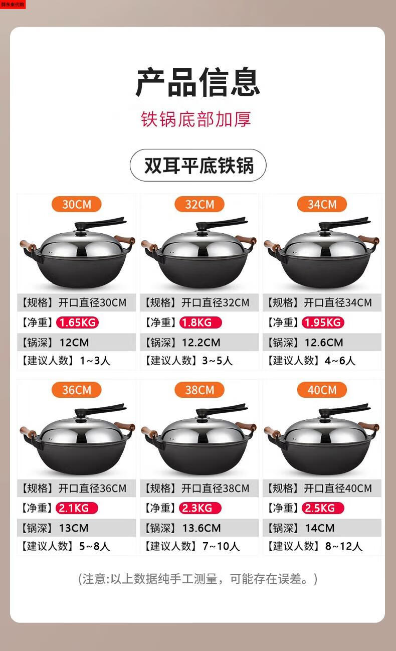 Fat Donglai thickened old-fashioned iron pot and deepened flat-bottomed cooking pot household double-ear cast iron wok induction cooker Fat Donglai same style + erectable steel lid 38cm