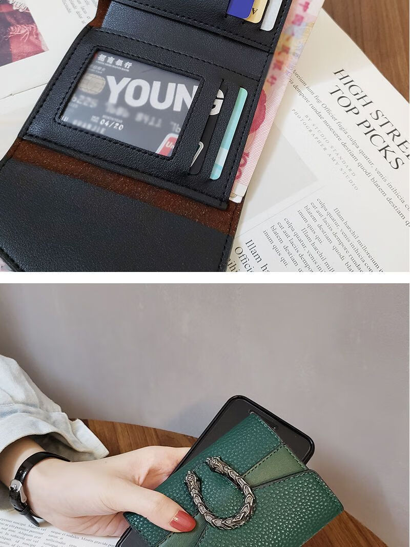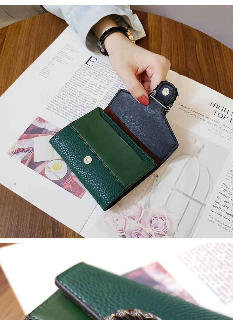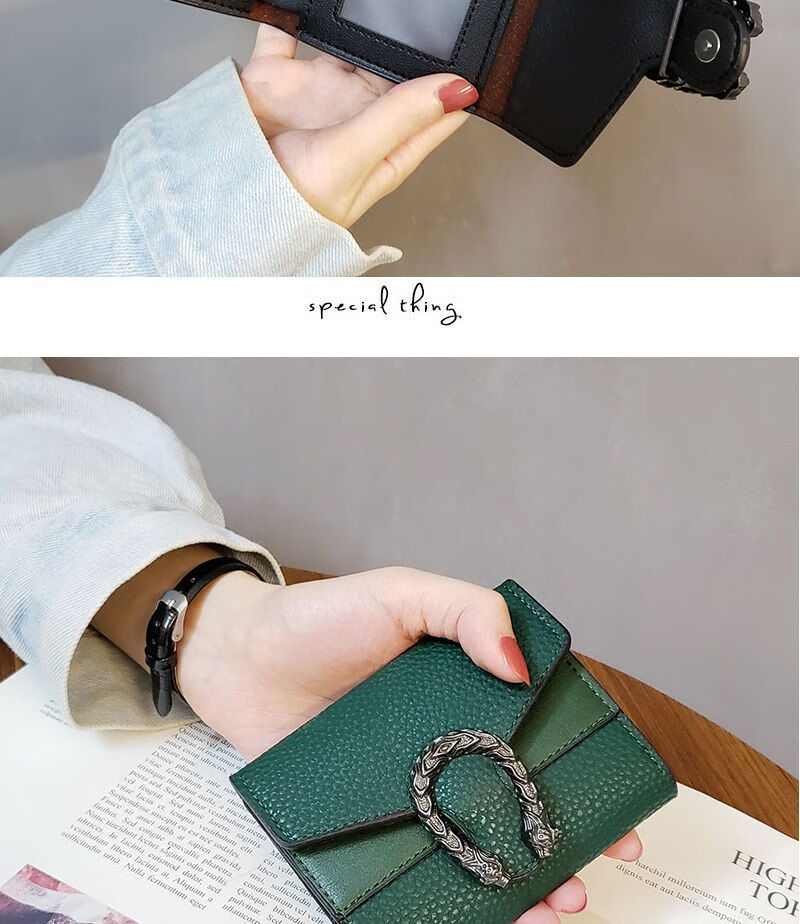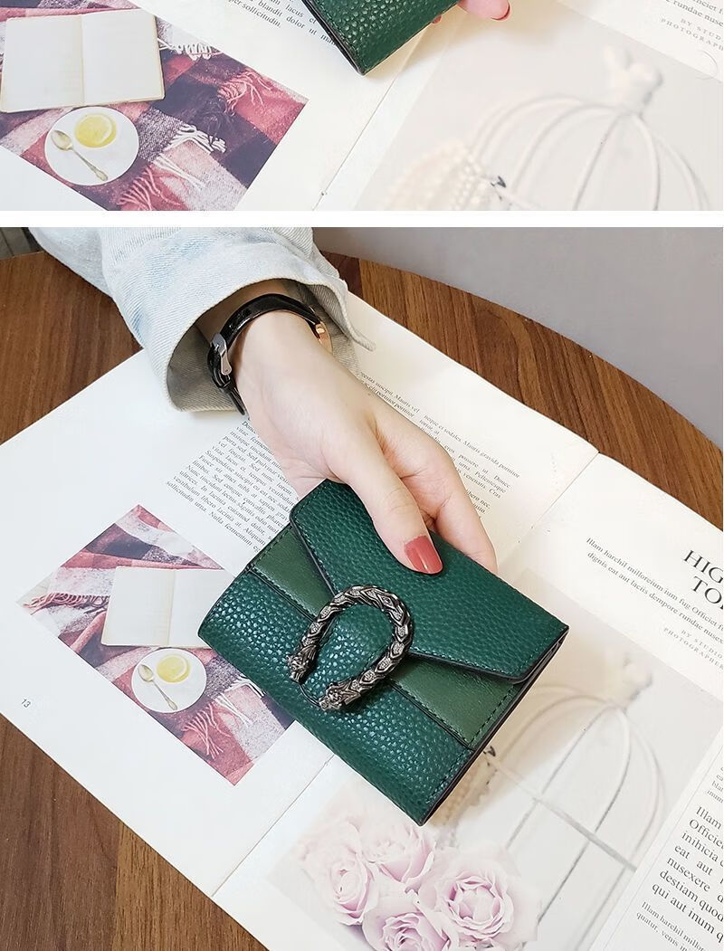 Casa-kupsCKins new European and American solid color Bacchus women's wallet women's short three-fold small wallet women's coin purse card bag leather green (solid color)