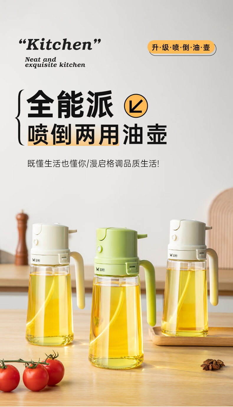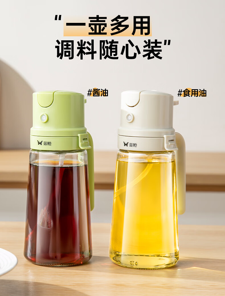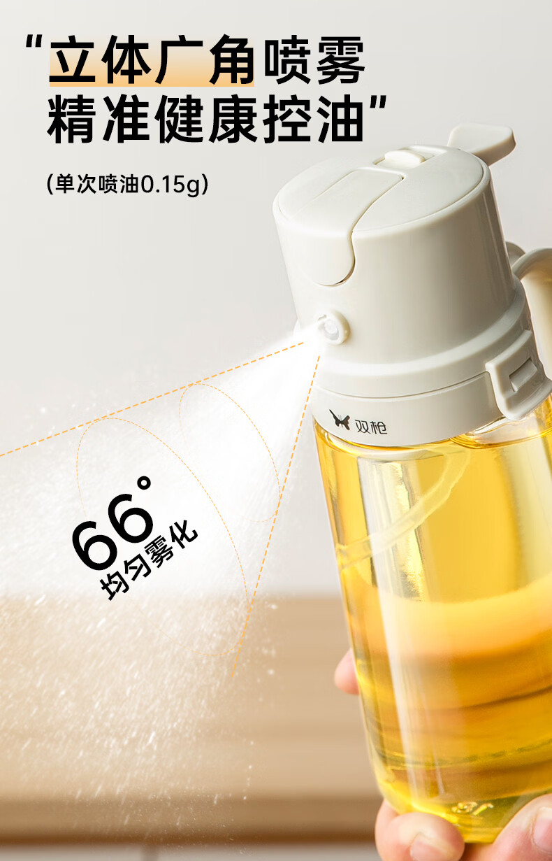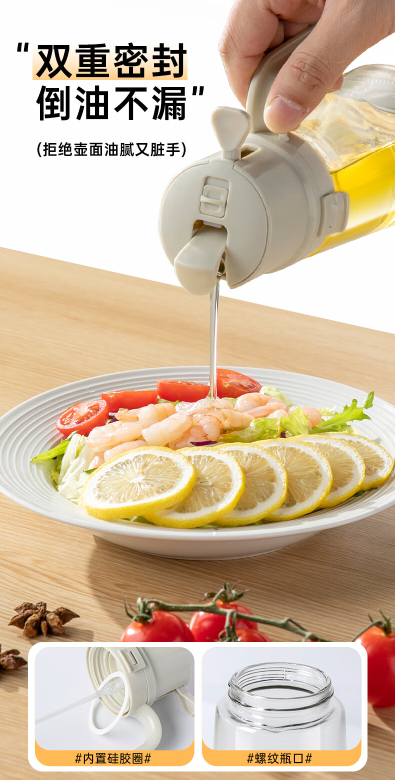 Double gun spray and pour dual-purpose oil bottle household kitchen glass food grade soy sauce vinegar seasoning bottle atomized oil spray bottle oil bottle multifunctional three-in-one ivory white 470ml