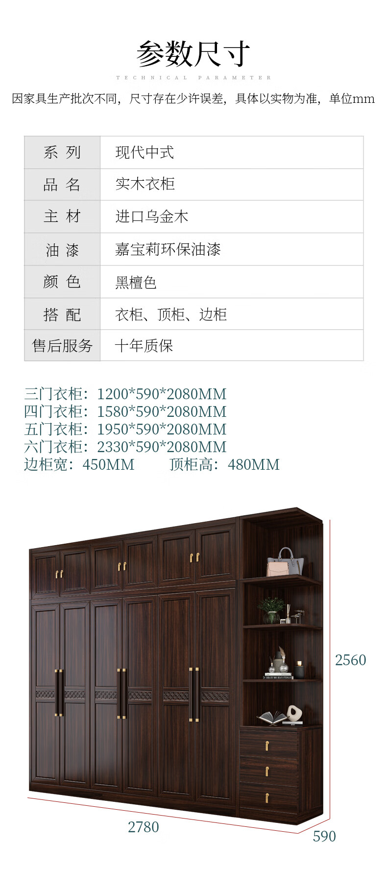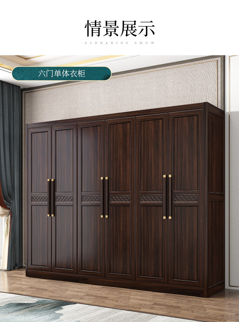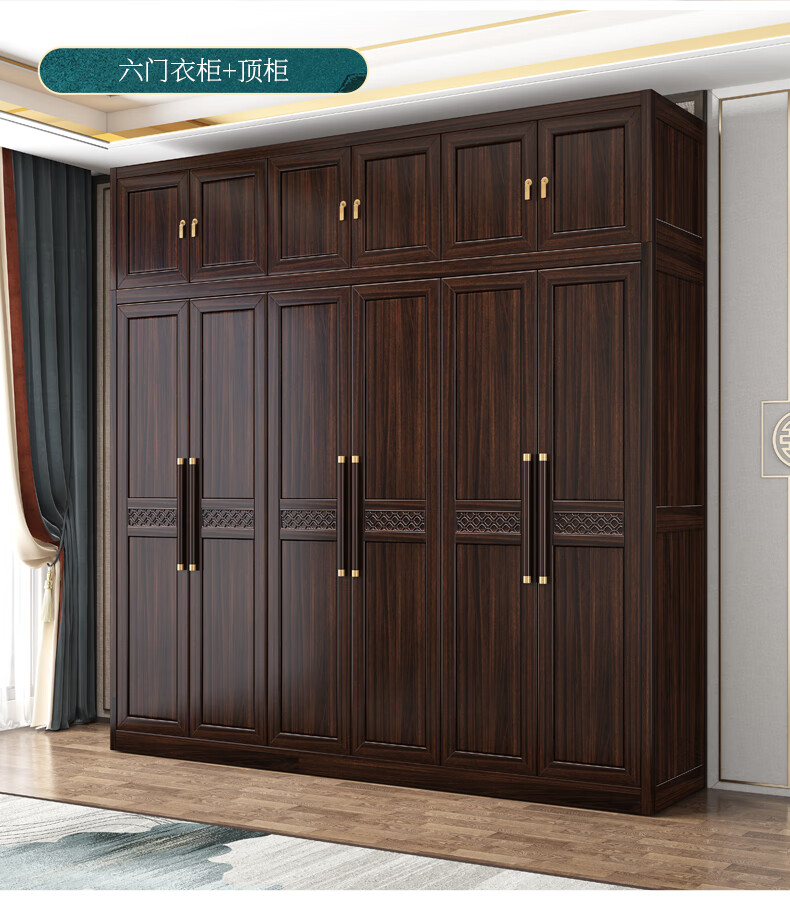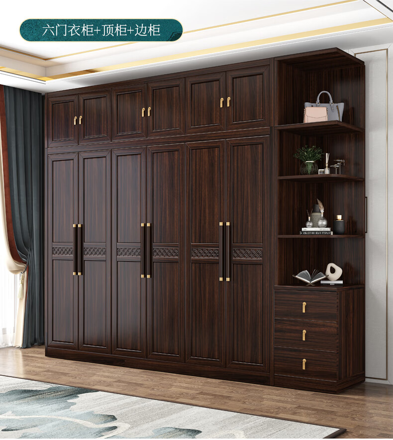 Fanyi Wardrobe New Chinese Style Black Gold Wood Wardrobe Bedroom Cabinet Solid Wood Wardrobe Storage Cabinet Wardrobe Combination Furniture Six Door Wardrobe (With Center Drawer) + Top Cabinet + Side Cabinet Black Gold Wood