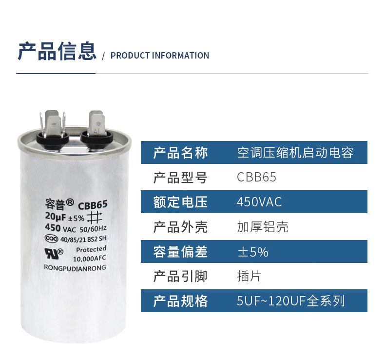 CBB65 air conditioning compressor starting capacitor 6/10/16/20/30/40/50/60/70/80UF/450V 5UF high quality explosion-proof