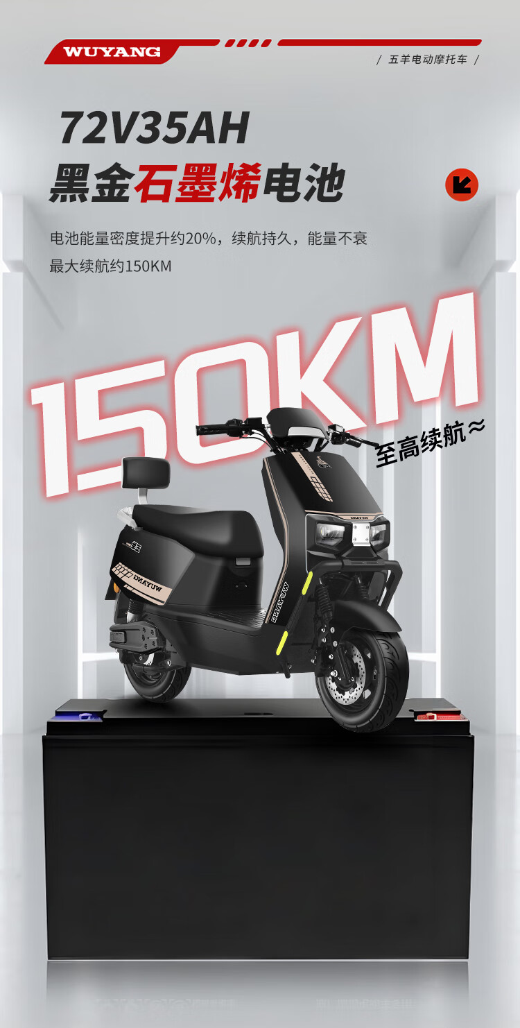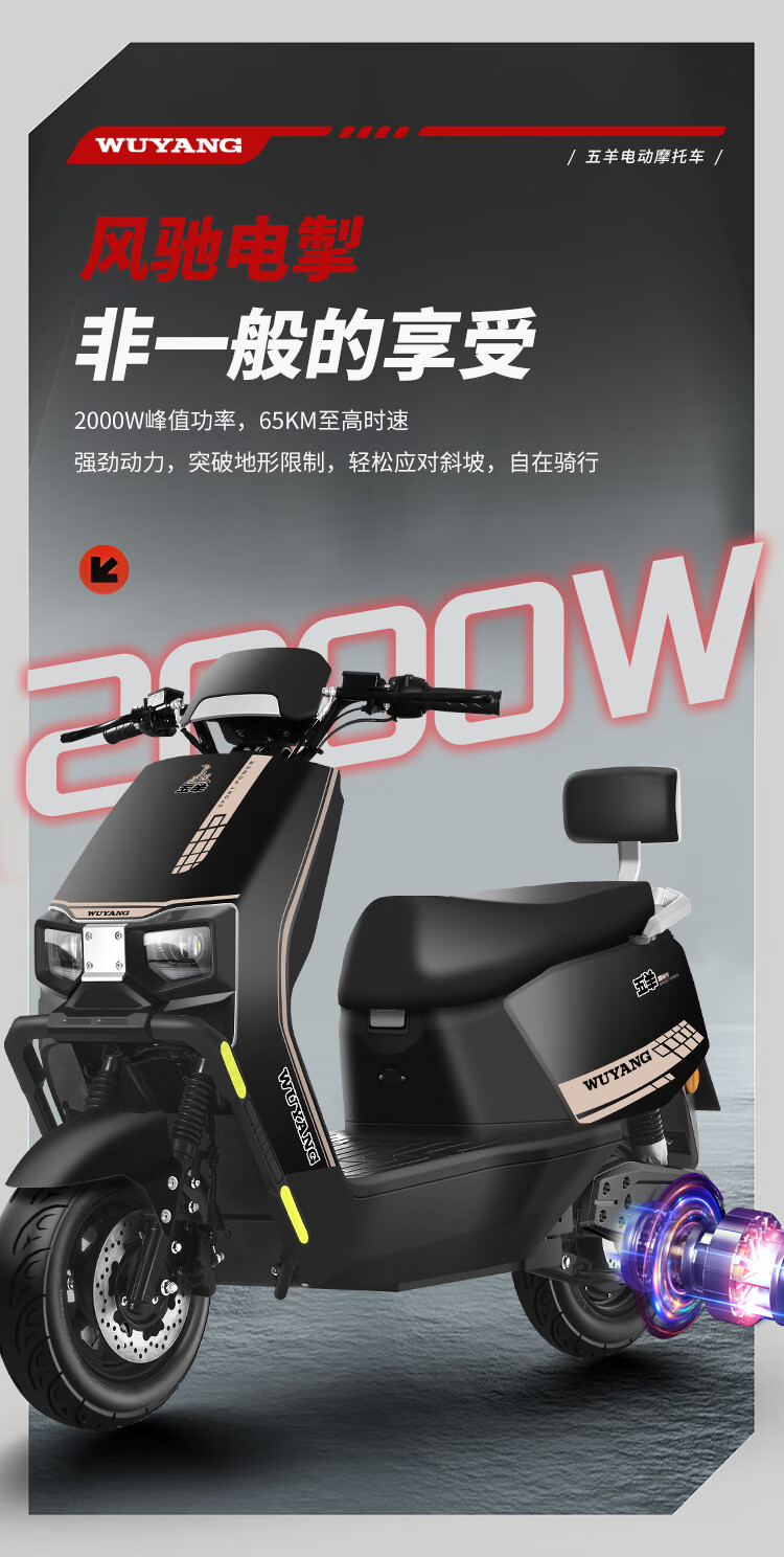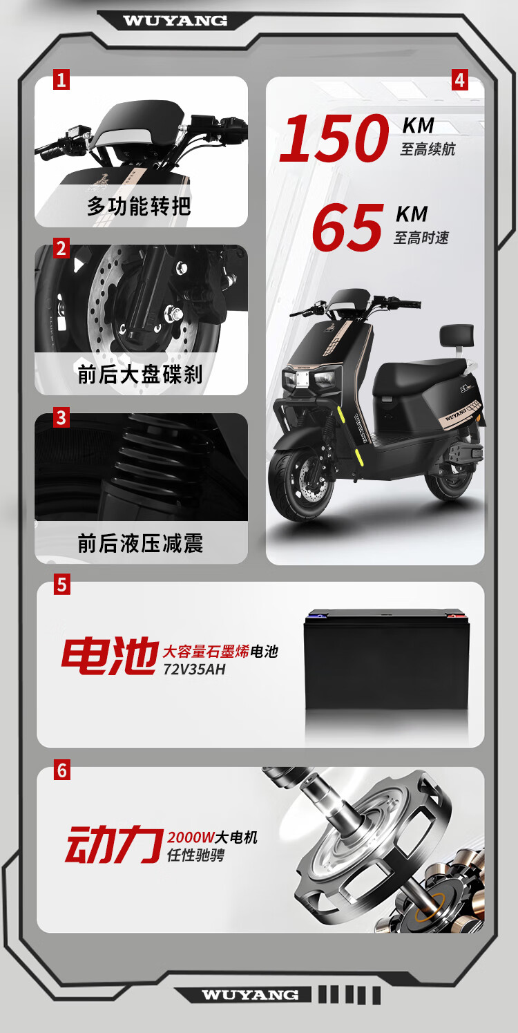Wuyang Official Genuine Electric Motorcycle 2000W High Speed High Power Electric Motorcycle for Men and Women Two Wheeled Electric Motorcycle Mirror Black/Speed 70M/Front and Front Double Discs/Bar Box Version 72V35A/New Graphene Battery/Wooden Frame Shipped