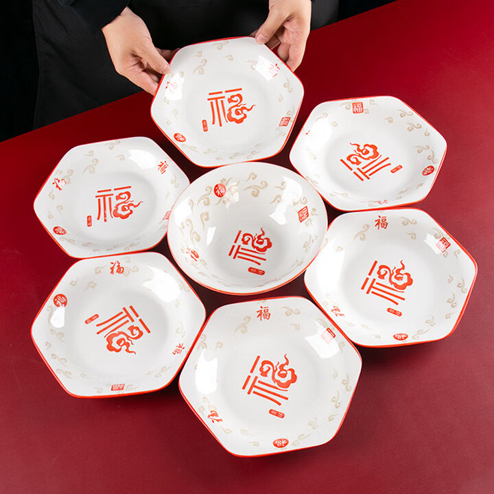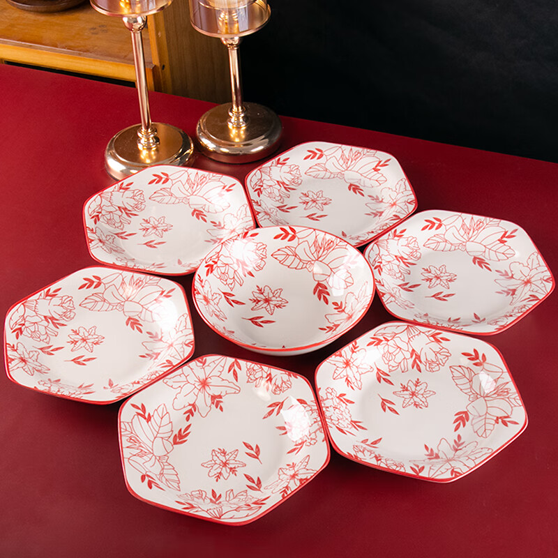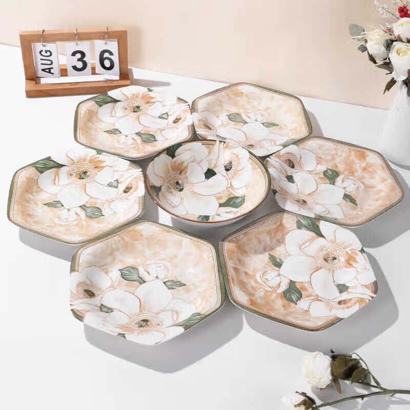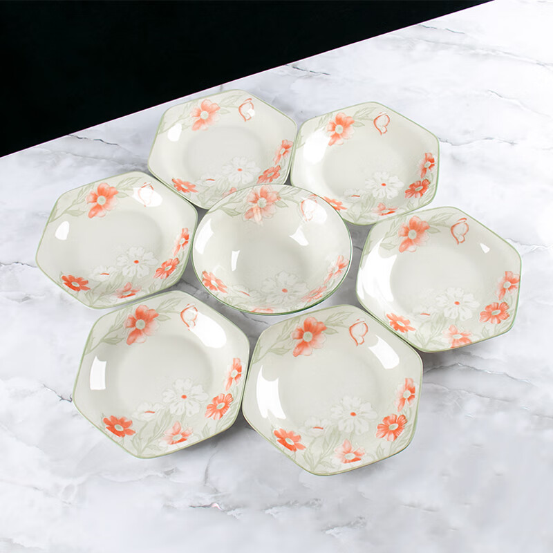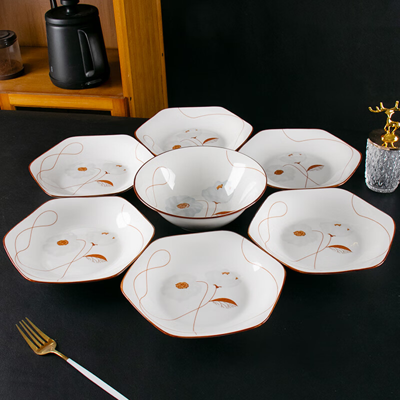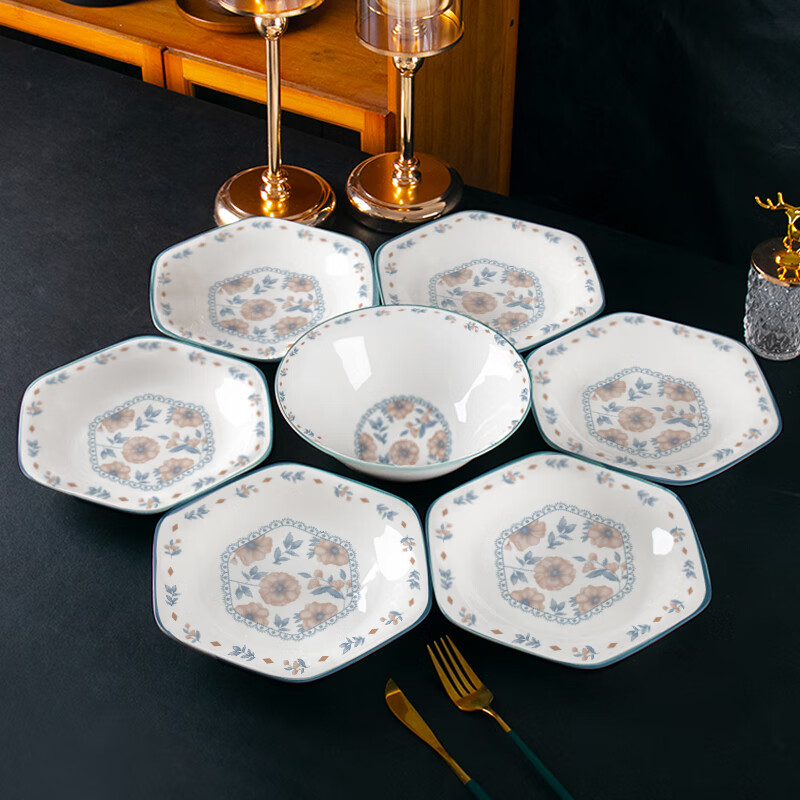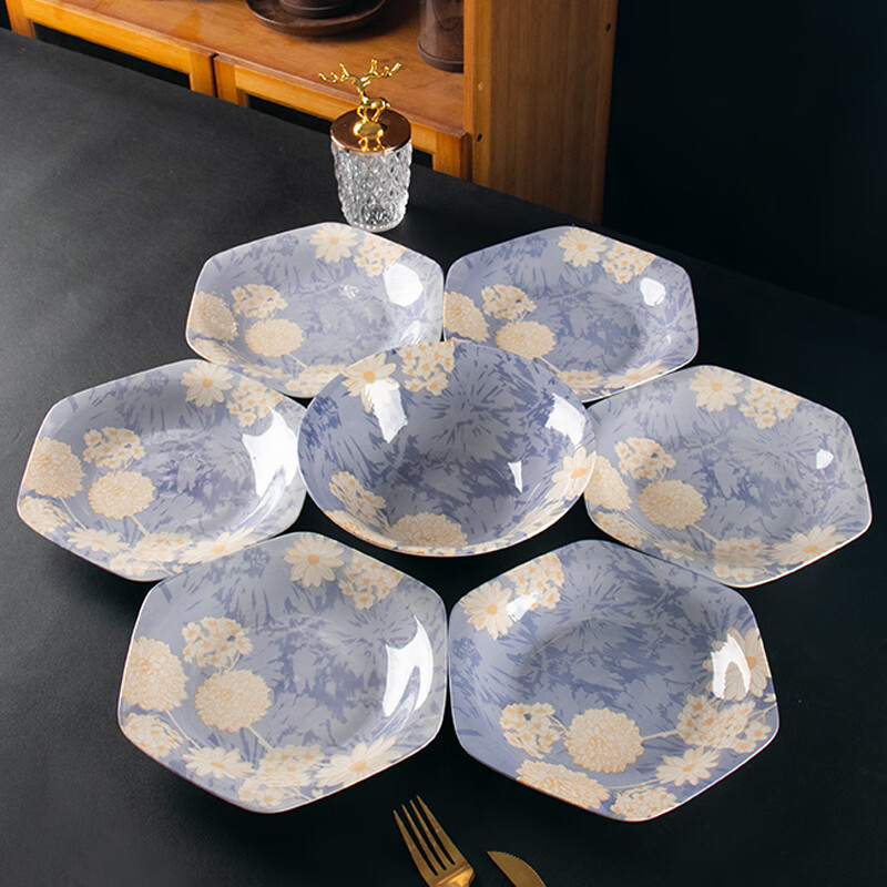 Bowl and dish set household hexagonal platter soup bowl set new high-value ceramic underglaze color tableware bowl and plate set Narcissus series 6+1 set