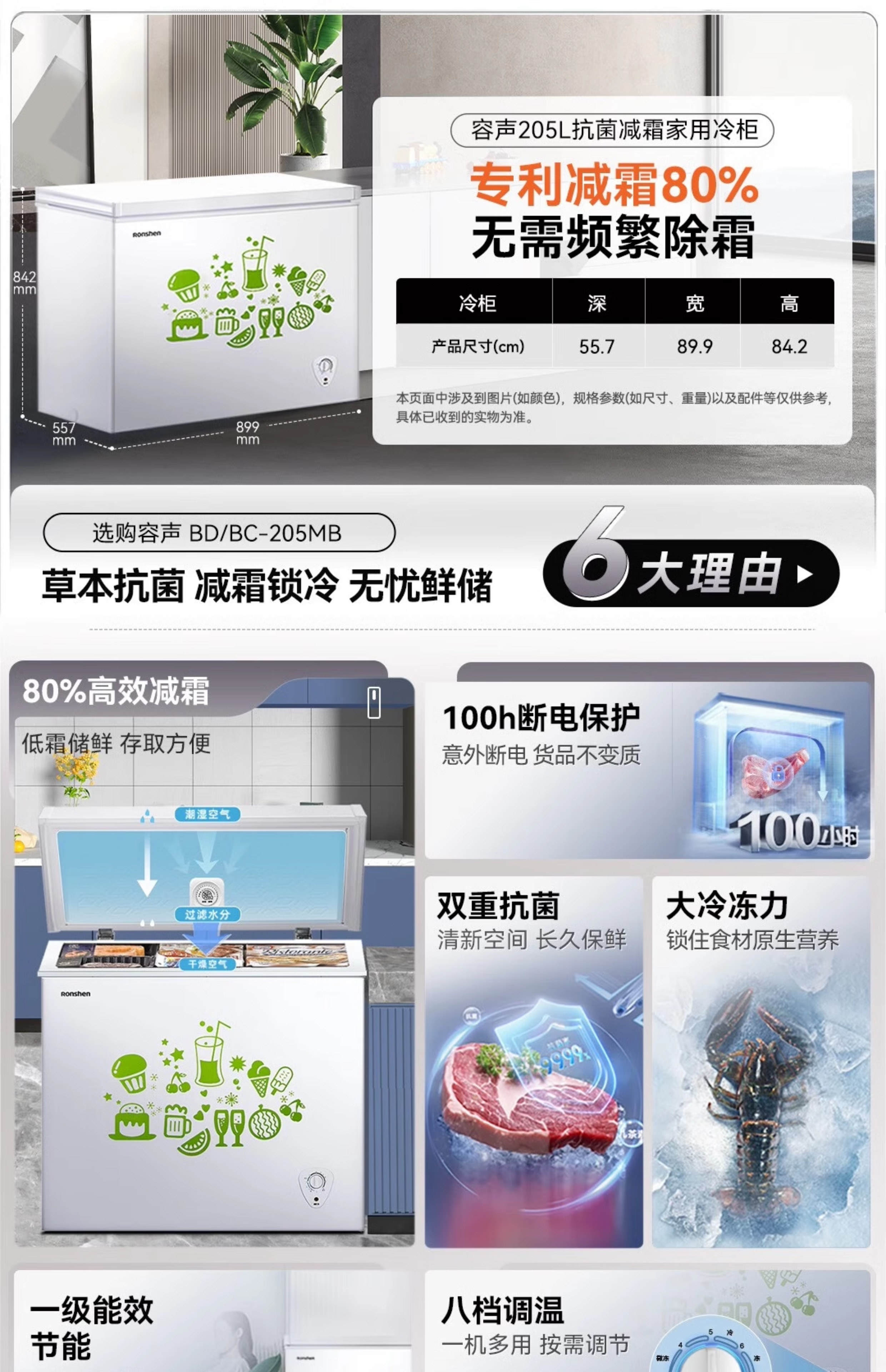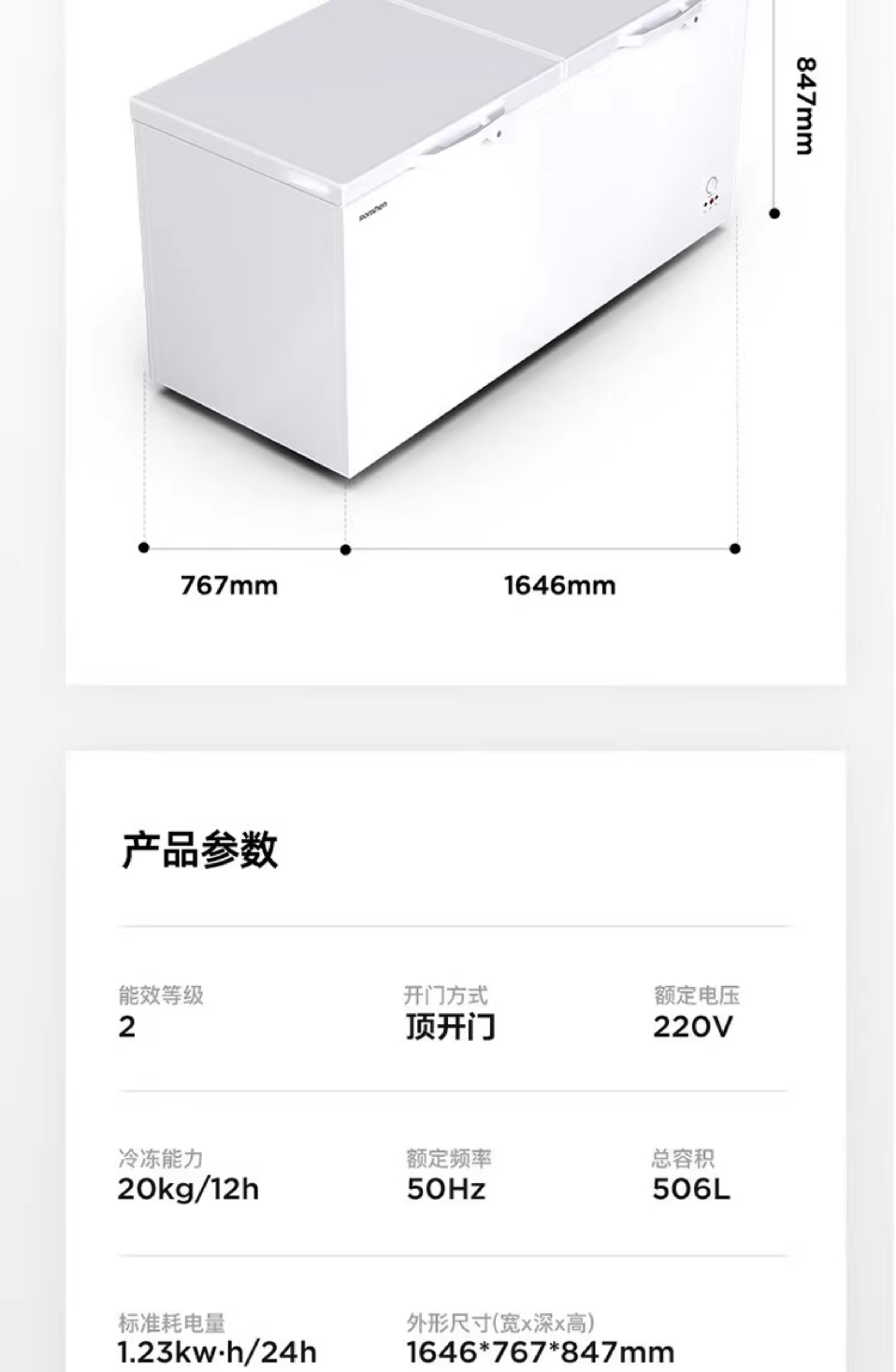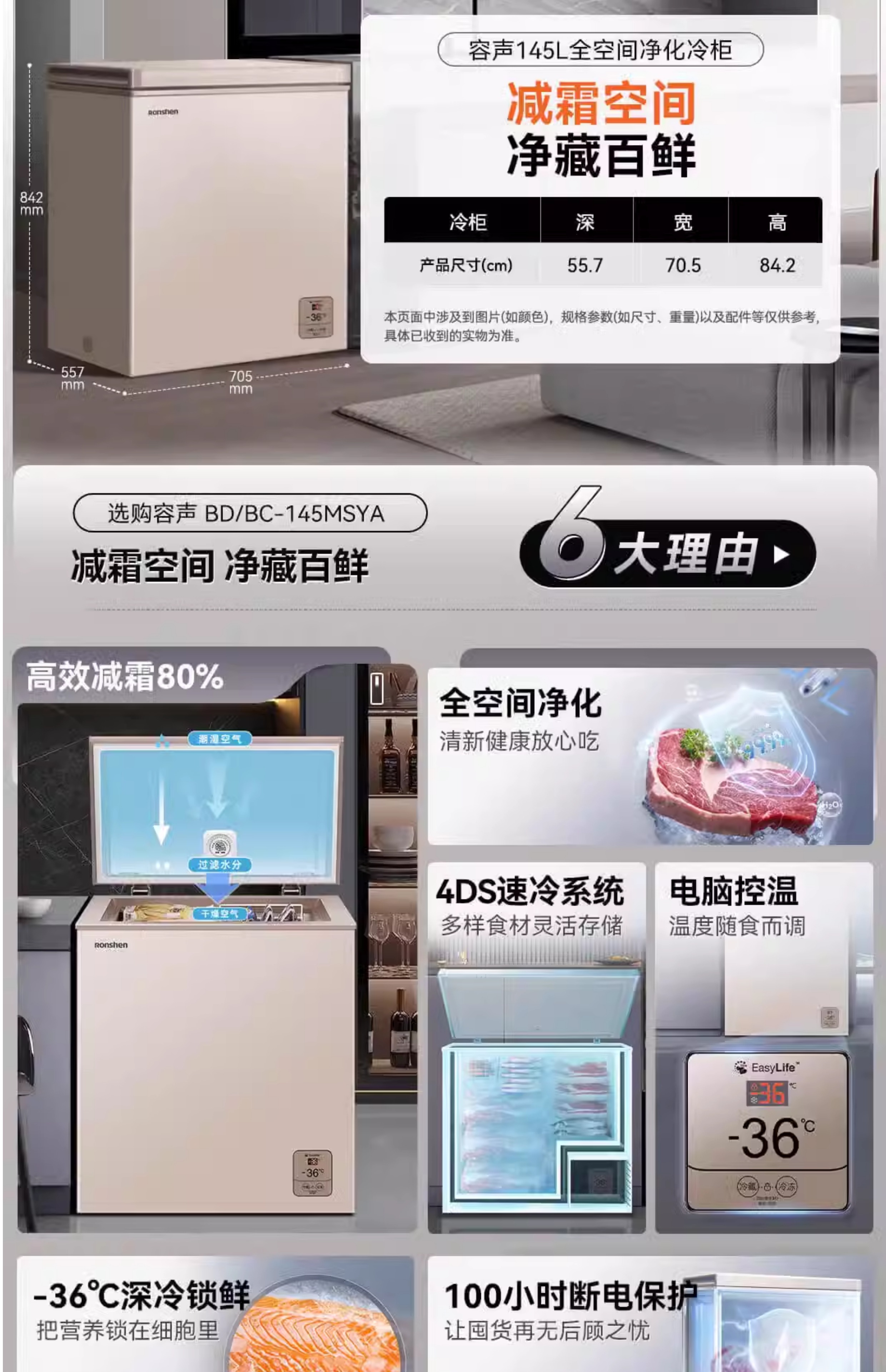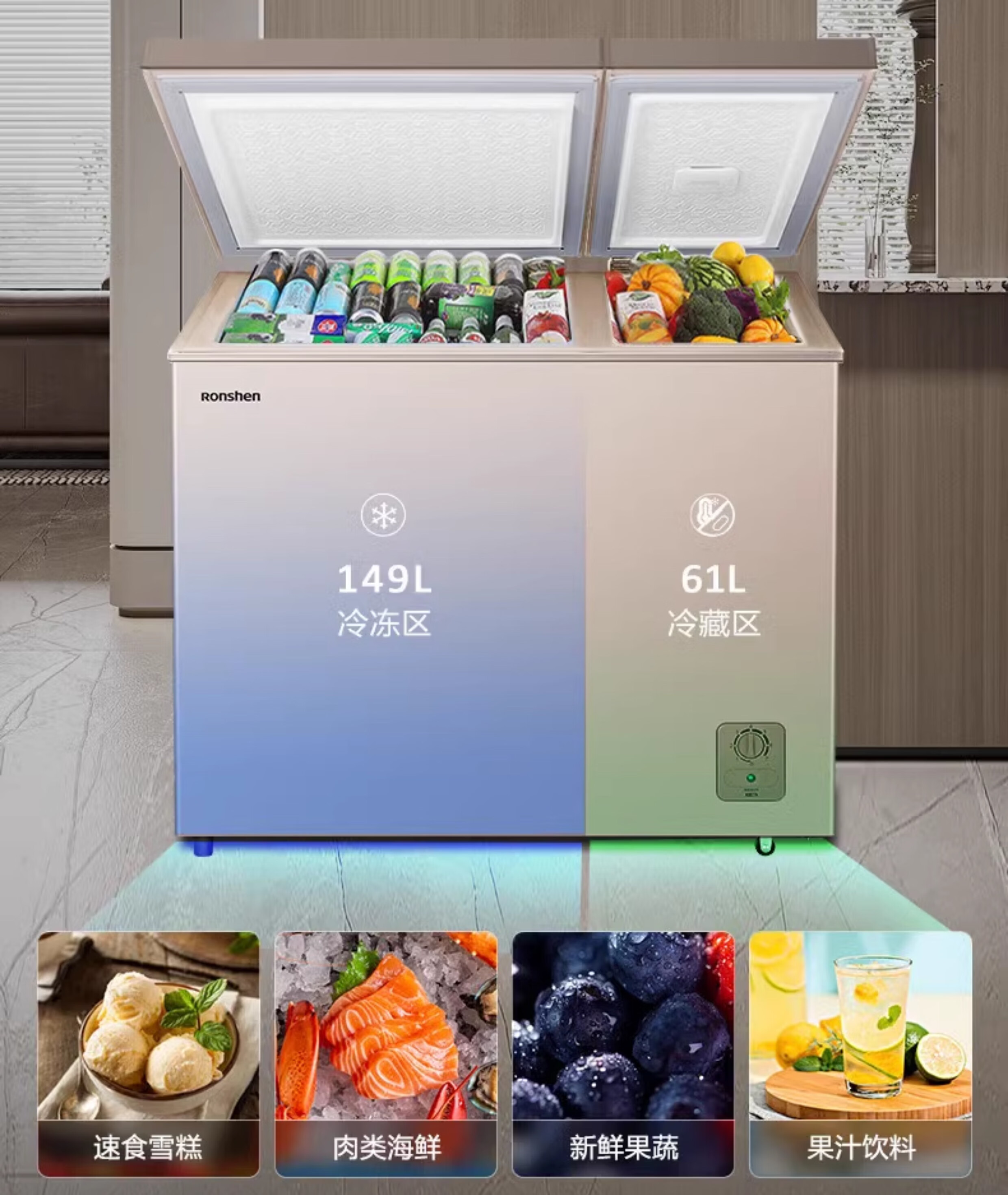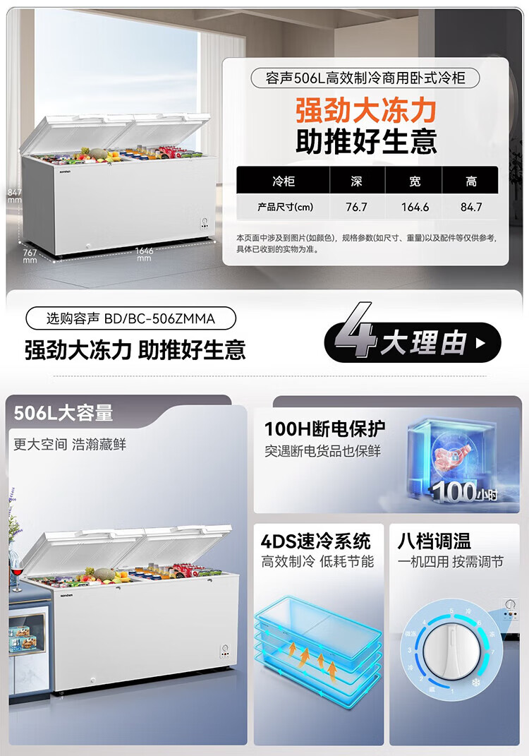 Rongsheng household freezer 143/249/300/506 liters 1.64 meters long horizontal single temperature/dual temperature energy-saving frost-reducing freezer single temperature 506L -36 degrees deep cold fresh-locking freezer