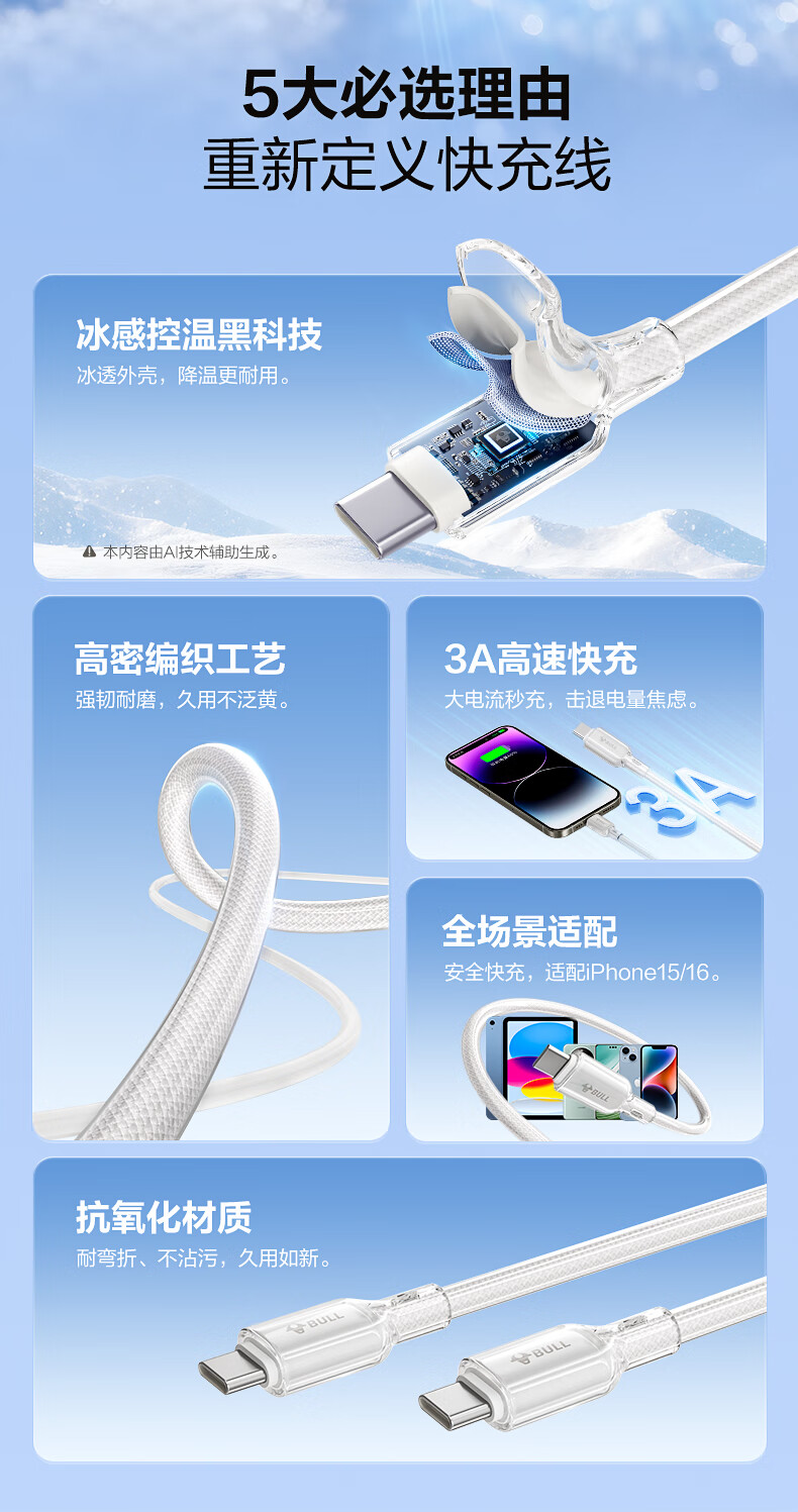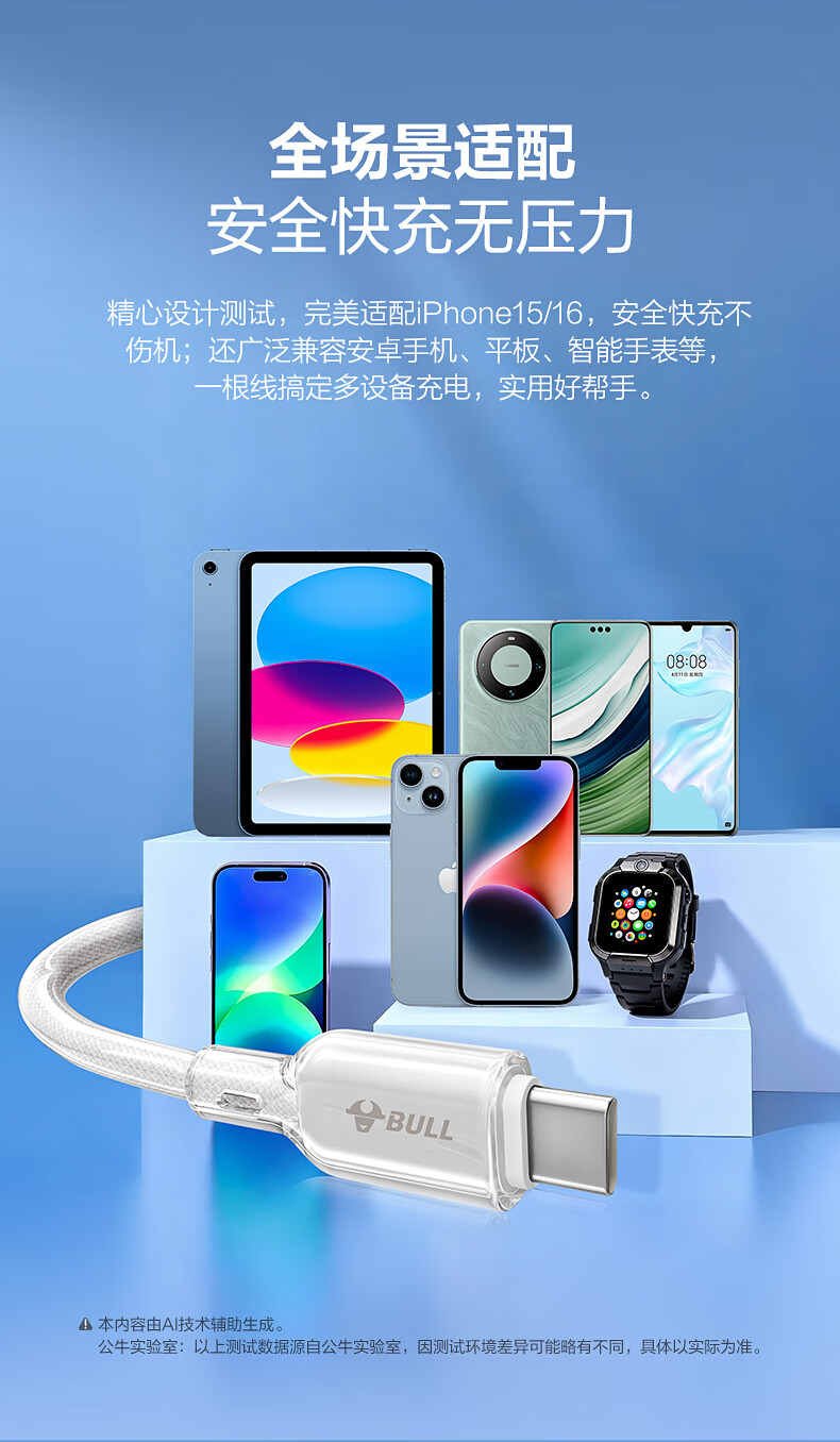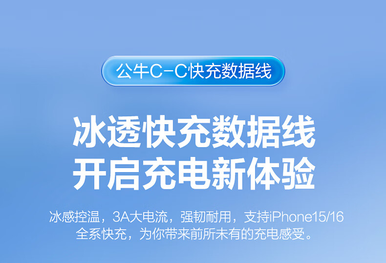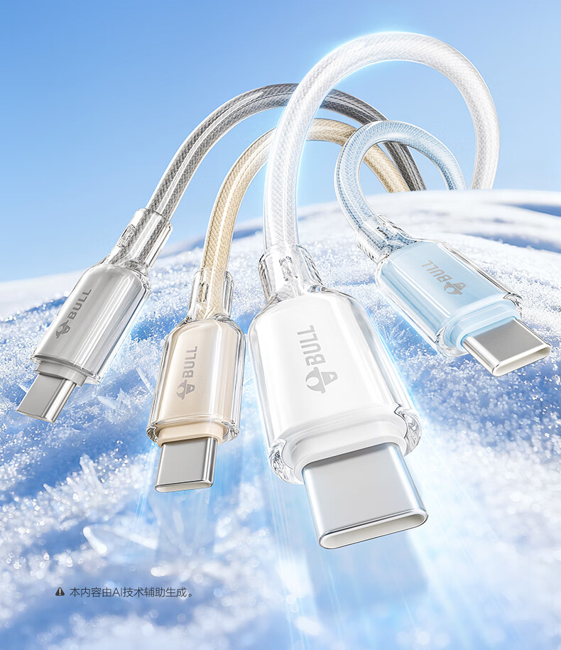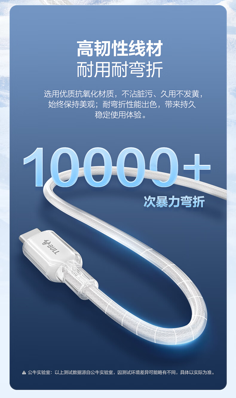 Bull (BULL) Xiaobing line type-c data cable Apple 17 charger cable iphone17promax mobile phone 16 fast charging cable suitable for Huawei Android ipad tablet computer Ice white - suitable for Apple 17-15 dynamic power adjustment