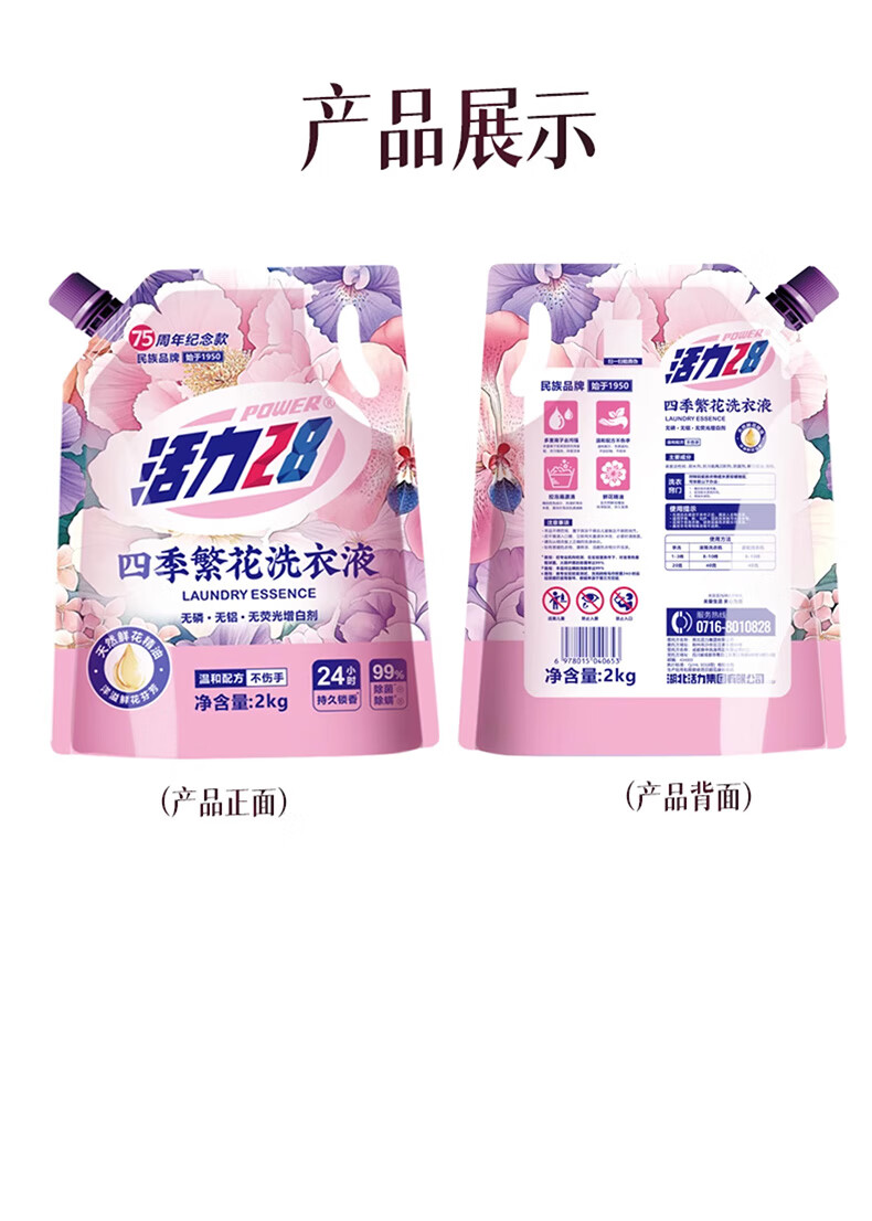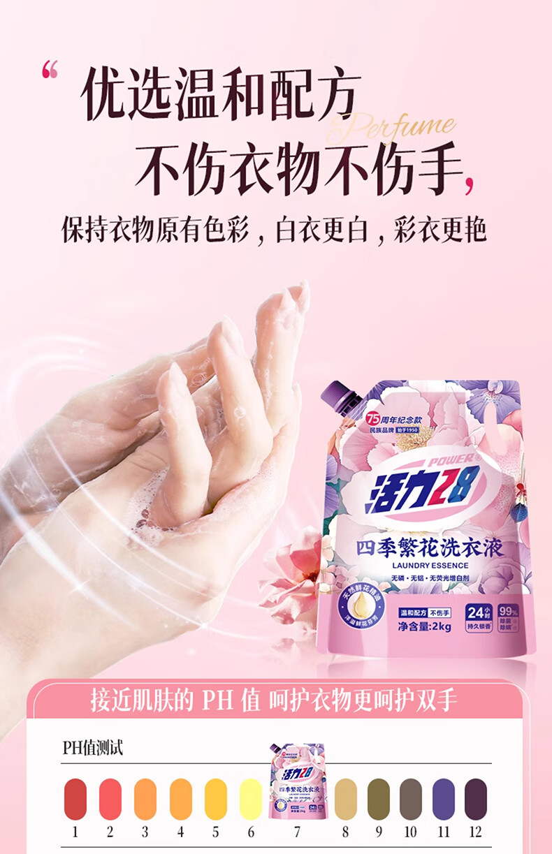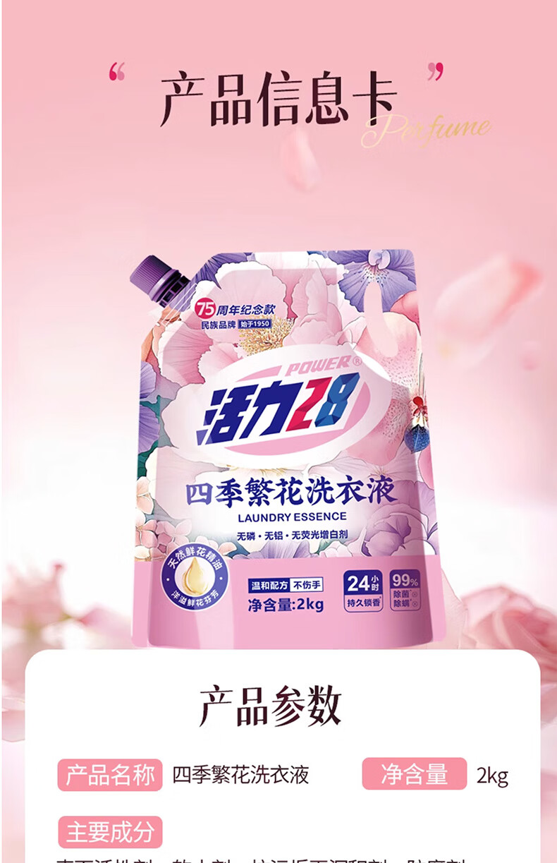 Vitality 28 Four Seasons Blossom Laundry Detergent 2kg, sterilizing and mite removing, 99% natural flower essential oil, long-lasting fragrance, efficient stain removal, 75th anniversary commemorative model, 2kg*4 bags