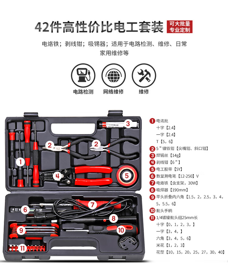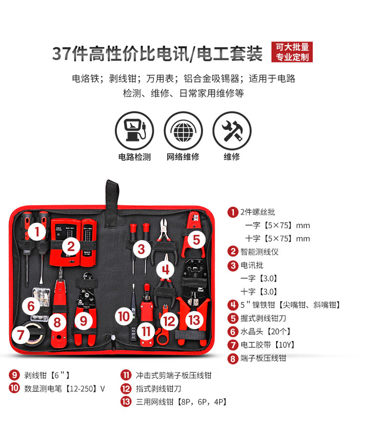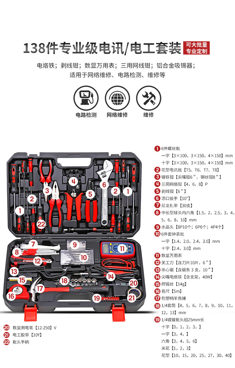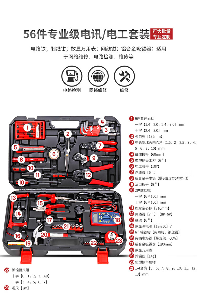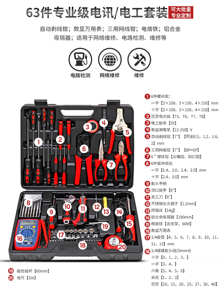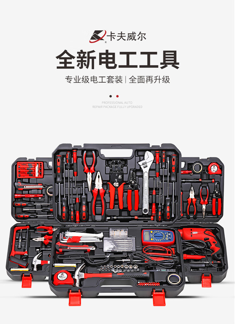 Kraftwell 63-piece telecommunications network repair kit electrician tool box set with multimeter C9003A 30-piece electrical set 72-piece set + line finder