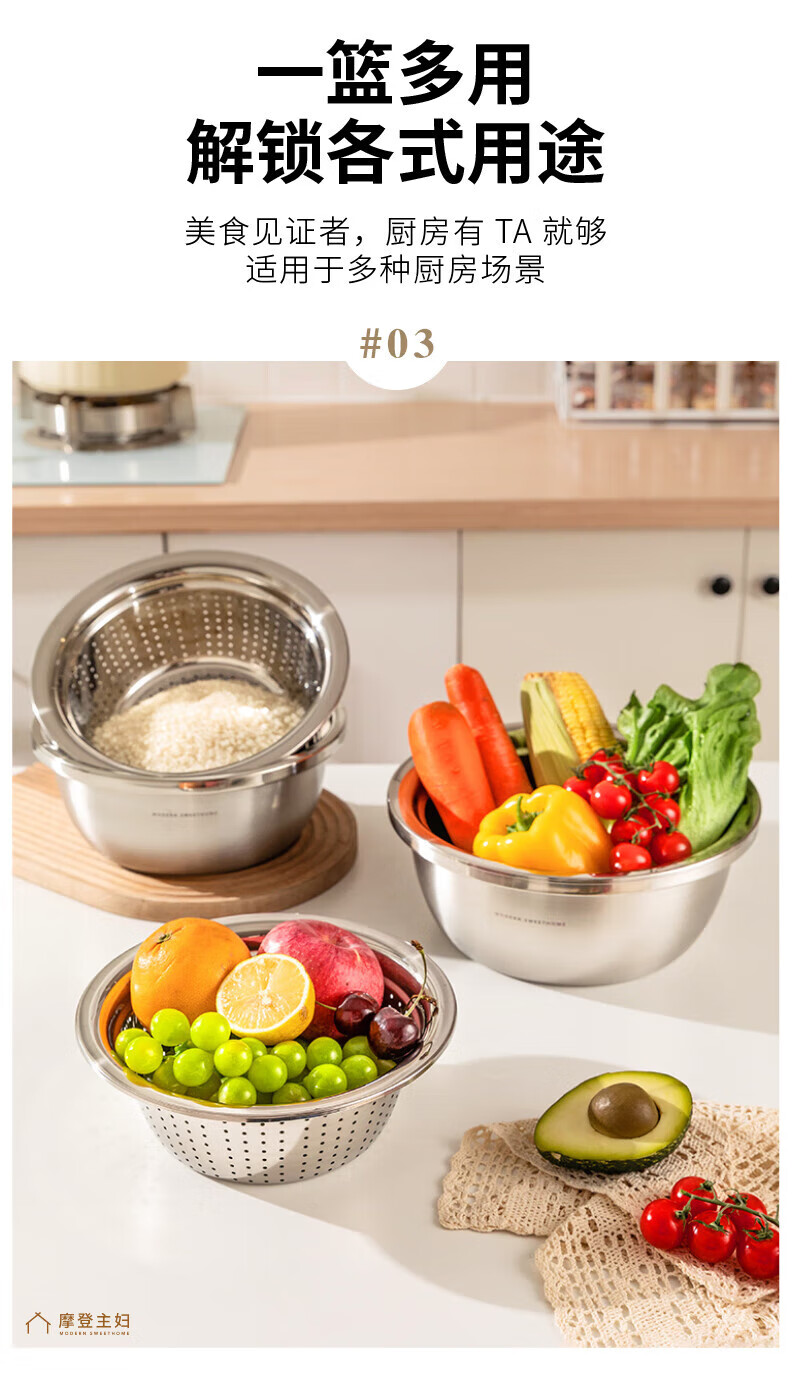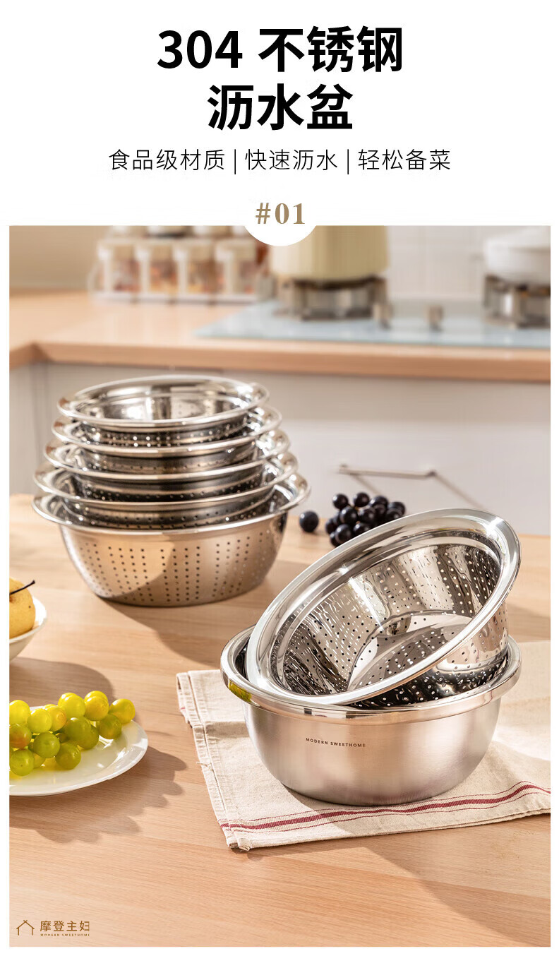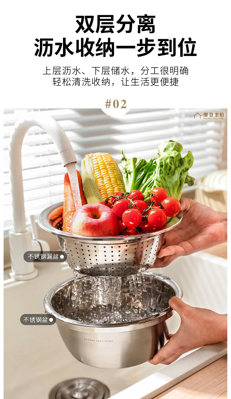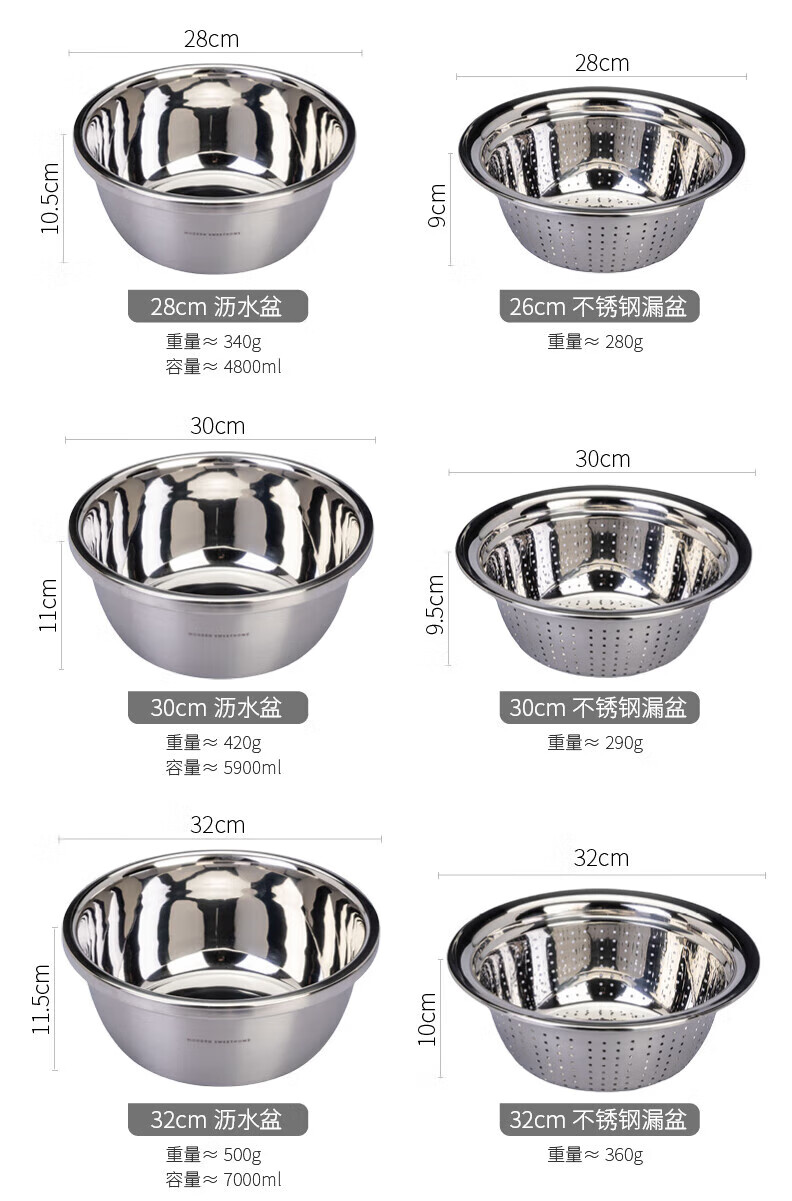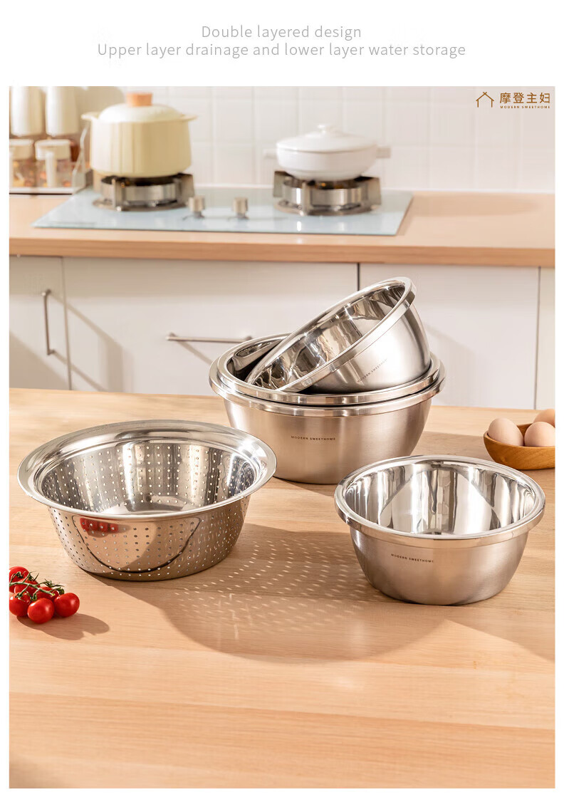 Modern Housewife Wash Basin Drain Basket 304 Stainless Steel Basin New Fruit Basket Rice Washing Artifact Washing Drainage Basket 32cm Drain Basin 304 Stainless Steel