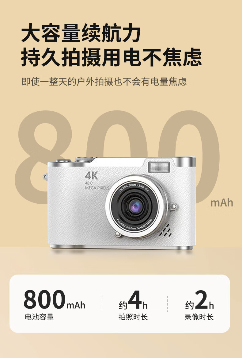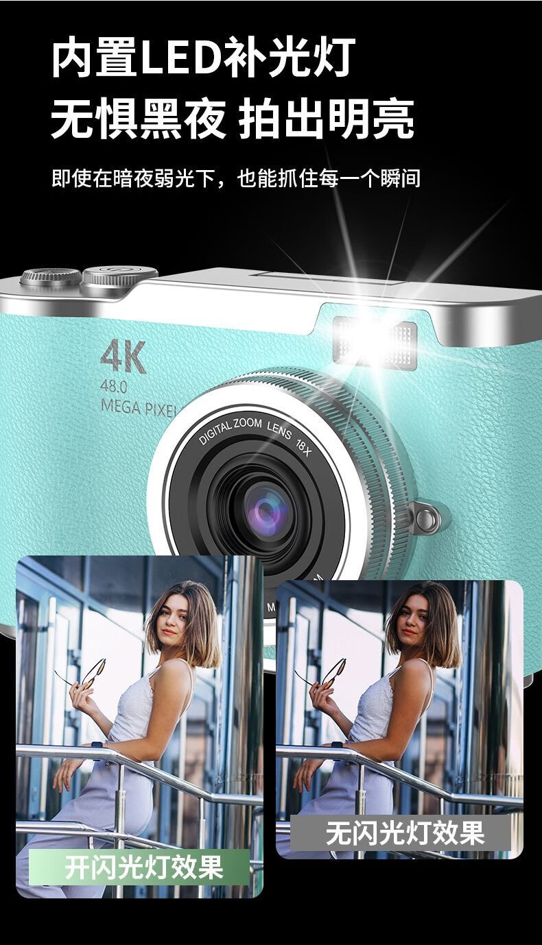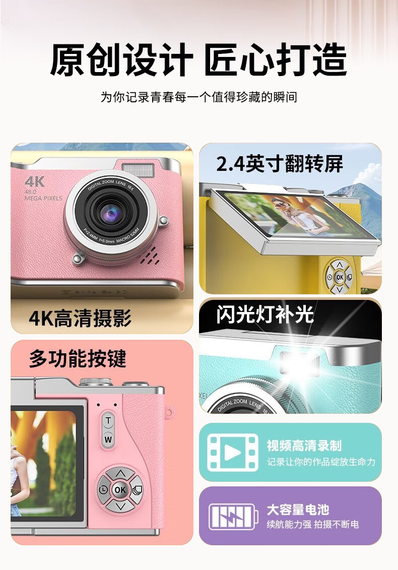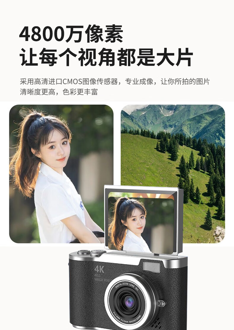 Entry-level flip-screen digital camera CCD replacement for students and high school students selfie camera travel portable high-pixel anti-shake delayed shooting birthday gift elegant white 64G memory card + card reader + adapter flip screen + 4800W pixels + flash fill light