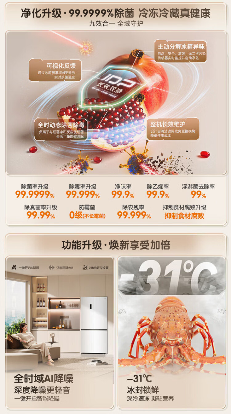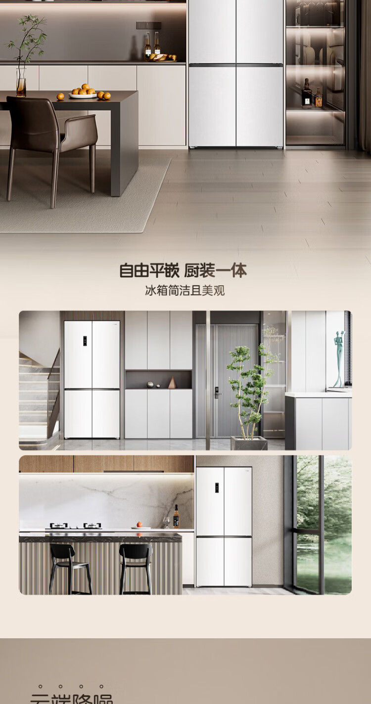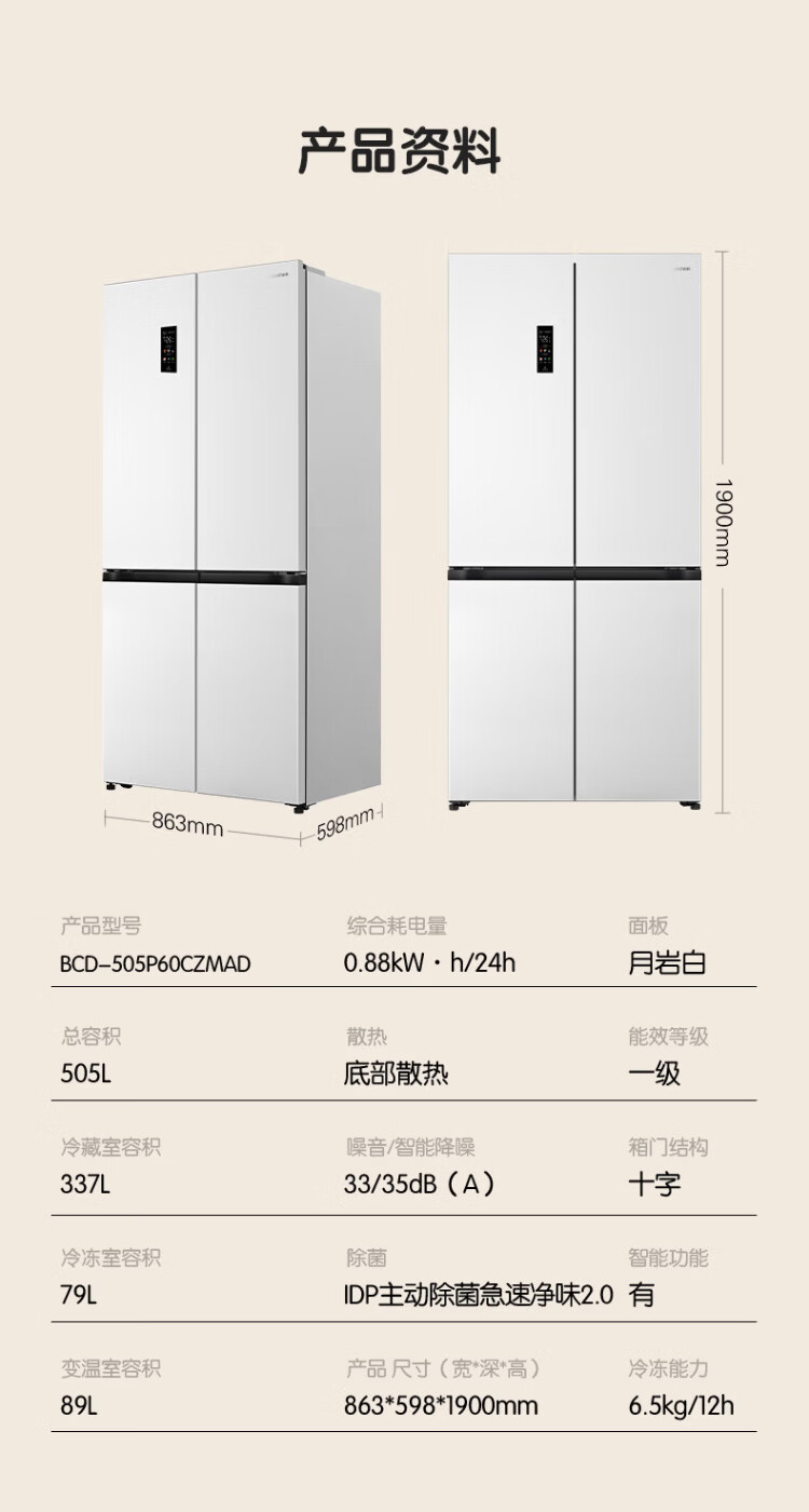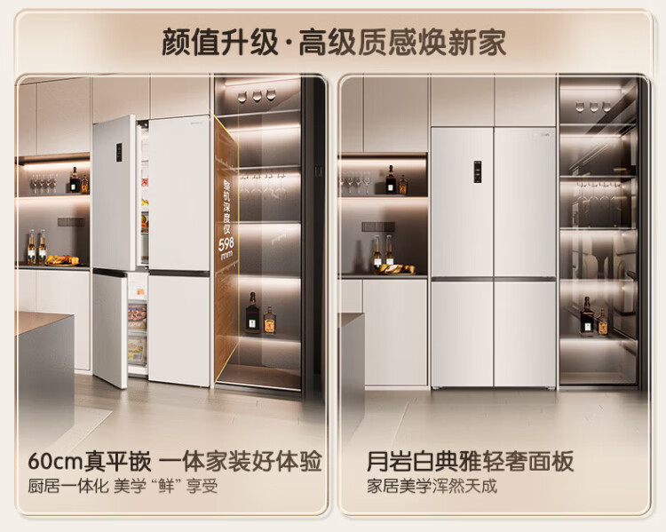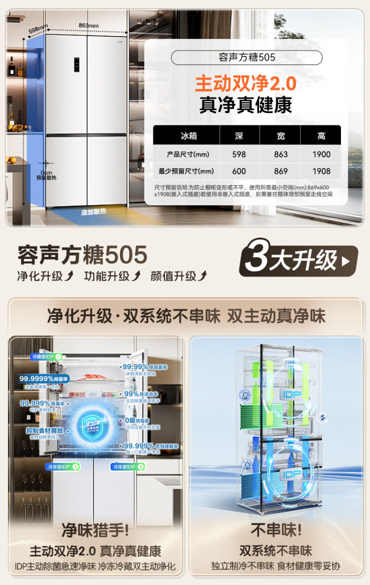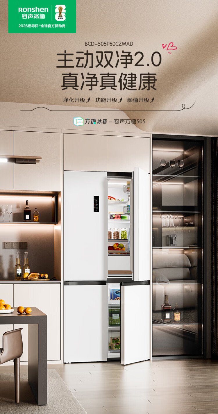 Rongsheng Cube Sugar 505L double-open four-open cross door dual-system circulation IDP active sterilization and deodorization ultra-thin zero-embedded first-class energy efficiency white refrigerator national subsidy World Cup Rongsheng Cube Sugar 505L double purification dual system white